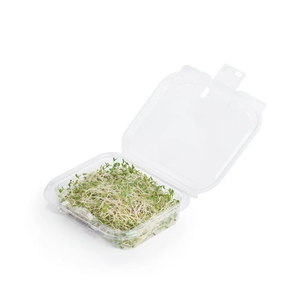 This 8 oz. clear PLA multi-purpose container, made in the USA, features a tight resealable lid with a secure safety tab. Constructed from plant-based Polylactic Acid (PLA), a compostable resin derived from corn starch, this container offers crush-resistant durability and stackable convenience. Certified compostable by BPI and CMA per ASTM D6400, it will compost within 180 days in a commercial composting facility, where accepted. Ideal for microgreens, single-serve treats, and more, this container is suitable for refrigeration and freezing. Note: PLA begins to melt at 105°F; store out of direct sunlight.