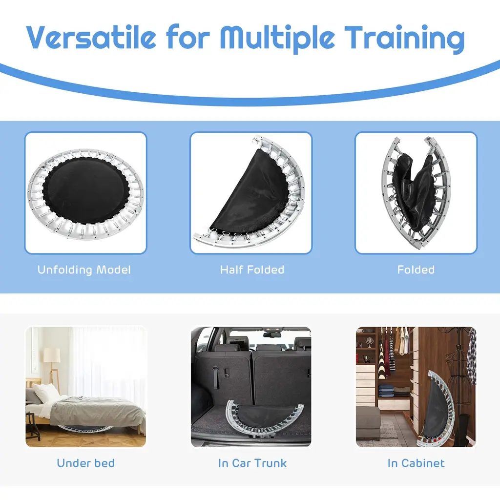 Come and enjoy great jumping experience with our folding trampoline! Our trampoline has 32 strong springs which effectively balance the whole pressure of the jumping mat evenly for longer time use. The all-round protective cover can prevent you from being scratched during bouncing. Moreover, equipped with six thick steel legs, the mini trampoline can support a weight capacity up to 330lbs, thus offer you a stable and safe jumping place. You can also carry it with you or store it in narrow spaces easily due to its foldable design which can help save space when not in use.FeatureFolding design to be a compact size which is easy to carry and store Premium jumping mat with high resilience for better bouncing feelings 32 strong springs with great solidness which withdraw the pressure evenly Screwed connection firmly joining the legs and the trampoline together Constructed with super sturdy steel frame enhancing the overall stability Equipped with 6 legs with non-slip rubber pads which guarantee your safety Protective cover for preventing you from being hurt by the springs accidentallySpecificationColor:Pink/Blue/Grey Material: PP, PVC, Iron Overall Dimension: 38''φx 7.5'' Weight Capacity: 330lbs Net Weight: 15lbs Package includes: 1 x Folding Trampoline 1 x User Guide