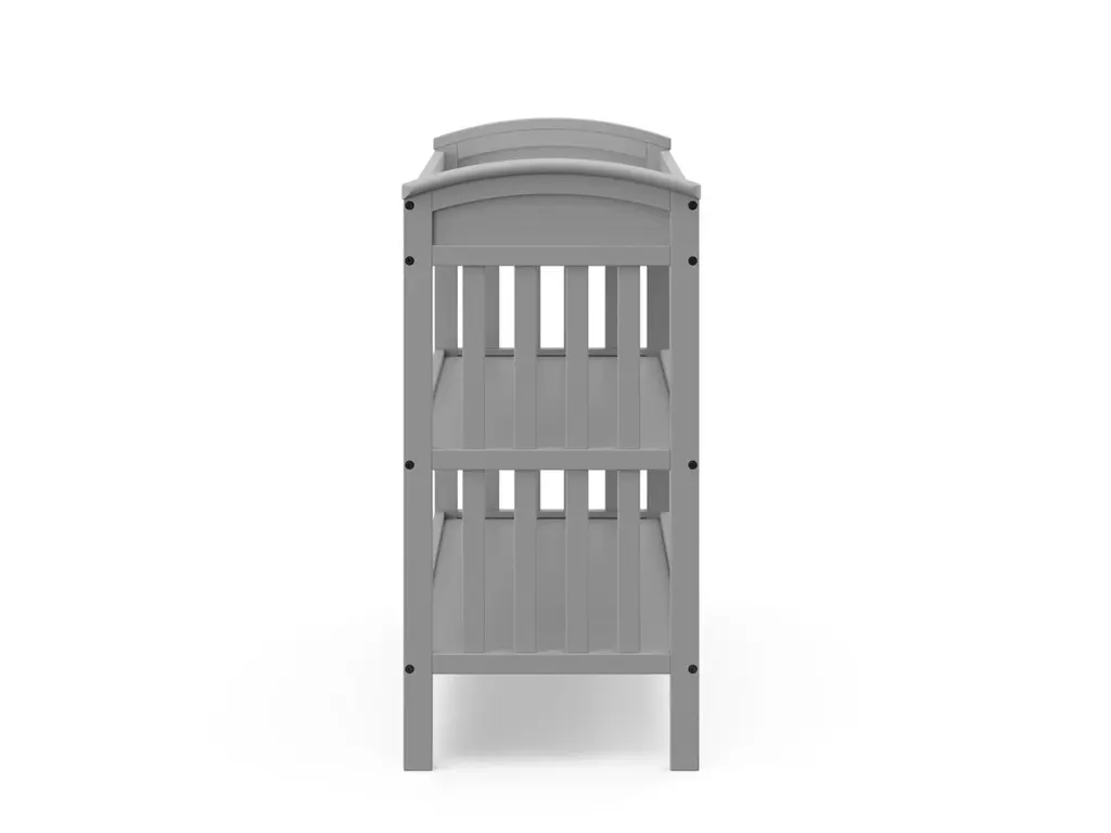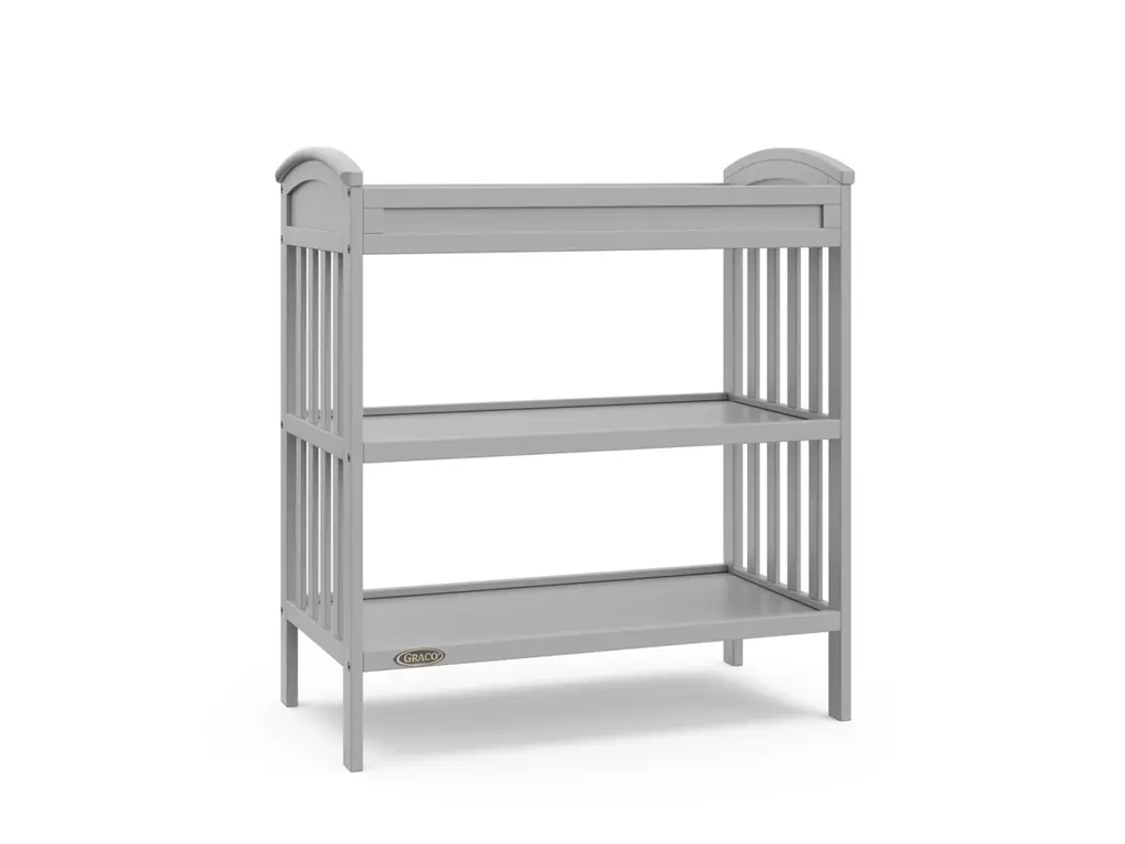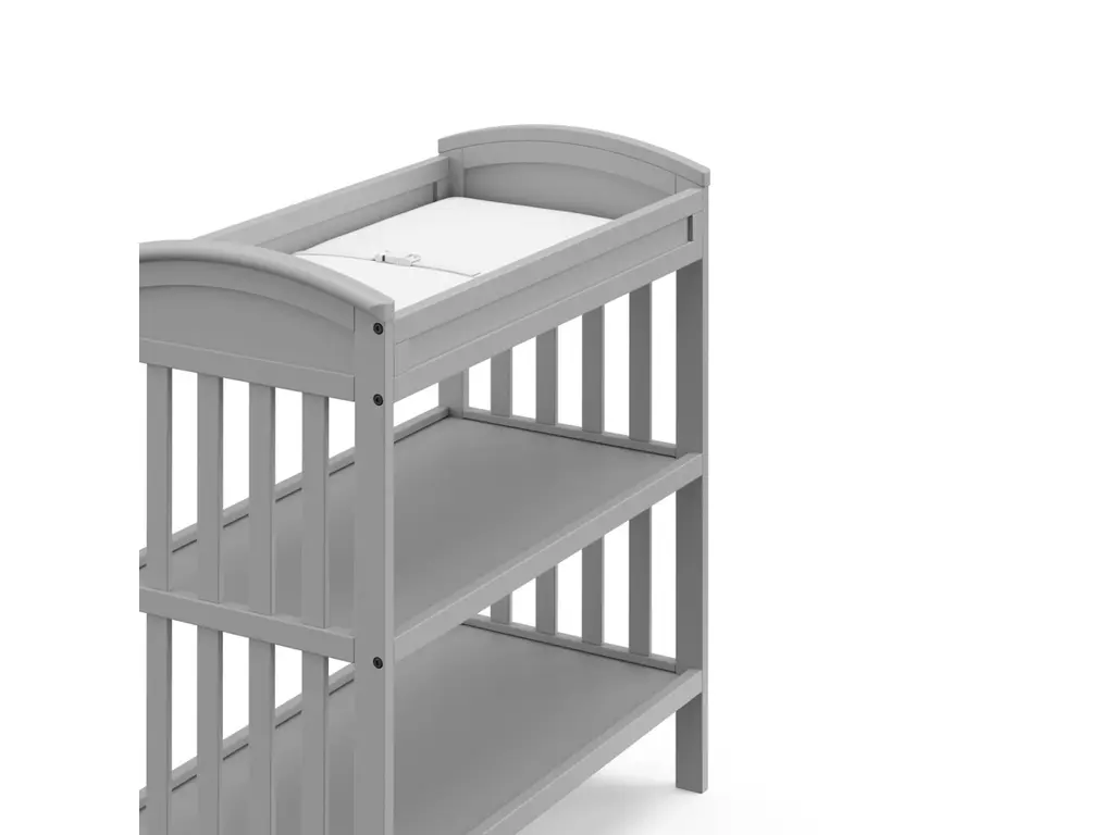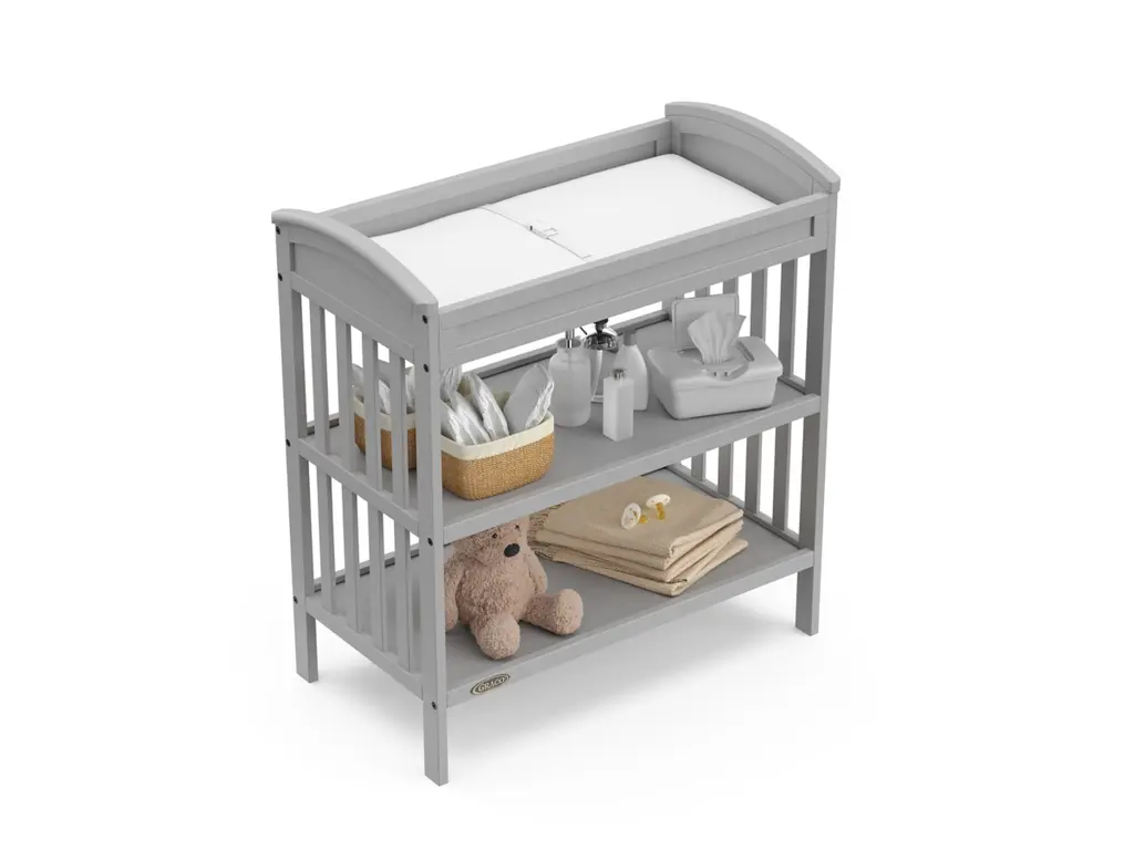 Discover the timeless elegance and ample storage of the Graco Benton Changing Table, a must-have for maintaining a beautifully organized nursery. Designed for convenience and style, this essential piece offers a dedicated space for changing your baby, paired with the practicality of keeping nursery essentials neatly arranged. Included with the Benton Changing Table is a water-resistant changing pad and a safety strap, providing both convenience and peace of mind. Boasting graceful curves and a sophisticated aesthetic, its design effortlessly complements any nursery décor. The table features two open shelves, perfect for storing bottles, diapers, lotions, and more, ensuring everything you need is within arm’s reach. Complete your Graco Benton Collection by pairing the changing table with the matching Graco Benton 6 Drawer Dresser. For a complete nursery setup, select the perfect crib to match, choosing from the Graco Benton 5-in-1 Convertible Crib, the Graco Benton 5-in-1 Convertible Crib with Drawer, or the Graco Benton 4-in-1 Convertible Crib and Changer. Each option is designed to create a cohesive and dreamy nursery environment. The Graco® Benton Changing Table is GREENGUARD Gold Certified – certified products are screened for more than 10,000 chemicals and VOCs known to pollute indoor air. The Benton Changing Table is crafted with pine wood, pine wood slats, and wood composites, and its applied finish has been tested to meet or exceed the applicable ASTM and CPSIA safety standards. Also, like all Graco® changing tables, the Bentonis JPMA Certified — meaning it’s been expert tested to meet or exceed all applicable category voluntary and mandatory safety standards. Graco® is the proud recipient of the Parent Tested Parent Approved (PTPA) Seal of Approval for nursery and children’s bedroom furniture. Backed by a 1-year limited manufacturer’s warranty. Assembly required. Changing pad included and safety strap included.