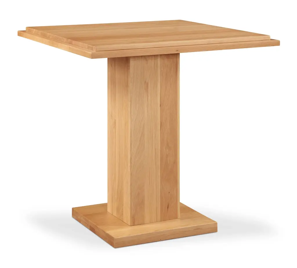 This solid oak counter table features a sculptural post leg and double square top, blending bold lines with natural warmth. Designed with angled edges for comfort, it serves beautifully as a gathering spot or a versatile accent in compact spaces.