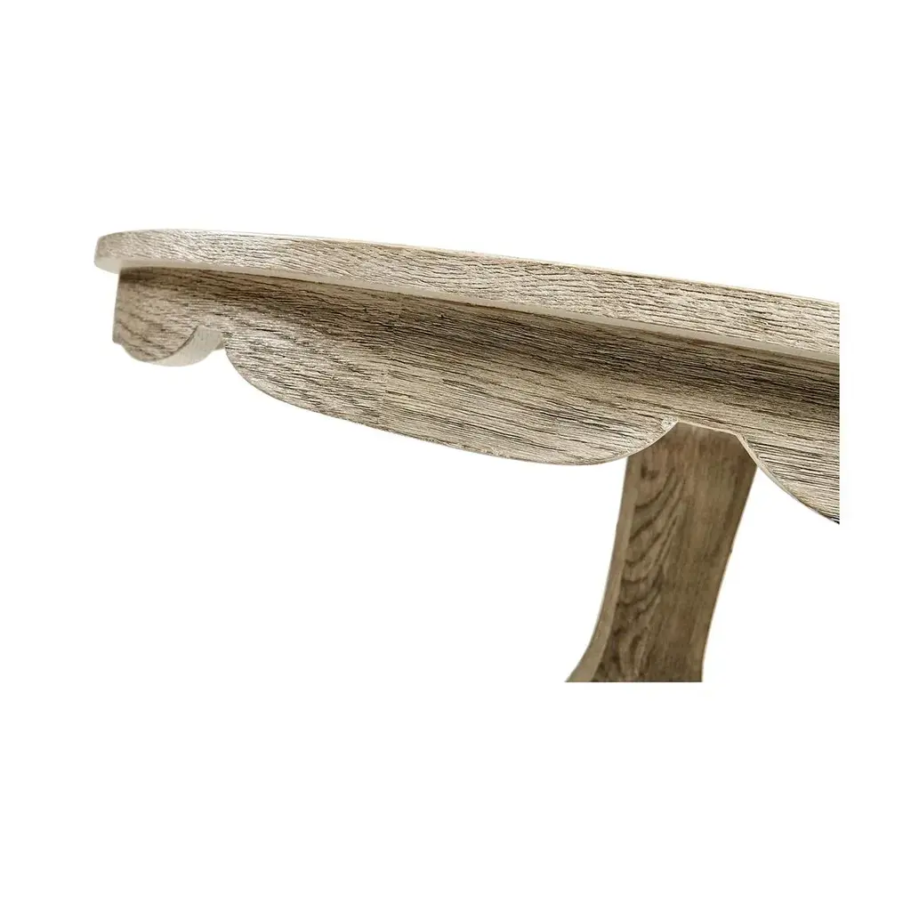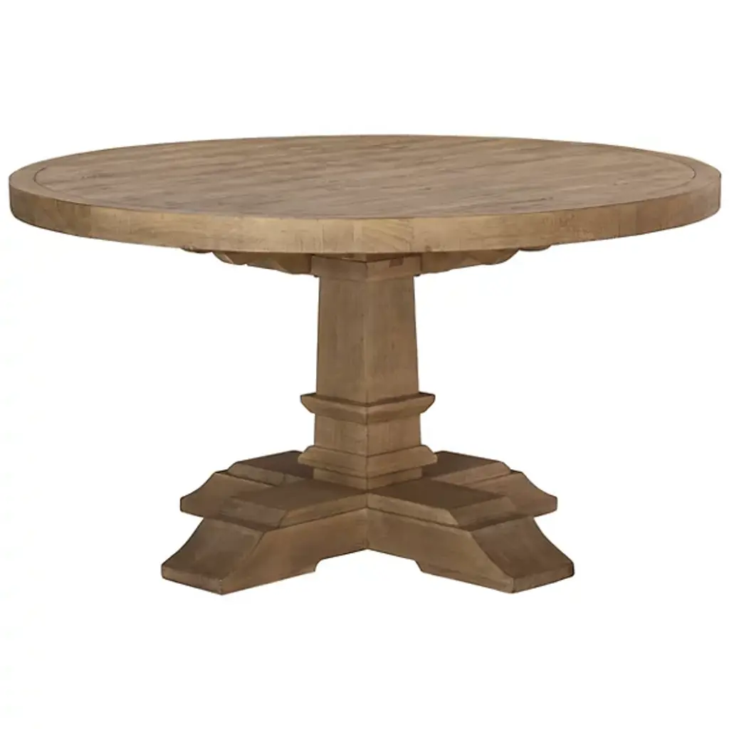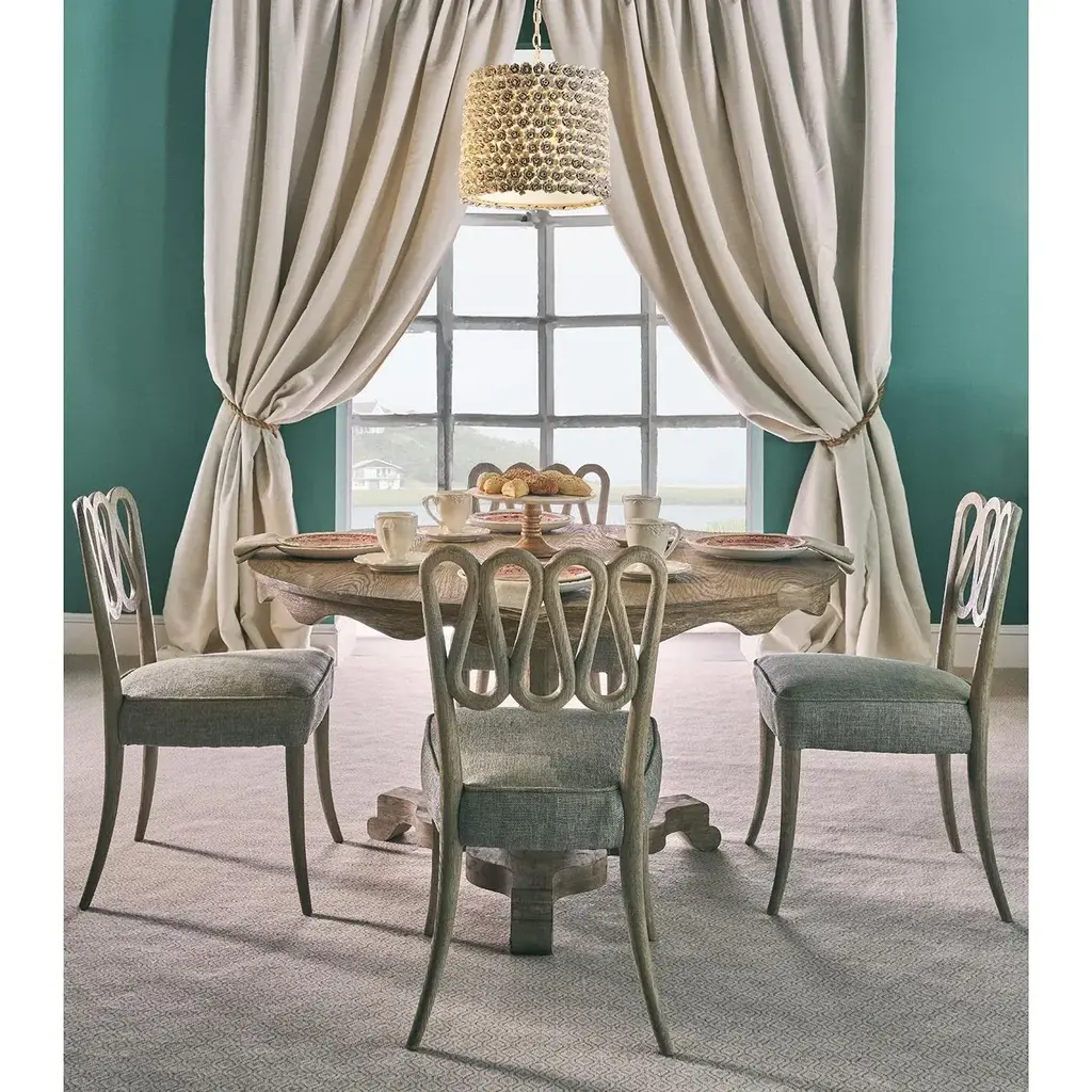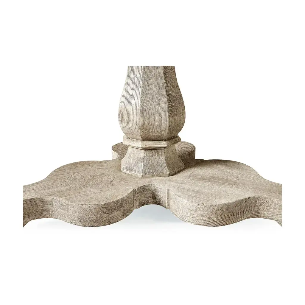 Greyed Oak center or breakfast table with a scalloped apron, on a tripartite baluster form pedestal base. Dimensions: 54" W x 54" D x 29.5" H