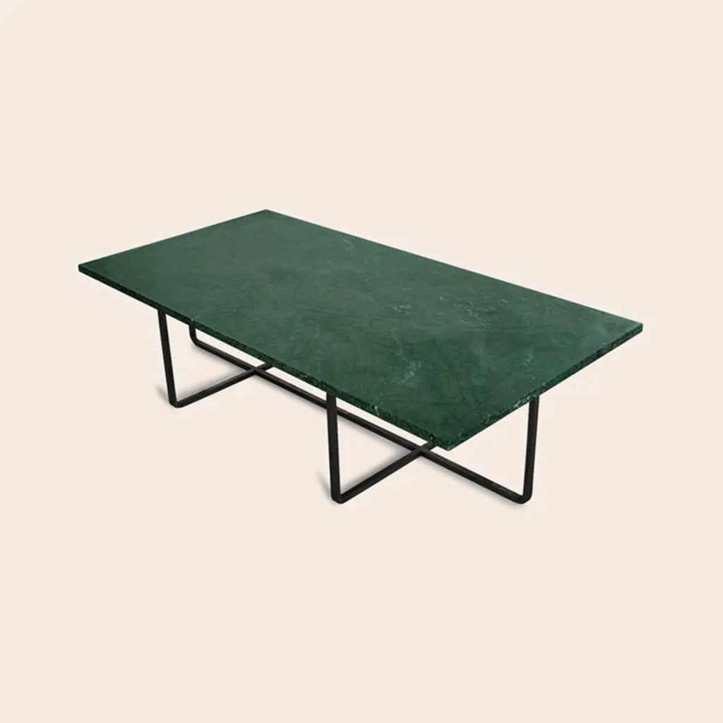 Green Indio marble and black steel large ninety table by OxDenmarqDimensions: D 120 x W 60 x H 40 cmMaterials: steel, green indio marbleAlso available: different size, top and frame options available.Ox Denmarq is a Danish design brand aspiring to make beautiful handmade furniture, accessories and lighting in natural high-quality materials in fair prices. " When we set out back in 2003, we were primarily working with vegetable-tanned saddle leather thus the name Ox was a tribute to our unique leather and the animal providing it.The other half of our name, DENMARQ, is chosen to emphasize that we are a Danish design brand based on the Danish design tradition and that most of our furniture is produced in Denmark. However, DENMARQ not only refers to our home country, but also to the co-founder and designer - Dennis Marquart.Before finishing his design studies at the Copenhagen Design University, Dennis Marquart did a Blacksmith education. This background is extremely useful when developing and designing products."Ox Denmarq handmade products will only get more beautiful as time passes and natural patina sets in.Many OX products are shaped around marble or vegetable-tanned saddle leather. Stone and leather are materials that will, and should, get marks over time. But they will also age with a very special beauty. When you learn to appreciate the beauty of maturity and of time passing, you have learned to appreciate patina the way it should be appreciated.