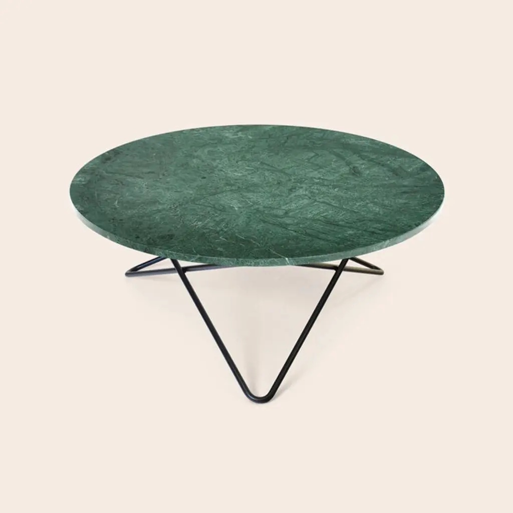 Green Indio marble and black steel large O table by OxDenmarqDimensions: D 100 x H 40 cmMaterials: Steel, Green Indio MarbleAvailable in other size. Different top and frame options available.OX DENMARQ is a Danish design brand aspiring to make beautiful handmade furniture, accessories and lighting in natural high-quality materials in fair prices. " When we set out back in 2003, we were primarily working with vegetable-tanned saddle leather thus the name OX was a tribute to our unique leather and the animal providing it.The other half of our name, DENMARQ, is chosen to emphasize that we are a Danish design brand based on the Danish design tradition and that most of our furniture is produced in Denmark. However, DENMARQ not only refers to our home country, but also to the co-founder and designer - DENnis MARQuart.Before finishing his design studies at the Copenhagen Design University, Dennis Marquart did a Blacksmith education. This background is extremely useful when developing and designing products."OX DENMARQ handmade products will only get more beautiful as time passes and natural patina sets in.Many OX products are shaped around marble or vegetable-tanned saddle leather. Stone and leather are materials that will, and should, get marks over time. But they will also age with a very special beauty. When you learn to appreciate the beauty of maturity and of time passing, you have learned to appreciate patina the way it should be appreciated.