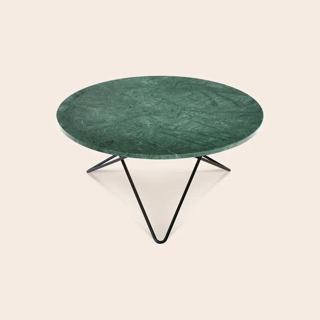 Green Indio marble and black steel "O" table by OxDenmarqDimensions: D 80 x H 40 cmMaterials: Steel, Green Indio MarbleAvailable in other size. Different top and frame options available.OX DENMARQ is a Danish design brand aspiring to make beautiful handmade furniture, accessories and lighting in natural high-quality materials in fair prices. " When we set out back in 2003, we were primarily working with vegetable-tanned saddle leather thus the name OX was a tribute to our unique leather and the animal providing it.The other half of our name, DENMARQ, is chosen to emphasize that we are a Danish design brand based on the Danish design tradition and that most of our furniture is produced in Denmark. However, DENMARQ not only refers to our home country, but also to the co-founder and designer - DENnis MARQuart.Before finishing his design studies at the Copenhagen Design University, Dennis Marquart did a Blacksmith education. This background is extremely useful when developing and designing products."OX DENMARQ handmade products will only get more beautiful as time passes and natural patina sets in.Many OX products are shaped around marble or vegetable-tanned saddle leather. Stone and leather are materials that will, and should, get marks over time. But they will also age with a very special beauty. When you learn to appreciate the beauty of maturity and of time passing, you have learned to appreciate patina the way it should be appreciated.
