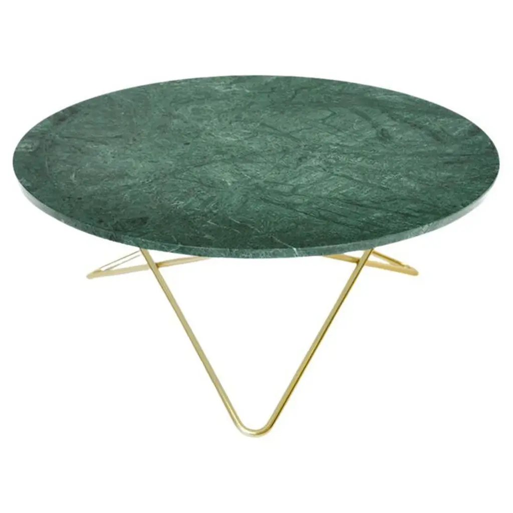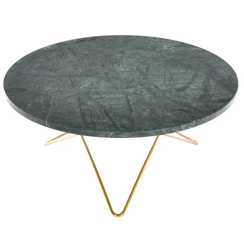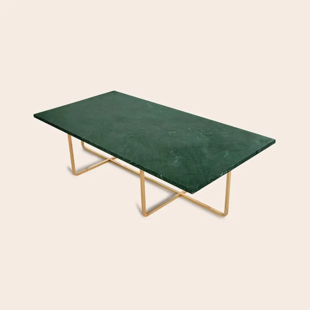 Green Indio marble and brass large ninety table by OxDenmarqDimensions: D 120 x W 60 x H 40 cmMaterials: Brass, green indio marbleAlso Available: Different size, top and frame options available.OX DENMARQ is a Danish design brand aspiring to make beautiful handmade furniture, accessories and lighting in natural high-quality materials in fair prices. " When we set out back in 2003, we were primarily working with vegetable-tanned saddle leather thus the name OX was a tribute to our unique leather and the animal providing it.The other half of our name, DENMARQ, is chosen to emphasize that we are a Danish design brand based on the Danish design tradition and that most of our furniture is produced in Denmark. However, DENMARQ not only refers to our home country, but also to the co-founder and designer - DENnis MARQuart.Before finishing his design studies at the Copenhagen Design University, Dennis Marquart did a Blacksmith education. This background is extremely useful when developing and designing products."OX DENMARQ handmade products will only get more beautiful as time passes and natural patina sets in.Many OX products are shaped around marble or vegetable-tanned saddle leather. Stone and leather are materials that will, and should, get marks over time. But they will also age with a very special beauty. When you learn to appreciate the beauty of maturity and of time passing, you have learned to appreciate patina the way it should be appreciated.