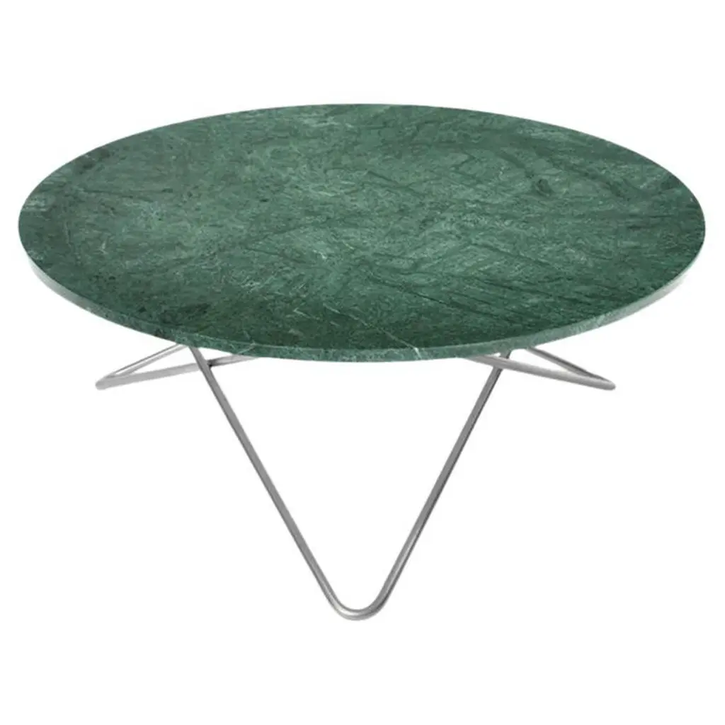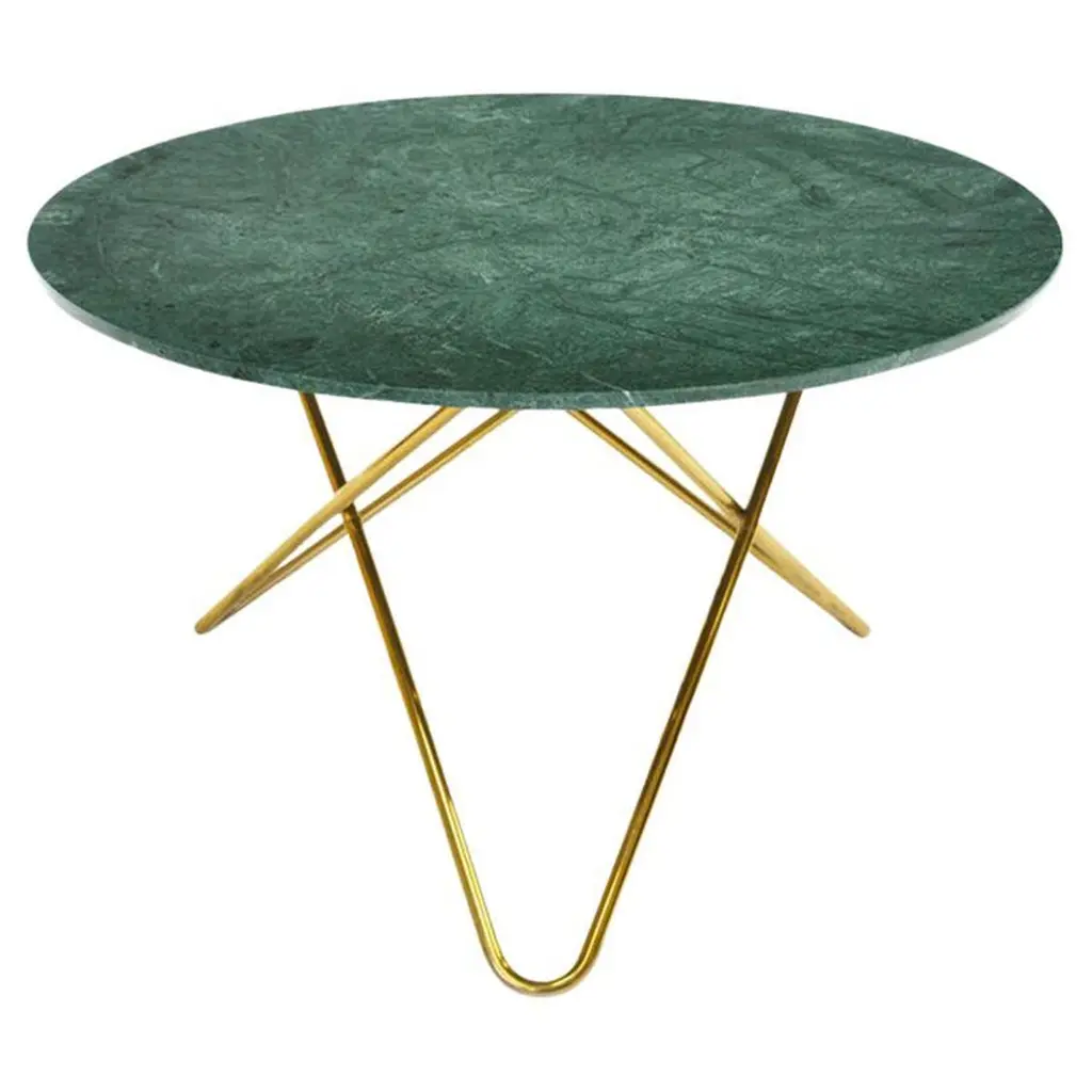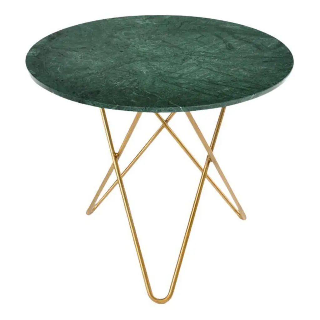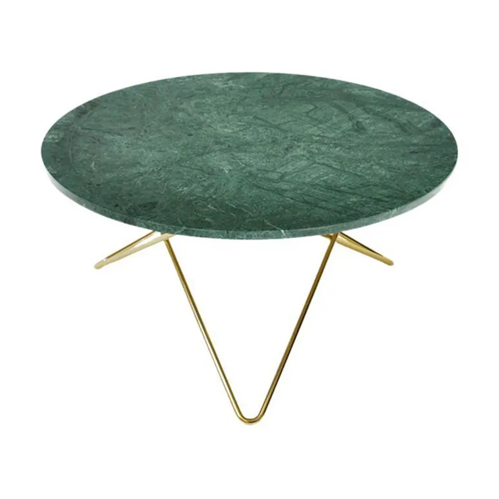 Green Indio marble and brass large ninety table by OxDenmarqDimensions: D 120 x W 60 x H 40 cmMaterials: Brass, green indio marbleAlso Available: Different size, top and frame options available.OX DENMARQ is a Danish design brand aspiring to make beautiful handmade furniture, accessories and lighting in natural high-quality materials in fair prices. " When we set out back in 2003, we were primarily working with vegetable-tanned saddle leather thus the name OX was a tribute to our unique leather and the animal providing it.The other half of our name, DENMARQ, is chosen to emphasize that we are a Danish design brand based on the Danish design tradition and that most of our furniture is produced in Denmark. However, DENMARQ not only refers to our home country, but also to the co-founder and designer - DENnis MARQuart.Before finishing his design studies at the Copenhagen Design University, Dennis Marquart did a Blacksmith education. This background is extremely useful when developing and designing products."OX DENMARQ handmade products will only get more beautiful as time passes and natural patina sets in.Many OX products are shaped around marble or vegetable-tanned saddle leather. Stone and leather are materials that will, and should, get marks over time. But they will also age with a very special beauty. When you learn to appreciate the beauty of maturity and of time passing, you have learned to appreciate patina the way it should be appreciated.