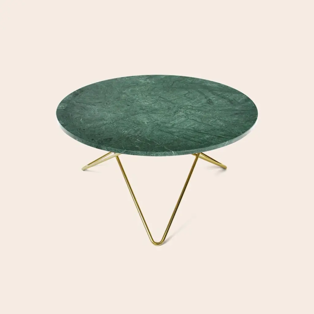 Green Indio marble and brass "O" table by OxDenmarqDimensions: D 80 x H 40 cmMaterials: Brass, Green Indio MarbleAvailable in other size. Different top and frame options availableOX DENMARQ is a Danish design brand aspiring to make beautiful handmade furniture, accessories and lighting in natural high-quality materials in fair prices. " When we set out back in 2003, we were primarily working with vegetable-tanned saddle leather thus the name OX was a tribute to our unique leather and the animal providing it.The other half of our name, DENMARQ, is chosen to emphasize that we are a Danish design brand based on the Danish design tradition and that most of our furniture is produced in Denmark. However, DENMARQ not only refers to our home country, but also to the co-founder and designer - DENnis MARQuart.Before finishing his design studies at the Copenhagen Design University, Dennis Marquart did a Blacksmith education. This background is extremely useful when developing and designing products."OX DENMARQ handmade products will only get more beautiful as time passes and natural patina sets in.Many OX products are shaped around marble or vegetable-tanned saddle leather. Stone and leather are materials that will, and should, get marks over time. But they will also age with a very special beauty. When you learn to appreciate the beauty of maturity and of time passing, you have learned to appreciate patina the way it should be appreciated.