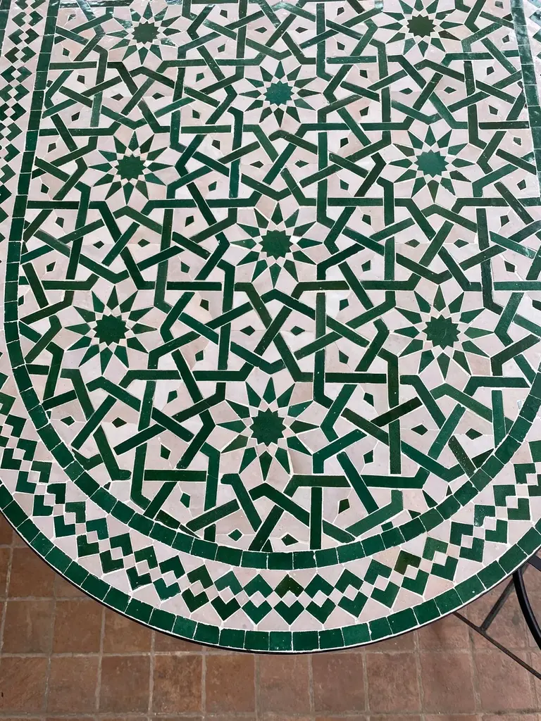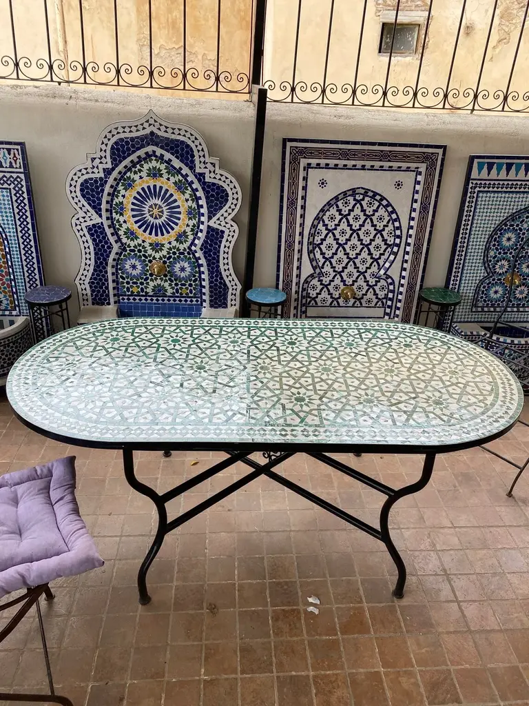 Moroccan mosaic tile handmade ceramic table is a unique piece geometric patterns Inspired by Andalusia Berber'. It'm furniture that is sure to add a touch of artisanal charm to any space. These tables are made with individual ceramic tiles that are arranged in a mosaic pattern by hand, creating a truly special and personal piece, mosaic tile handmade ceramic table truly unique. Not only are these tables visually stunning, but they are also highly functional and durable. The ceramic tiles are resistant to moisture and wear, making them suitable for use in a variety of settings, including outdoor patios and kitchens. In addition to their practical qualities, mosaic tile handmade ceramic tables also bring a sense of warmth and comfort to a space. The intricate patterns and colorful tiles create a welcoming atmosphere that is perfect for entertaining guests or simply relaxing at home. Overall, a mosaic tile handmade ceramic table is a beautiful and practical choice for any home. Its handmade nature and durable materials make it a truly special and treasured piece it costum made it took less than 2 weeks, and we use fast shipping