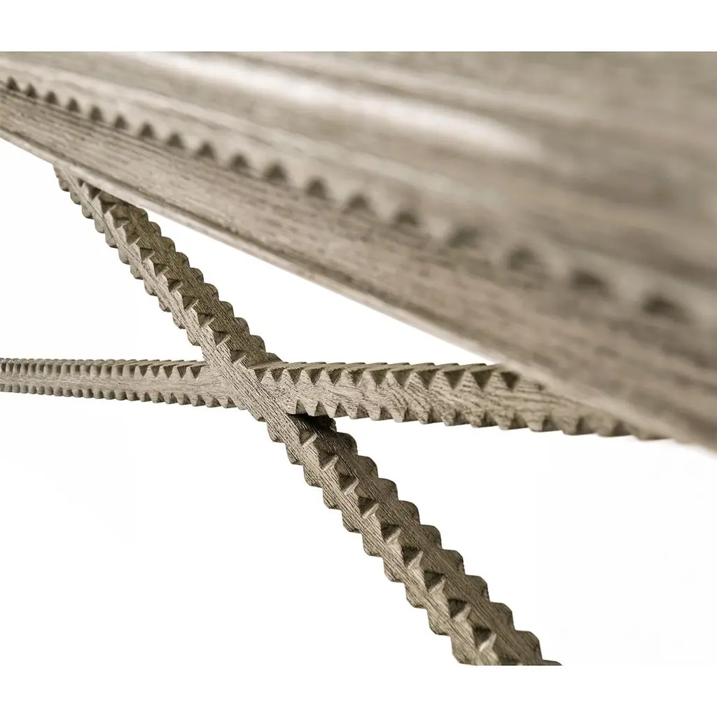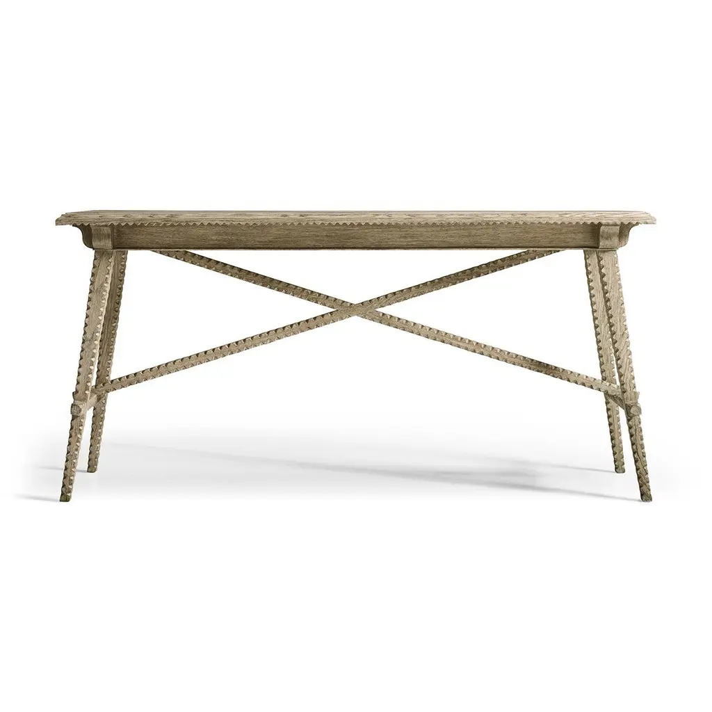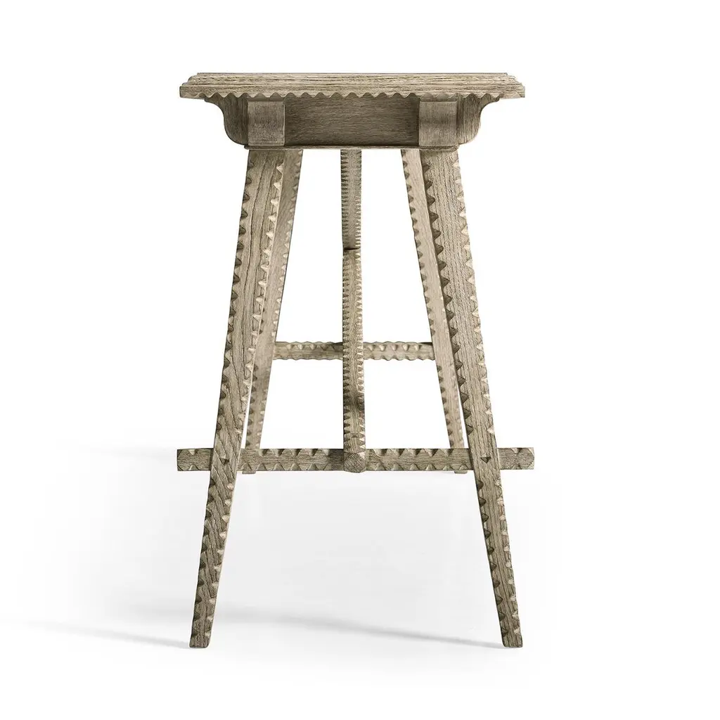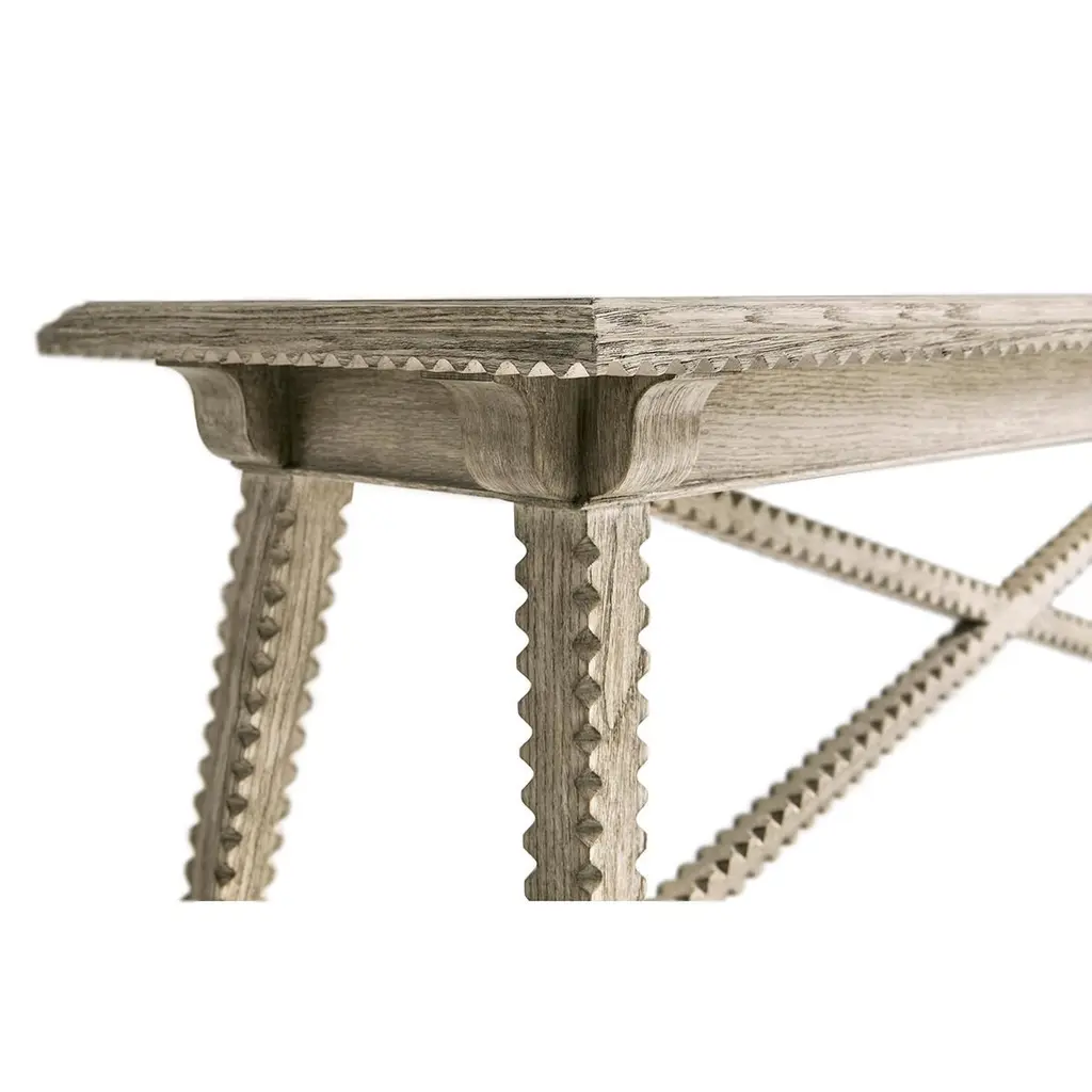 Featuring tramp-style carvings that add a touch of artisanal detail, this table showcases a greyed oak finish for a relaxed, airy feel. Its finely detailed legs and subtle cross-stretcher design enhance its rustic appeal, making it an exquisite addition to any refined living space. The light, versatile design seamlessly complements a variety of interiors, whether placed beside a luxurious sofa or as a stand-alone statement piece.Handcrafted from premium oak, this table balances durability with aesthetic charm. Its thoughtfully carved edges add a sense of heritage and tradition while maintaining a contemporary edge. Dimensions: 62" W x 18" D x 30" H