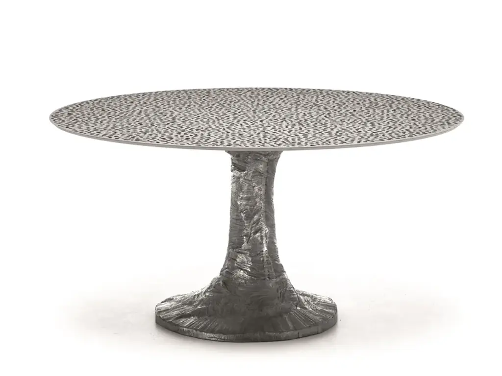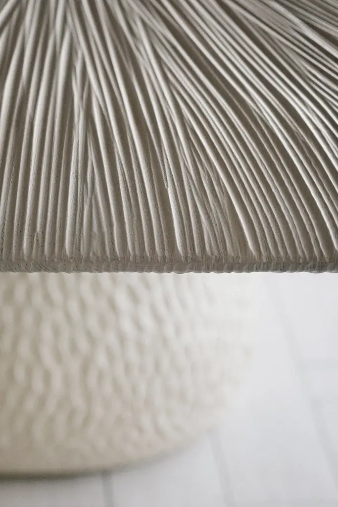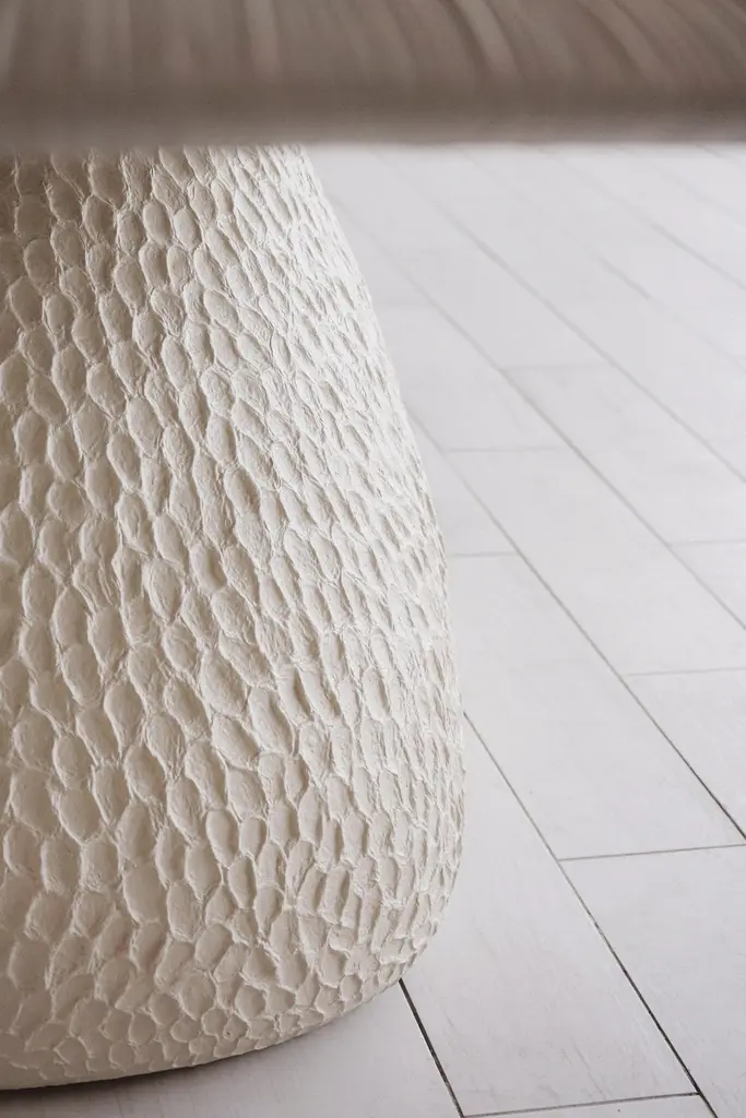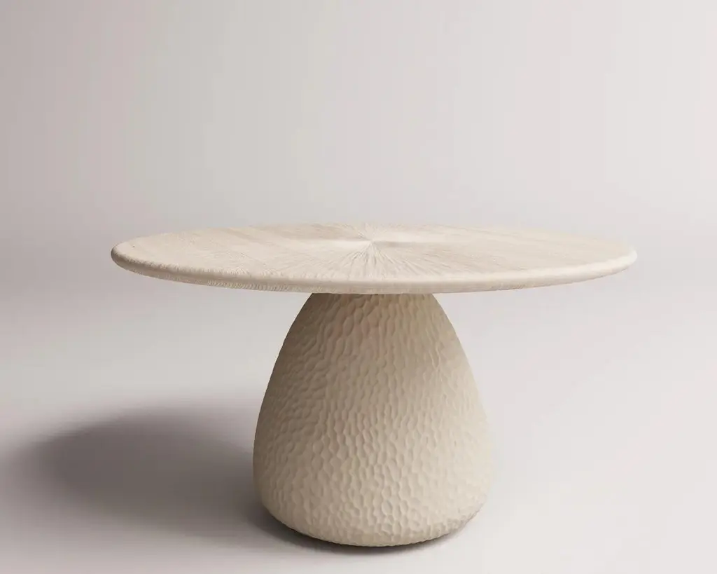 Grun’ Table by FainaDesign: Victoriya YakushaMaterial: Ztista, wood.Dimensions: D 150 x H 76 cmThe table is designed with a base crafted from the signature eco-friendly material ZTISTA, echoing the gentle contours of hills.Its handcrafted wooden tabletop presents a textured surface inspired by the natural forms of forest mushrooms and tree bark, providing a rich visual and tactile experience.The collection captures the essence of "living minimalism" by integrating nature, traditional craftsmanship, and contemporary design. The unique geometry of each piece mirrors its natural origins, with grounded bases symbolizing the earth's connection, while the rising forms suggest growth and progress.Yakusha is a multidisciplinary studio founded by Ukrainian architect, designer, and artist Victoria Yakusha in 2006. The studio works within the fields of architecture, interiors, creative direction, and a brand of furniture and decor FAINA, rooted in Ukrainian cultural heritage.The studio’s philosophy of live design invites one to go inward by interacting with millennia-old techniques, customs, and primal materials. Laconic, yet spirited; deeply connected to nature, live design eliminates the excess and guides back to the essence. Ancestral relationships with nature — a focal point of live design philosophy, reflects in the studio's sustainable approach to creation and construction. We feel Earth, we respect Earth. Interiors and architecture by Yakusha fuse the past with the future, heritage with a modern vision of design.Founded after the Revolution of Dignity in 2014, FAINA collections evoke ancient symbols and revive ancient crafts thus passing on cultural history and forming the language of contemporary Ukrainian design. In 2021, FAINA wins the Dezeen Awards Public Vote as Emerging Design Studio of the Year, whilst Istetyka interior by Yakusha becomes the first Ukrainian project to win Dezeen Awards in the Bars & Restaurants category.