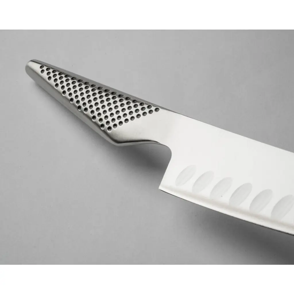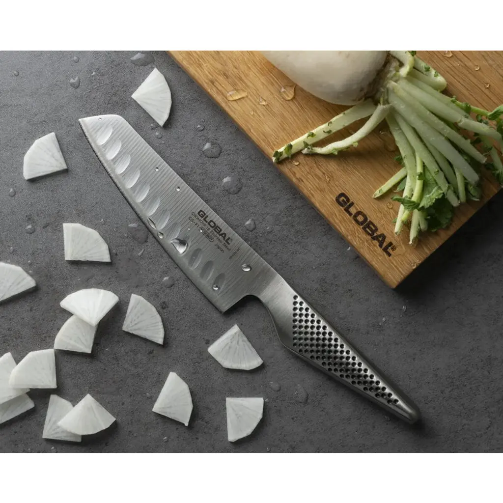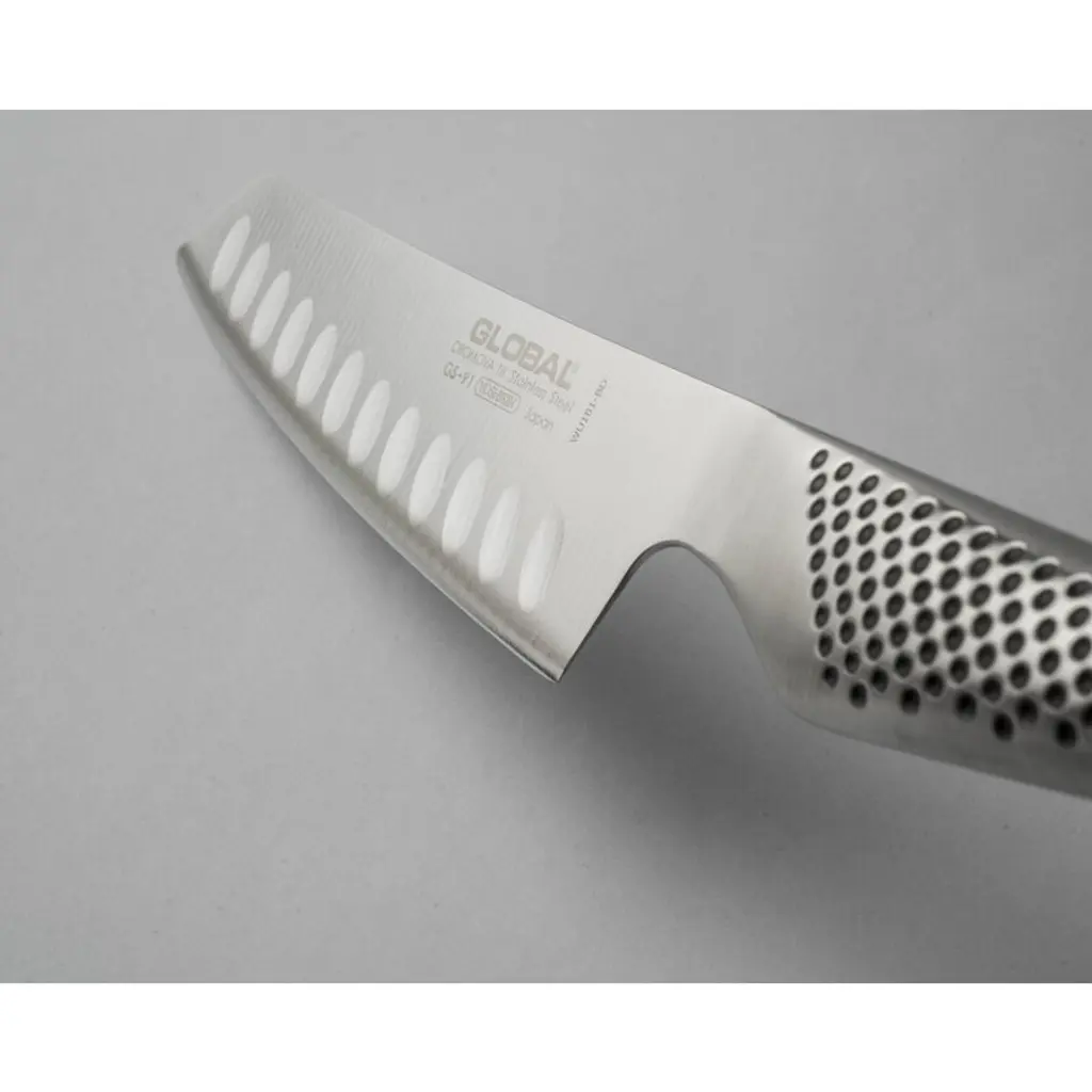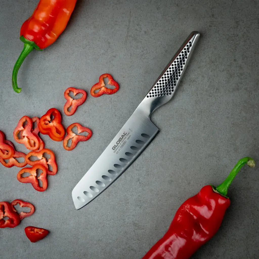 The Global G-91 vegetable knife, inspired by Japanese Usaba knives, has a gently curved blade that is perfect for chopping and slicing smaller vegetables. The blade features a fluted finish – small, oval-shaped indentations along the surface – that helps prevent food from sticking and makes cutting smoother and more efficient. Crafted from all-stainless steel, the knife features a one-piece seamless construction that makes it exceptionally hygienic and easy to clean. The signature dotted handle is filled with sand to ensure a perfectly balanced grip. Designed by Komin Yamada, the knife performs brilliantly in both home kitchens and professional settings. Each Global knife is handcrafted in Japan, drawing on the tradition of samurai sword making. Forged from Cromova 18 – a high-grade, high-hardness stainless steel developed exclusively for Global – the blade offers excellent resistance to rust and corrosion. Thanks to its steep, acute cutting angle, the edge stays sharper for longer, delivering performance that surpasses conventional kitchen knives.