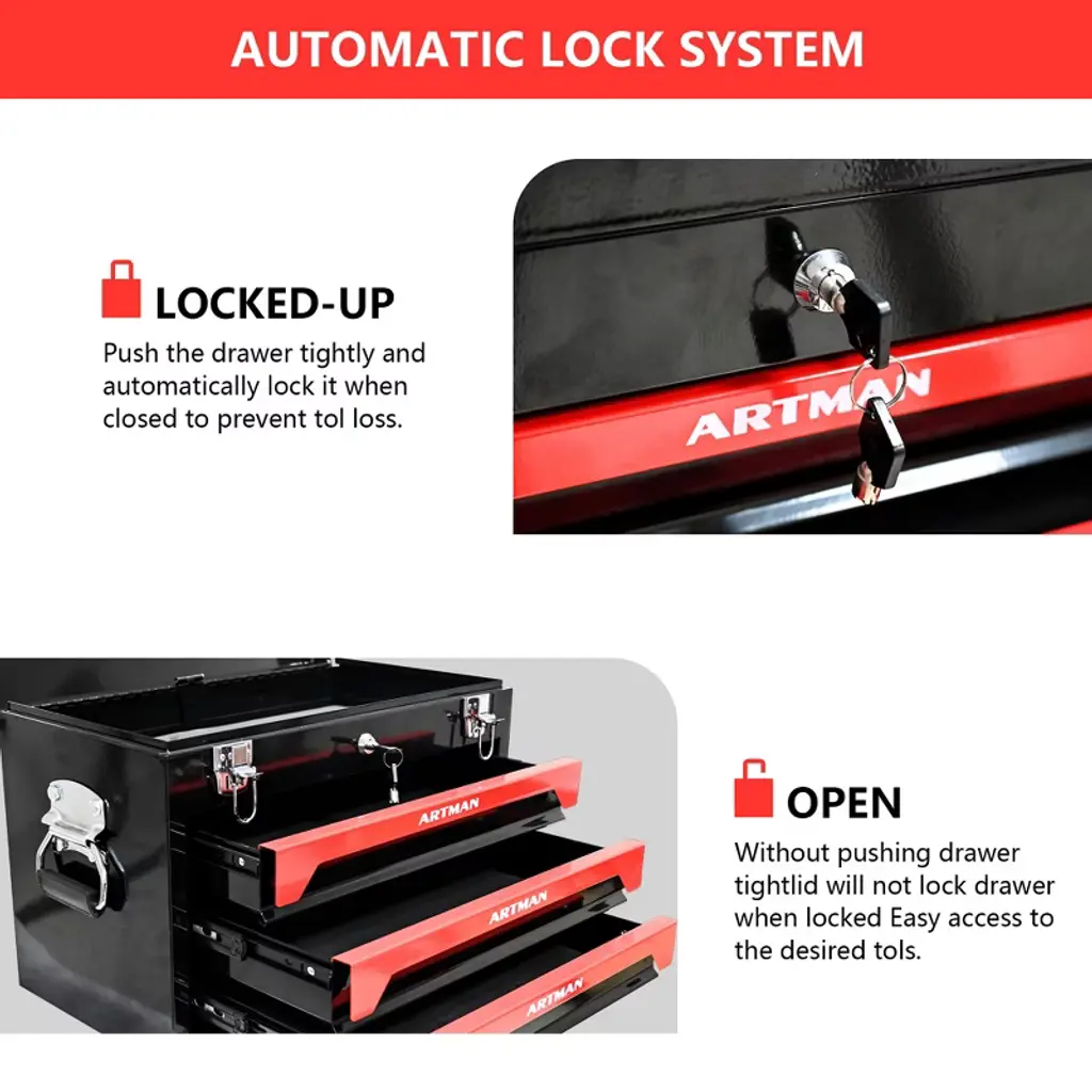 The 20" Portable 3 Drawer Steel Tool Box with Metal Latch Closure is the ideal storage solution for your tools, combining practicality and style in a sleek black and red design. This toolbox features three spacious drawers, providing organized storage for all your essential tools, while the metal latch closure ensures your tools are secure and protected. Its durable steel construction guarantees long-lasting use, making it perfect for home, garage, or workshop environments. With a convenient carrying handle, you can easily transport your tools wherever you need them. Elevate your tool organization with this versatile and reliable toolbox, designed to meet all your maintenance needs.
