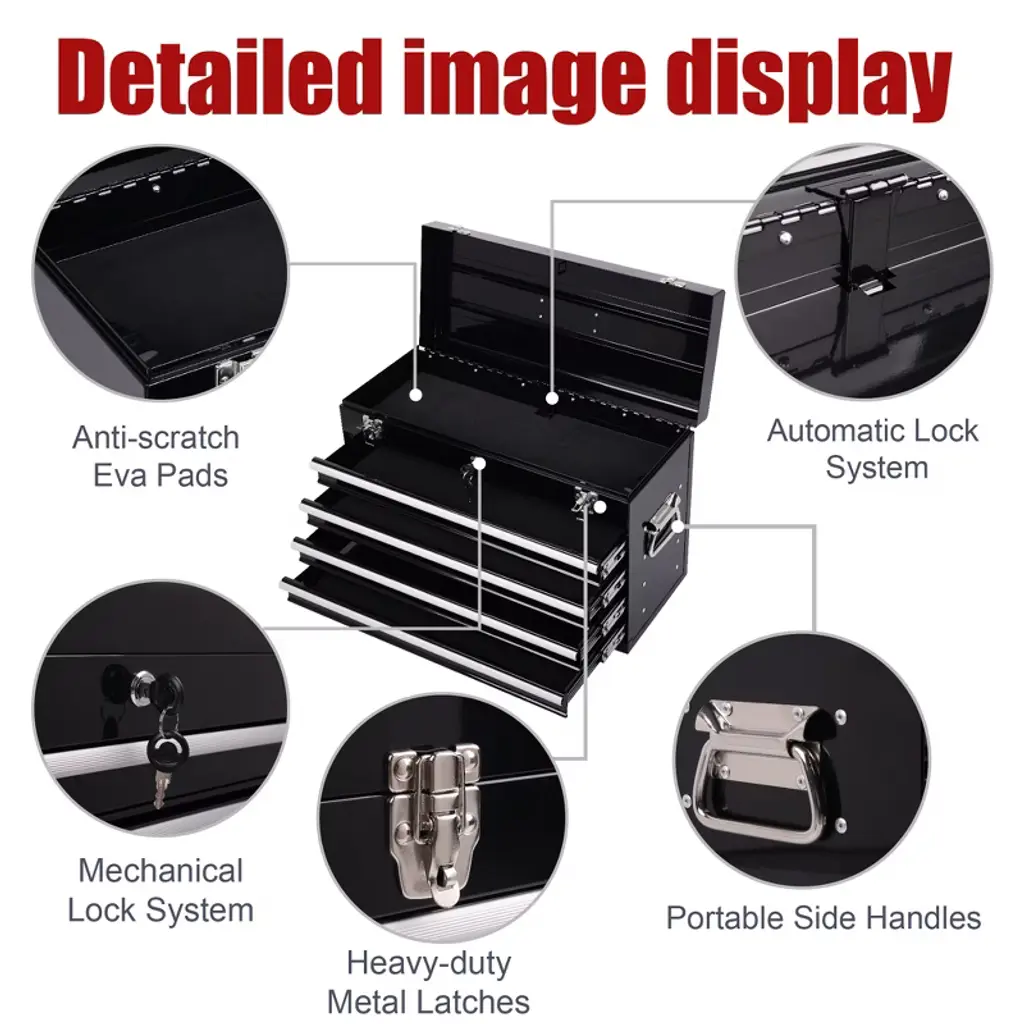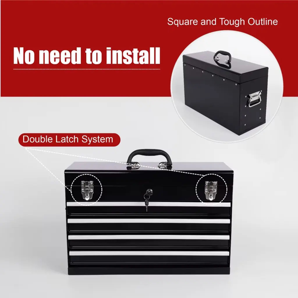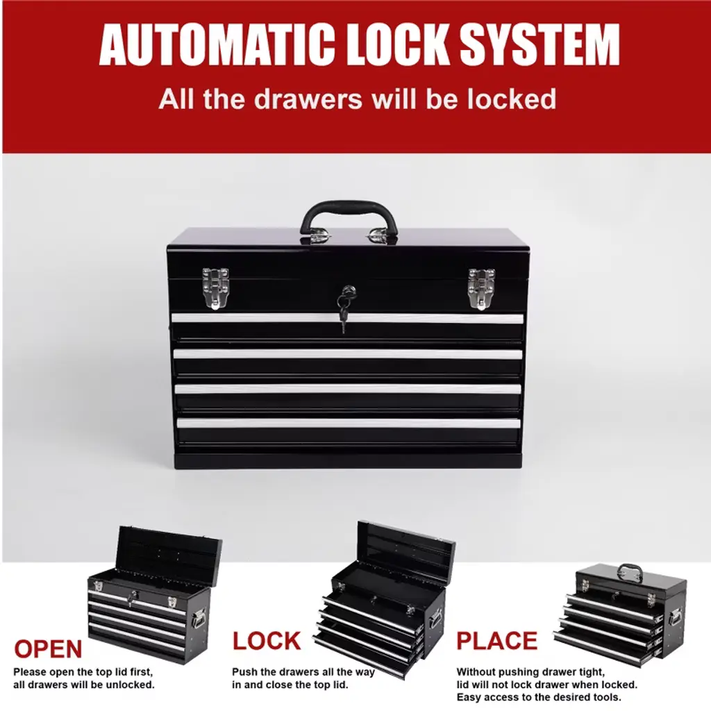 This 21" portable metal tool box offers generous storage with 1 top box and 4 drawers, ideal for on-site work or vehicle storage. Its auto-locking system secures tools when the top lid is closed, with an extra lock hole for added safety. Drawers glide smoothly on dual ball-bearing tracks, and EVA padding protects tools from damage. Built with heavy-duty steel, a rust-resistant finish, and a convenient handle, it's durable, easy to carry, and designed for hassle-free use in tough environments.