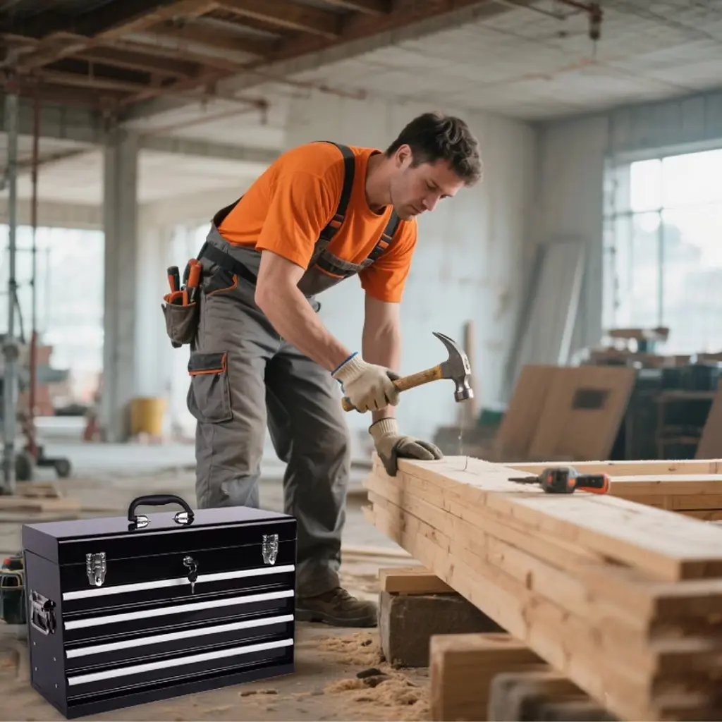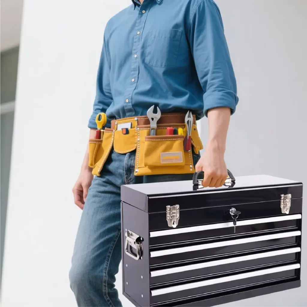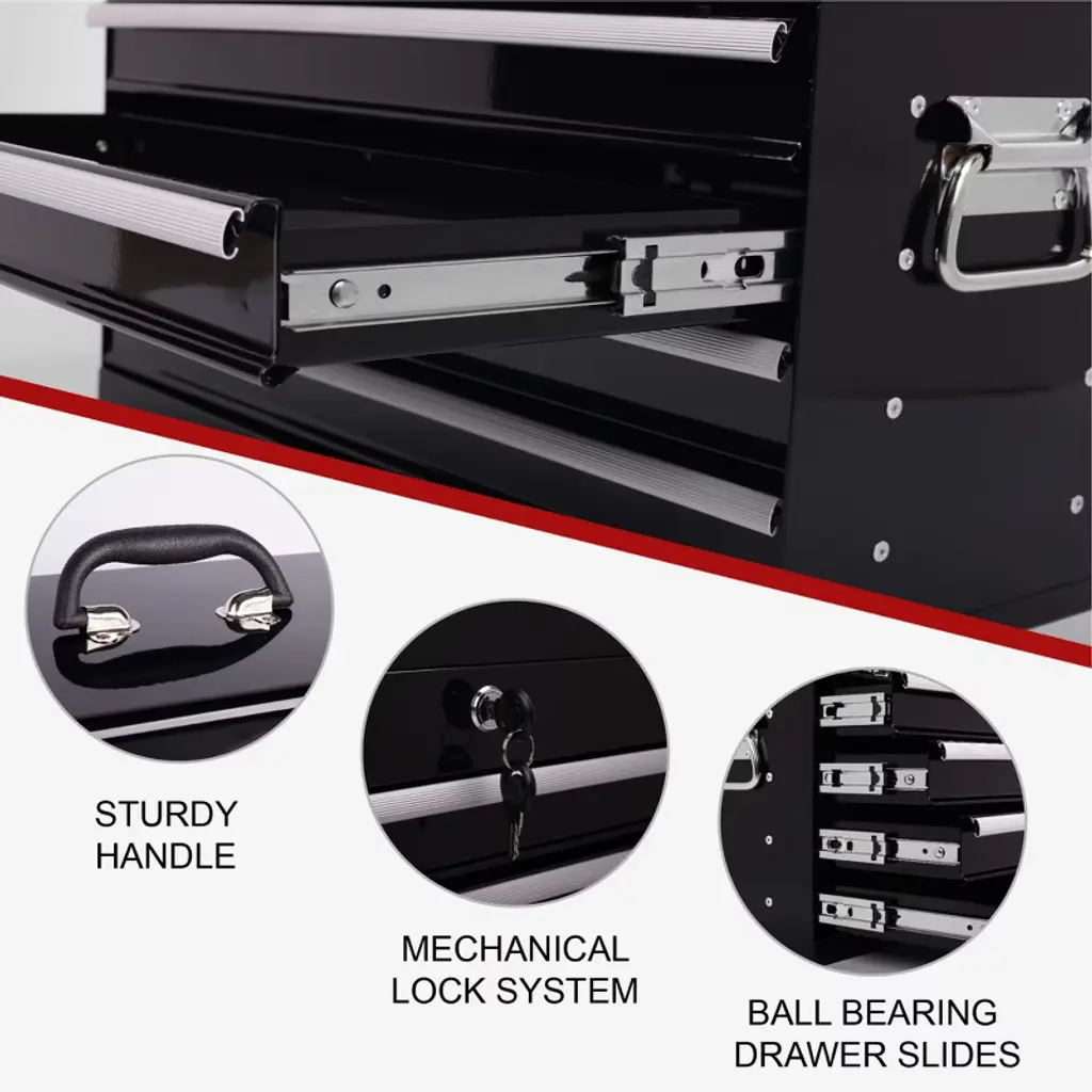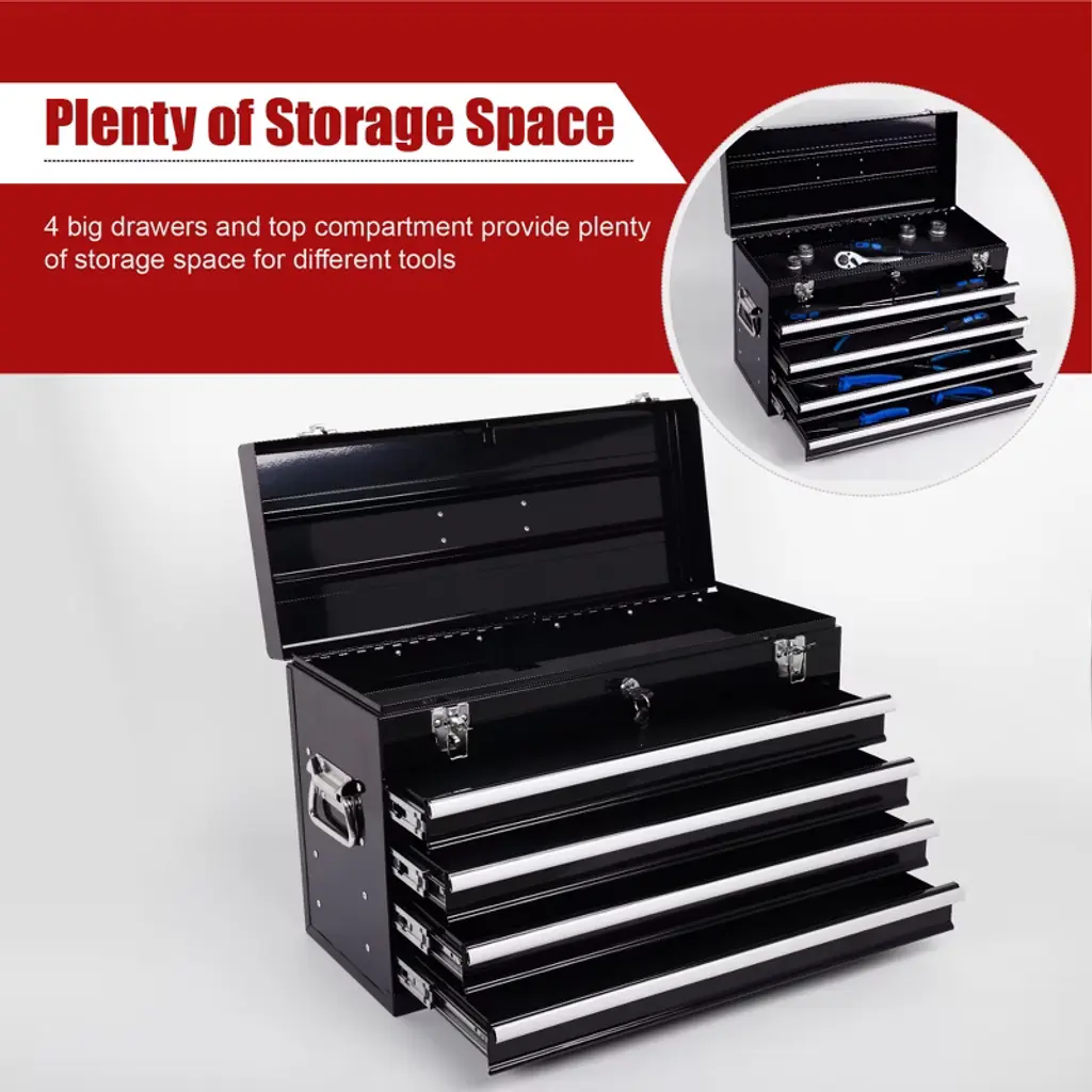 This 21" portable metal tool box offers generous storage with 1 top box and 4 drawers, ideal for on-site work or vehicle storage. Its auto-locking system secures tools when the top lid is closed, with an extra lock hole for added safety. Drawers glide smoothly on dual ball-bearing tracks, and EVA padding protects tools from damage. Built with heavy-duty steel, a rust-resistant finish, and a convenient handle, it's durable, easy to carry, and designed for hassle-free use in tough environments.
