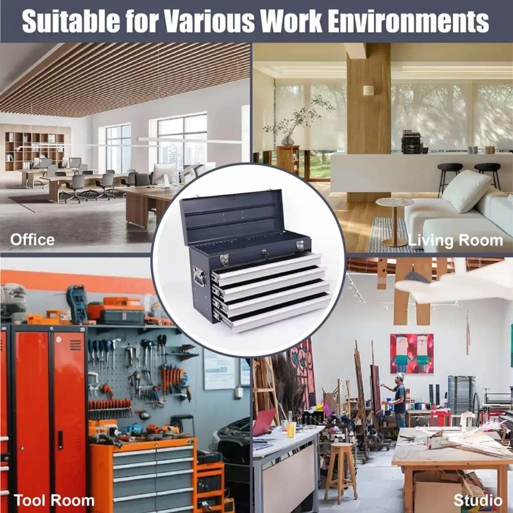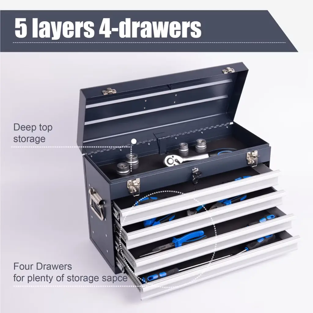 This 21" portable metal tool box offers ample storage with 1 top compartment and 4 drawers, ideal for on-site work or vehicle storage. Its auto-locking system secures tools when the top lid is closed, with an extra lock hole for added safety. Drawers glide smoothly on dual ball-bearing tracks, and EVA padding protects tools from scratches. Built with heavy-duty steel, a rust-resistant powder coating, and a convenient top handle, it's durable, easy to carry, and perfect for tough environments.