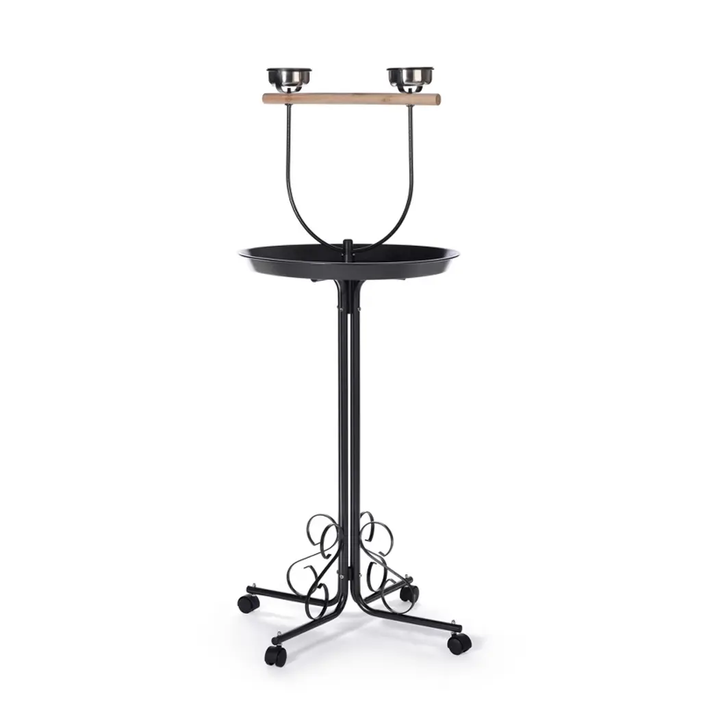 Introducing the Gulches Mobile Bird Bath, a versatile and portable perch designed for your feathered friends. With overall dimensions of 23.5" diameter x 43.75" height, this stand features four wooden perches and two stainless steel bowls for feeding. The high-edge tray, measuring 23.5" in diameter, helps contain messes, making cleanup a breeze. Equipped with four wheels, this bird stand can be easily moved throughout your home, providing a dynamic environment for your birds to play and rest.
