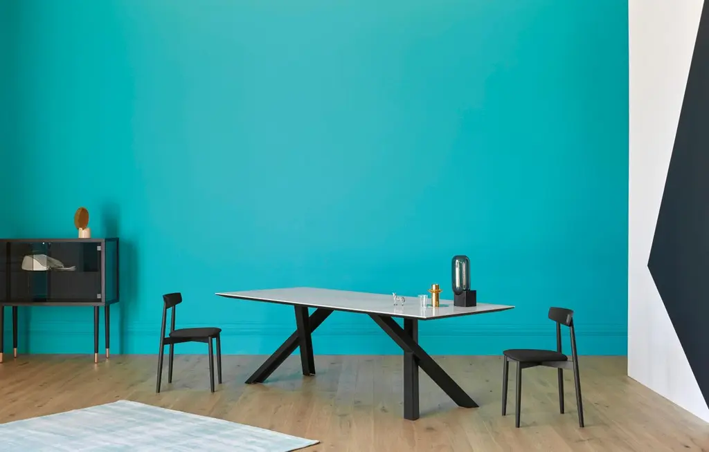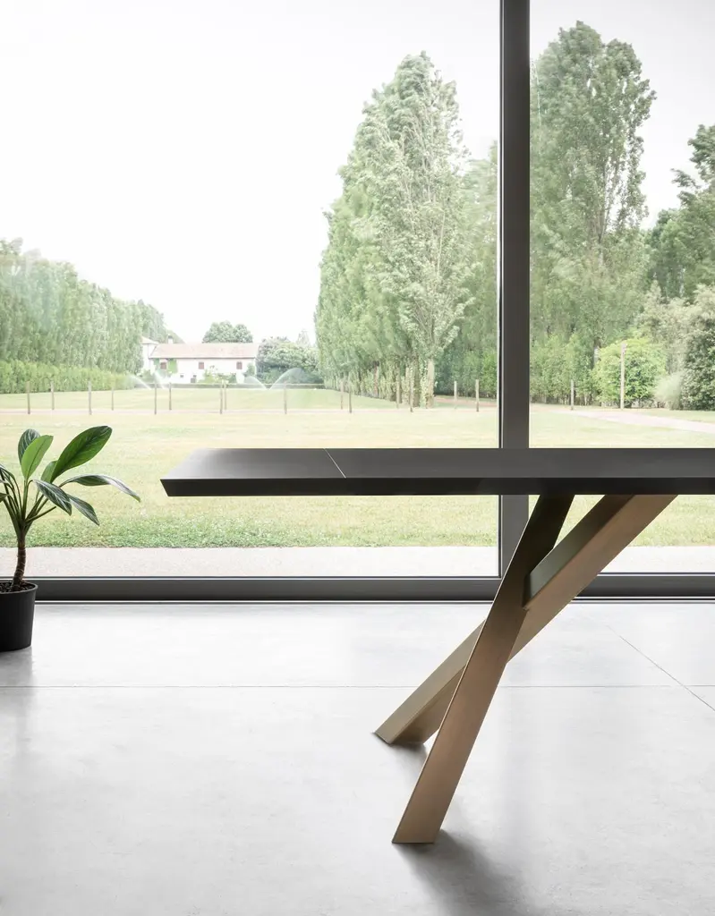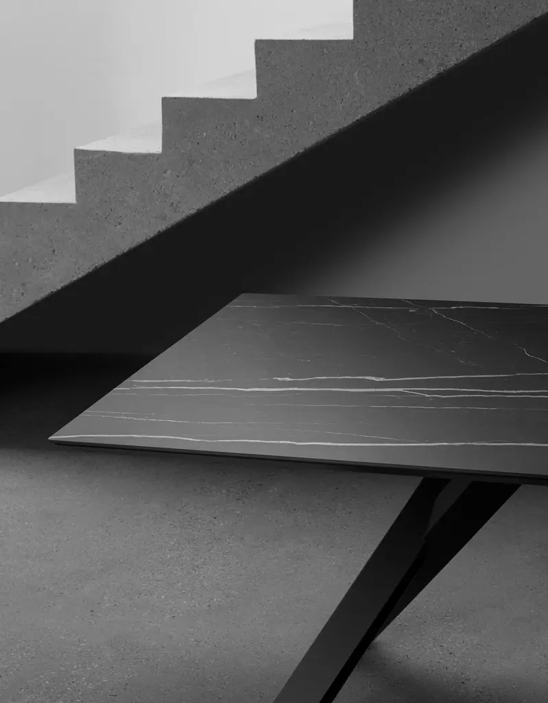 Four crossed lines which support a top available in several finishes that make it ideal for a décor that surprises. The legs are obtained from press-bent metal while the top is available in fix or extendable version (Gustave Plus).Additional Information:Material: Metal, ceramicTop finish: Thundernight ceramicFinish: Varnished blackDimensions: 200 W x 100 D x 75 H cmAvailable in other top finish options: Vintage oak, canaletto walnut, flamed oak, heat-treated oak, black ash, palladio doge, palladio moro, emperador, étoile gris, statuario white Available in other legs finish options: Lacquered black, rose gold matt, bronzèAvailable in other size option: Large and Medium