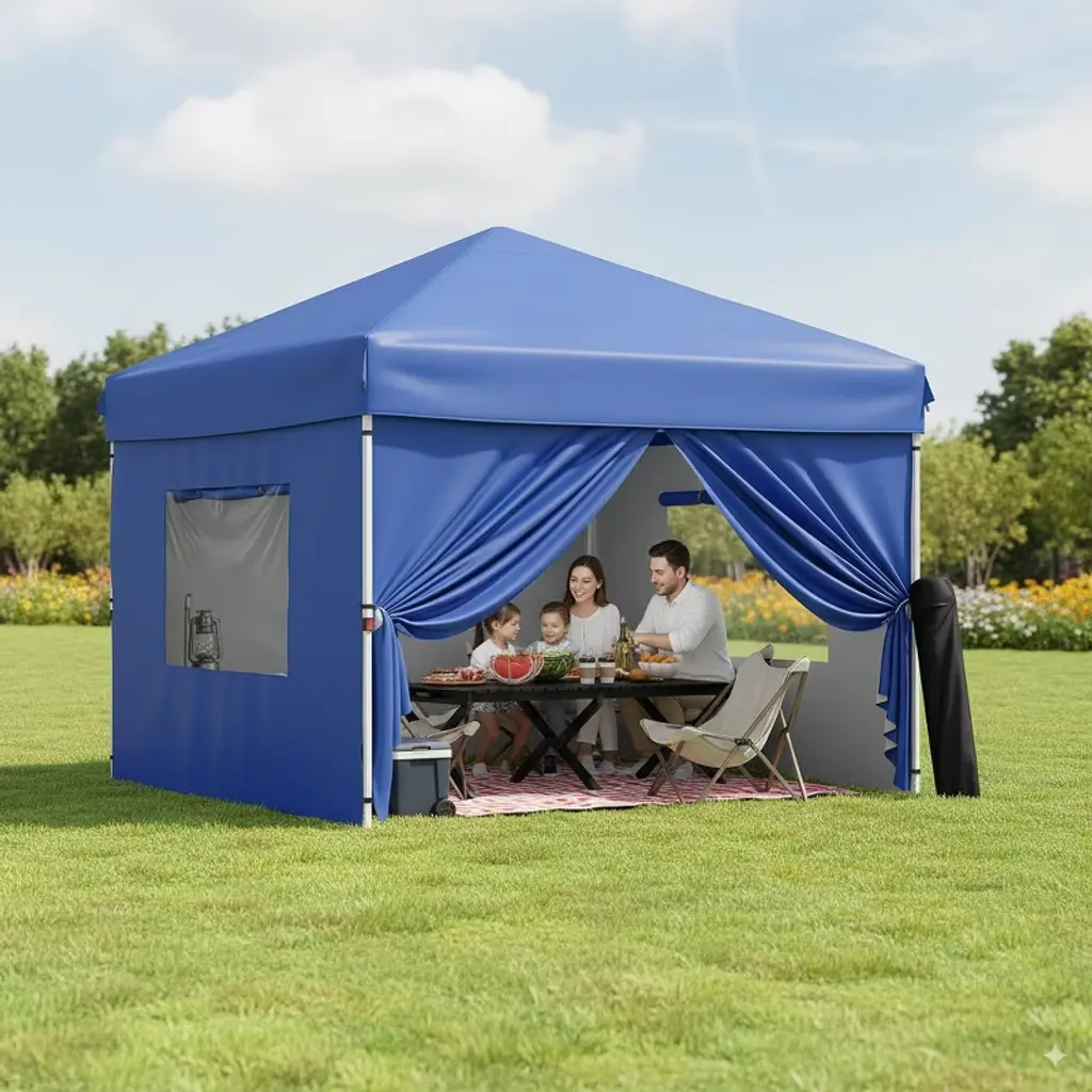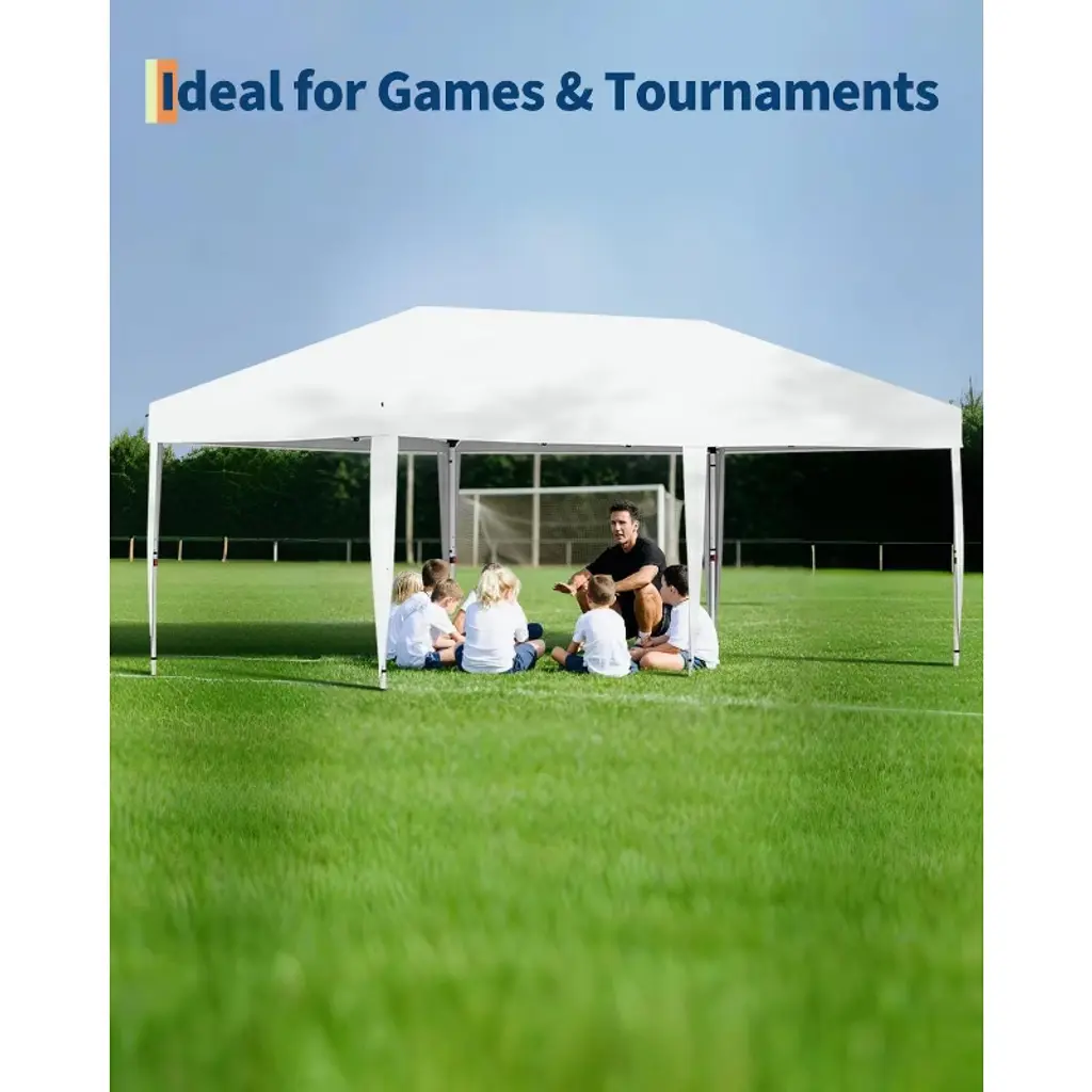 This 10'x20' outdoor canopy tent provides 200 sq.ft of UV-resistant, waterproof shelter for 10-20 people, features tool-free setup with adjustable height (6.5FT/6.2FT/5.9FT), removable sidewalls for ventilation, and includes all accessories (frame, top cloth, stakes, sandbags) in a portable wheeled bag ¨C ideal for events, camping, and outdoor gatherings.