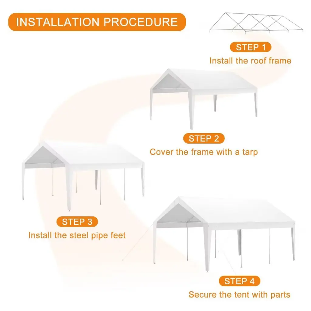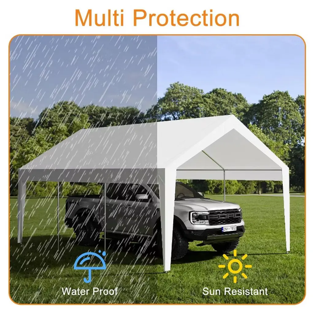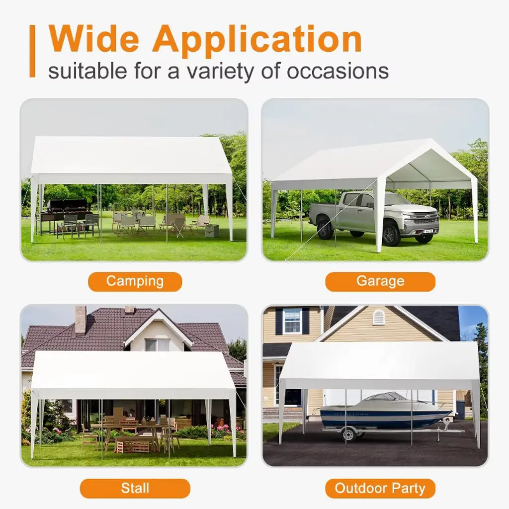 This 10'x20' heavy-duty carport features a durable, rust-resistant steel frame and a waterproof, UV-resistant canopy, providing spacious shelter suitable for vehicles and outdoor events accommodating up to 30 people. Easy to assemble without tools, it offers versatile use for storage, social gatherings, or commercial purposes with added stability from ground stakes and windproof ropes.