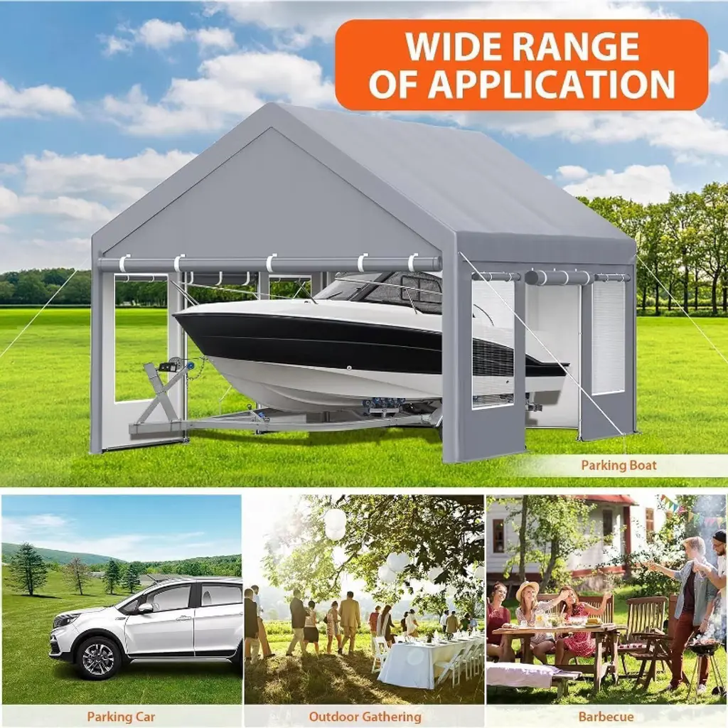 This heavy-duty portable carport features a waterproof PE tarp roof with UV protection and rust-proof galvanized steel pillars, providing durable, all-weather shelter for vehicles up to 13x20 ft. Its tool-free assembly and zip-up mesh windows offer easy setup, ventilation, and mosquito protection, making it ideal for parking, gatherings, or outdoor workspace.