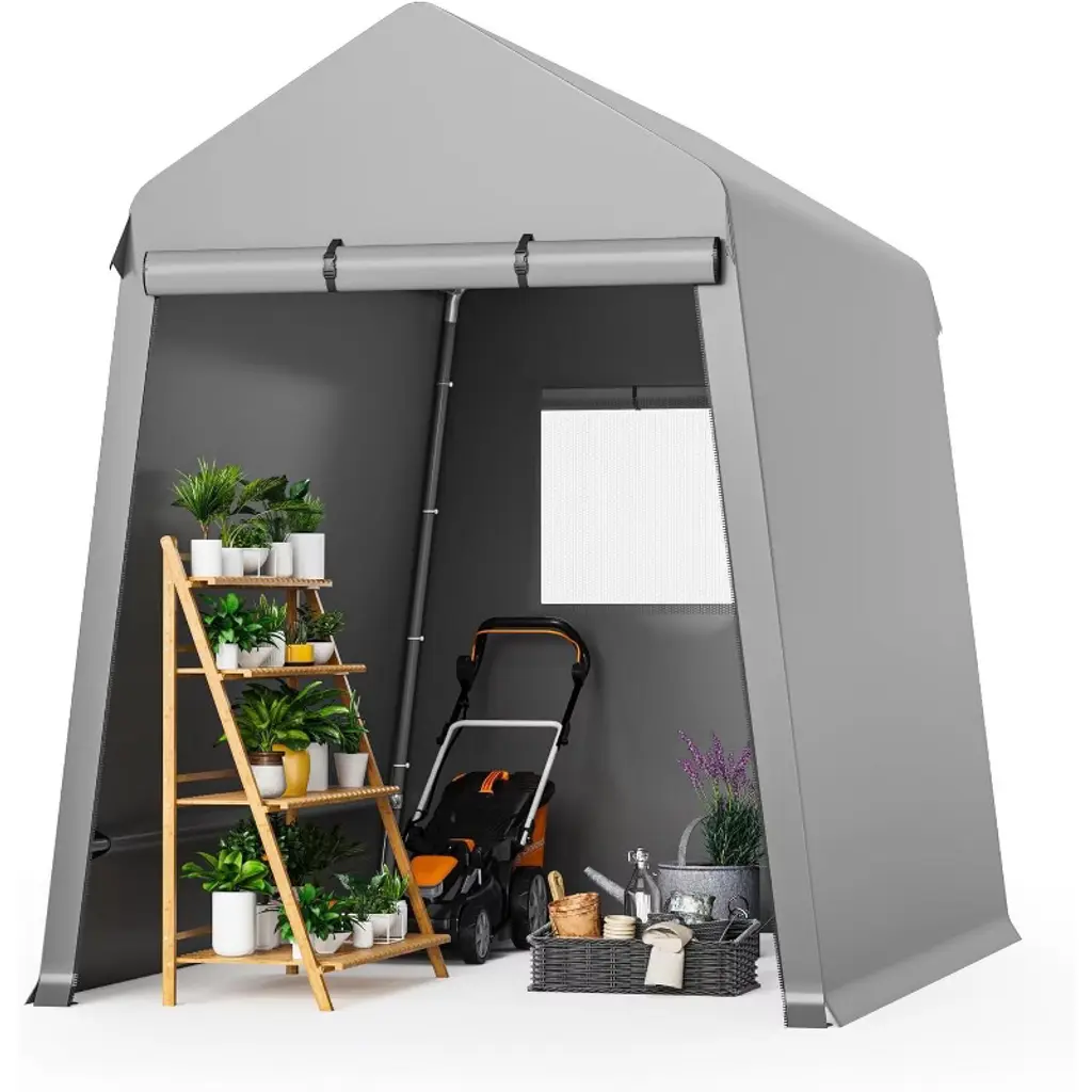 This heavy-duty storage tent features a sturdy, rust-resistant steel frame with 1.5" diameter poles for excellent stability and long-lasting protection against harsh weather. It includes removable roll-up doors, ventilation panels, and a durable triple-layer waterproof cover, all designed for easy, tool-free assembly by 2-3 people.