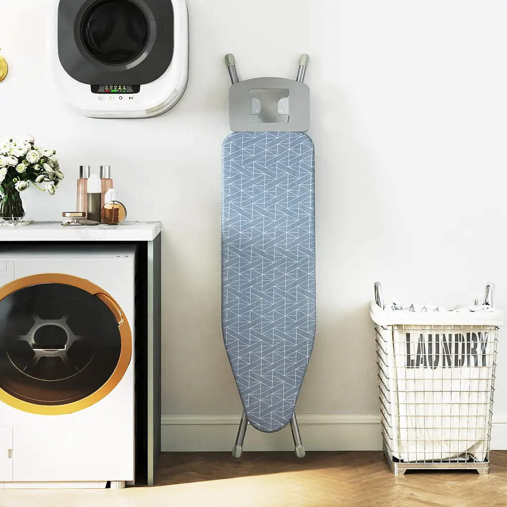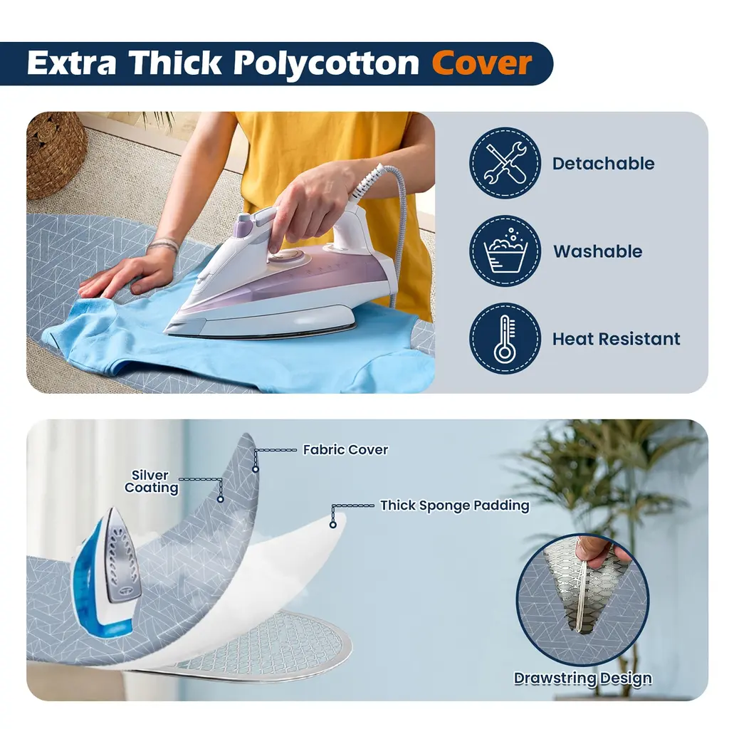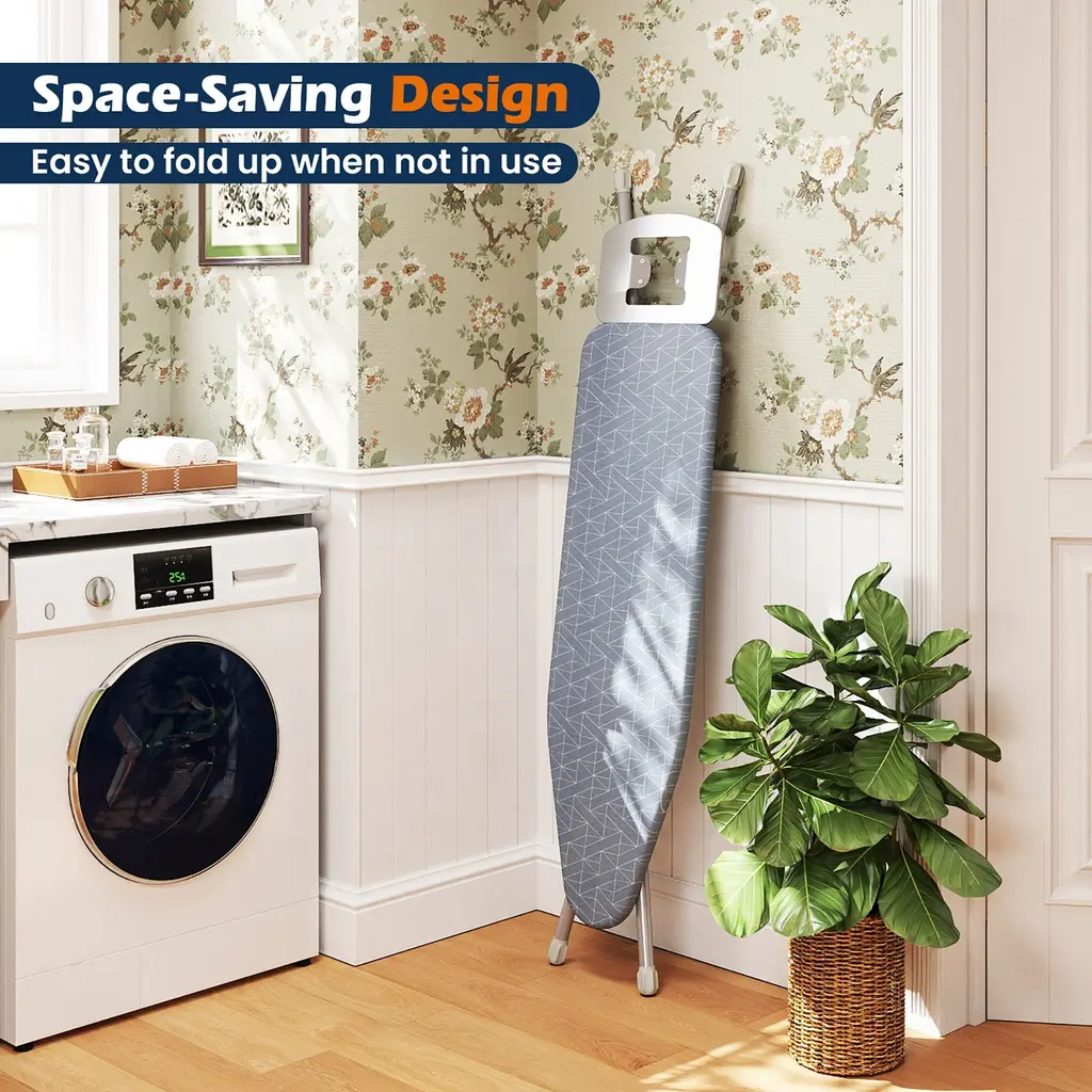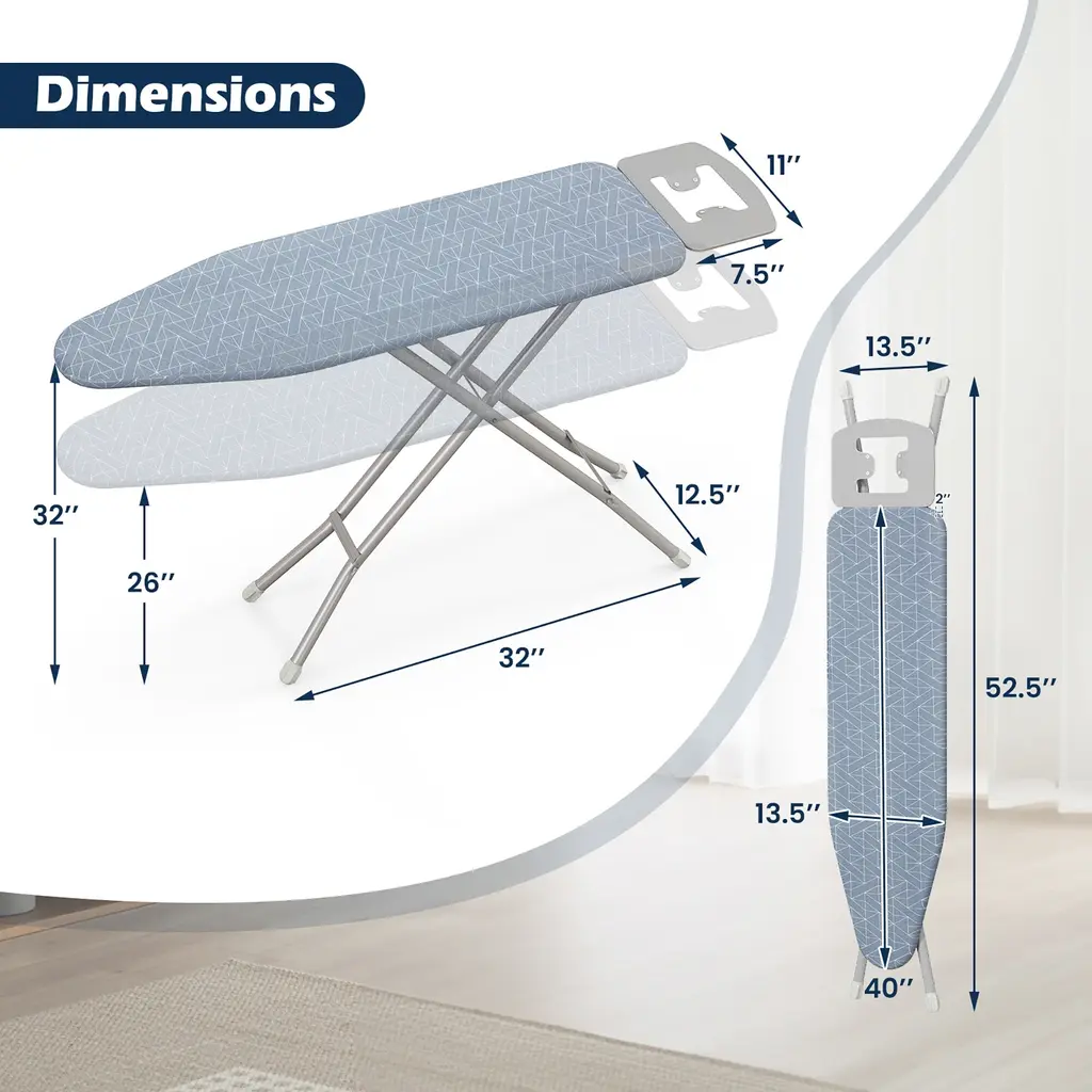 The 4-layer iron table features a silver-coated cover that is heat resistant up to 536℉. In addition, the ironing board also includes extra thick padding for iron mark prevention and mesh wire to ensure efficient heat release. As needed, the overall height can be adjusted from 26'' to 32''. Made of robust carbon steel, it supports up to 66 lbs. The ironing table comes with a safety lock, anti-slip foot pads and an iron rest for added convenience. With a quick-folding feature, the 52.5''L x 13.5''W x 2''H folded iron table can be easily stored in the closet, laundry room, or behind the door. Since it only weighs 7 lbs, the portability becomes easier.Features:7 height adjustments are perfect for people of different heights Multi-layer design includes a metal mesh, thick sponge, and washable fabric cover Designed with a silver coating to reflect heat for fast ironingMaterial: Carbon Steel, Rubber, Polyester Fabric, Sponge Unfolded Dimensions: 48'' x 13.5'' x 26''-32'' (L x W x H) Size of Ironing Surface: 40'' x 13.5'' (L x W) Size of Iron Rest: 11'' x 7.5'' (L x W) Size of Base: 32'' x 12.5'' (L x W) Folded Dimensions: 52.5'' x 13.5'' x 2'' (L x W x H) Overall Adjustable Height: 26''/27''/28''/29''/30''/31''/32'' Load Capacity of Ironing Surface: 44 lbsg Load Capacity of Iron Rest: 22 lbs Net Weight: 7 lbs Package Includes: 1 x Ironing Board 1 x User Guide