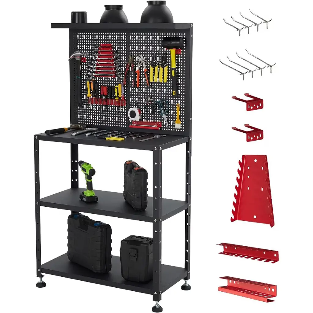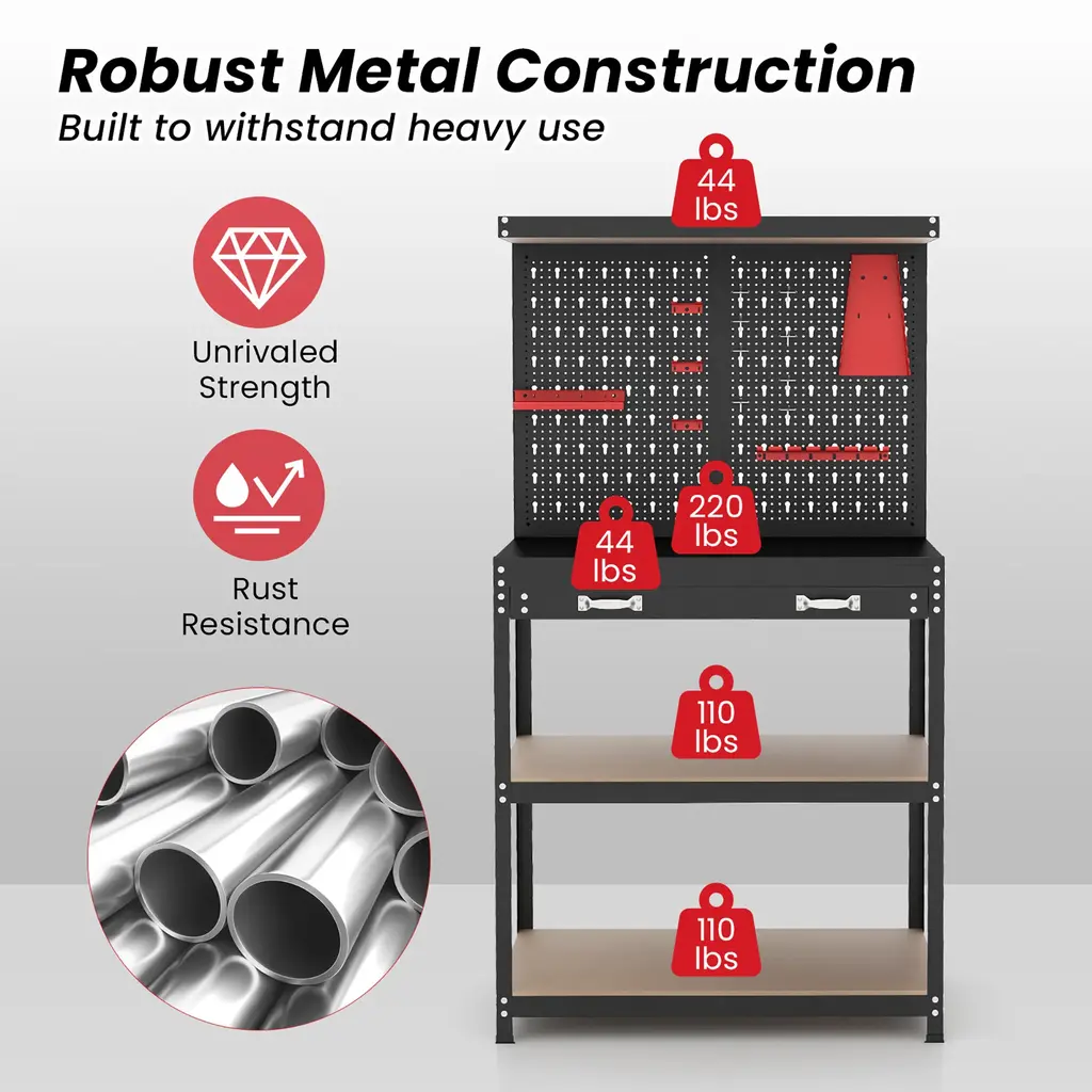 Discover the ultimate storage solution for your tools and equipment with our spacious and well-designed worktable, meticulously crafted to keep your work environment organized and efficient. This versatile workbench is equipped with a variety of storage solutions for your tools, making them easy to organize and access when you need them. Moreover, the workbench is constructed from high quality materials for a sturdy and stable build, with non-slip foot pads for added stability. Furthermore, with its spacious pegboard, sturdy shelf and 2-storey load-bearing lower shelf, this workbench offers plenty of storage space for all your tools and equipment. And the smooth storage drawers and large tabletop allow for easy organization and access.Features:Premium workbench with high capacity is ideal for smaller areas Provides ample storage space with a stable top and lower shelf Versatile and suitable for various workplaces, whether sitting or standingColor: Black + Red Material: Metal, MDF Overall Dimension: 32'' x 16'' x 61'' (L x W x H) Height of Tabletop: 36'' Dimension of Drawer: 29.5'' x 16'' x 2.5'' (L x W x H) Weight Capacity of Tabletop: 220 lbs Weight Capacity of Drawer: 44 lbs Weight Capacity of Top Shelf: 44 lbs Weight Capacity of Each Lower Shelf: 110 lbs Net Weight: 54 lbs Package Includes: 1 x Workbench with Pegboard 1 x Drill Bit Storage Rack 1 x Wrench Set Rack 3 x Tool Holders 1 x Long Rack 8 x Pegboard Hooks 1 x Instruction