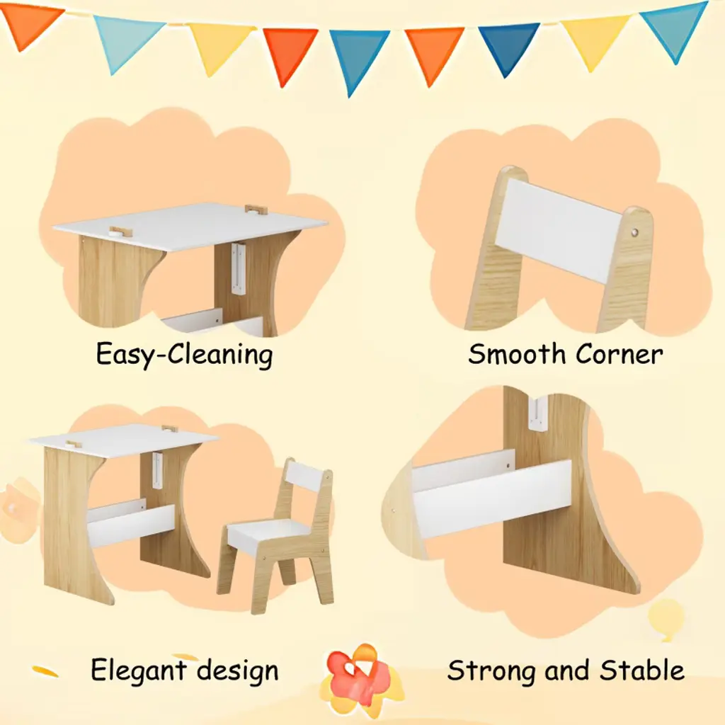 Hachikiko 2-in-1 Wooden Convertible Children Study Desk With 1 Chair, Reversible Tabletop For Drawing/play, Natural Finish, Built-in Storage