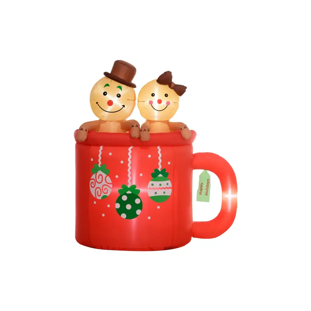 Spread Holiday Cheer with a Giant Gingerbread Couple in a Mug! Make your home the merriest on the block with this 6-feet-tall Christmas inflatable featuring an adorable gingerbread couple snuggled in a giant hot cocoa mug! Perfect for yard decorations, holiday parties, and indoor festive displays