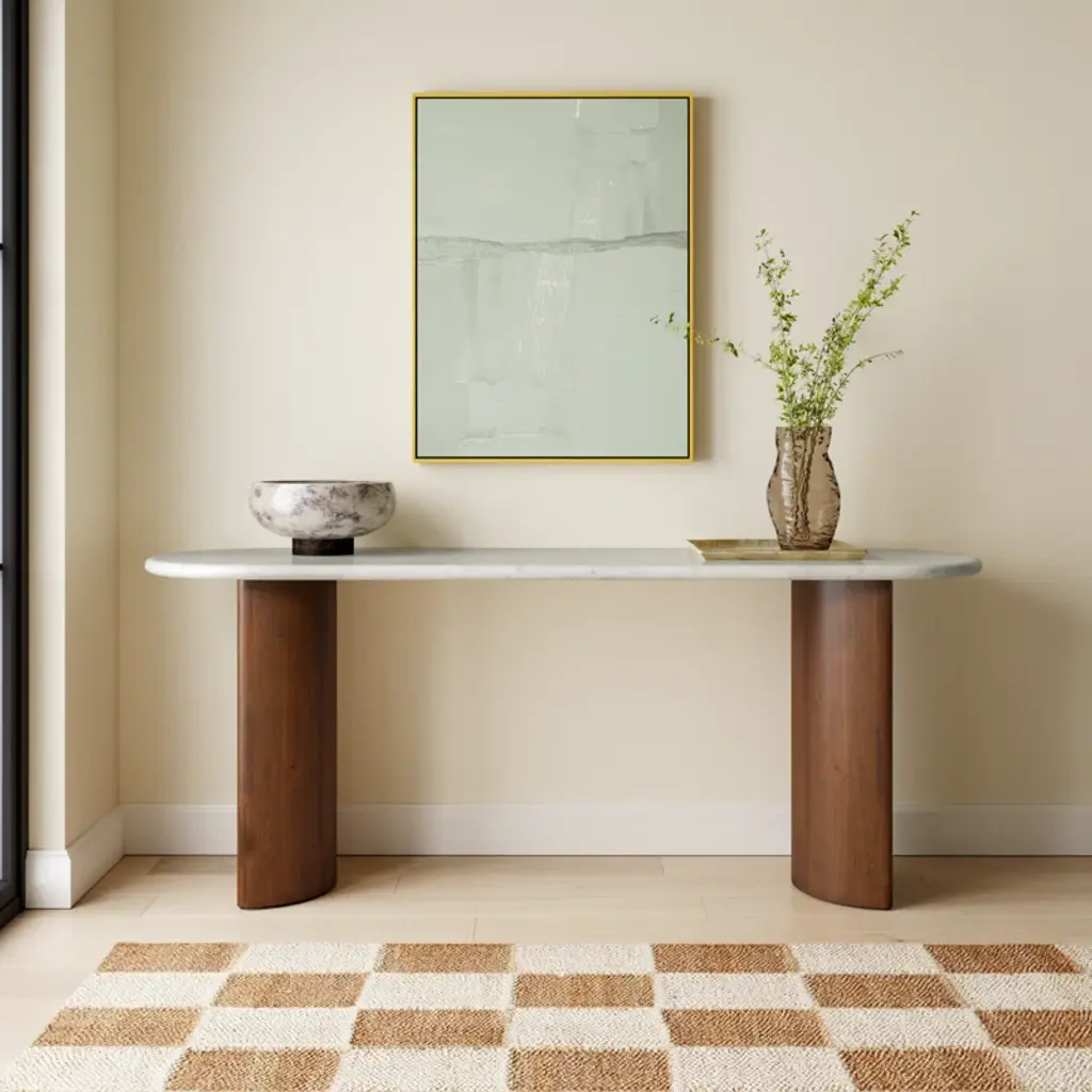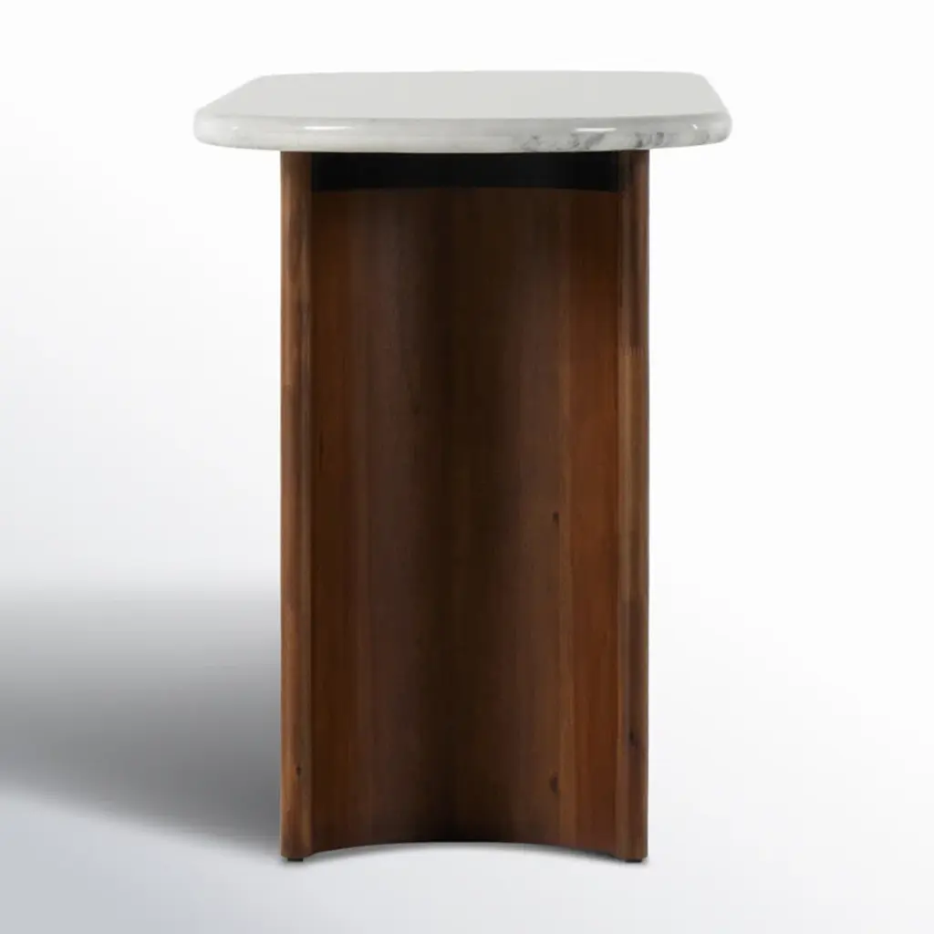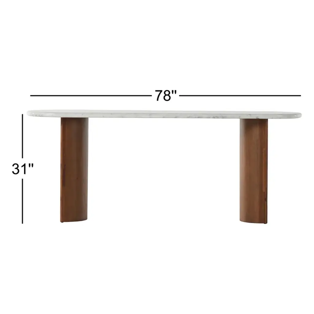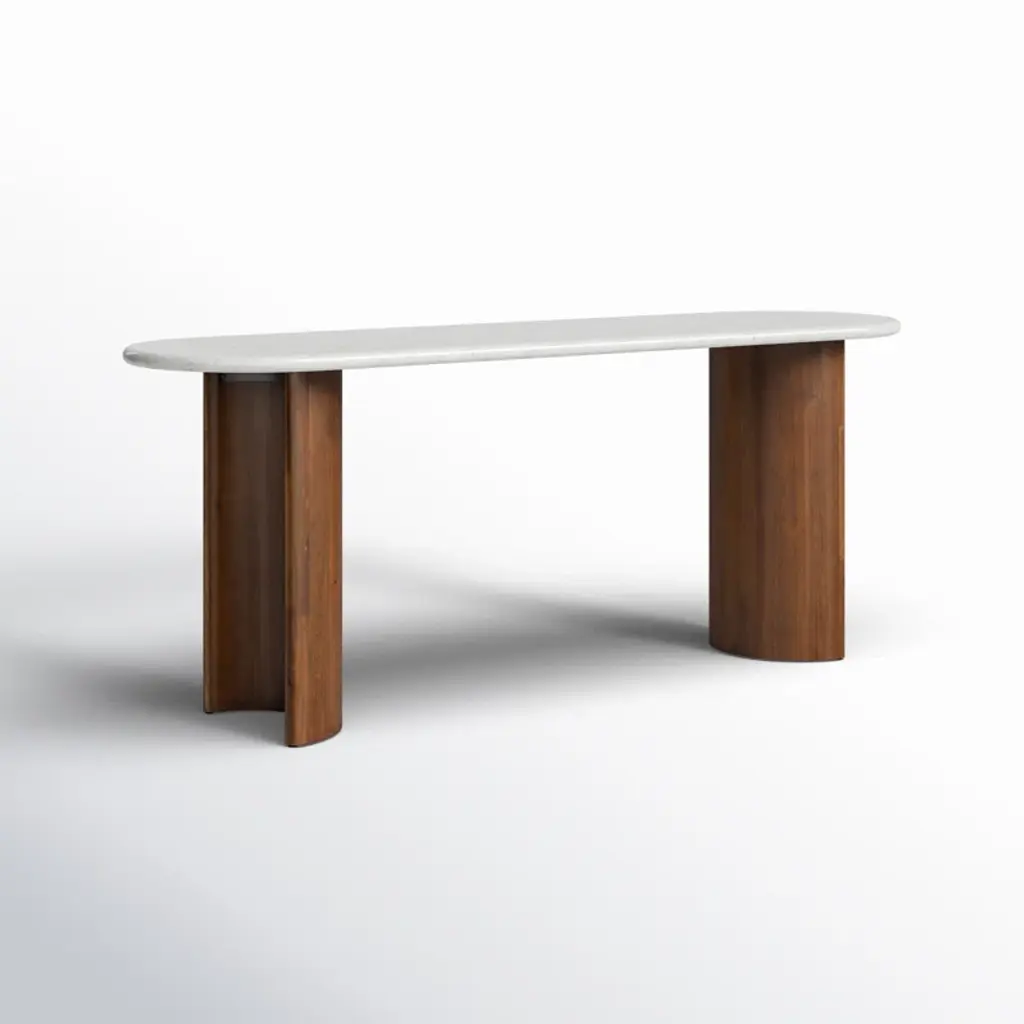 This console table brings sleek, minimalist style to your living room. Its oval surface is crafted from genuine white marble, supported by legs made from solid acacia wood. The double-arching base adds a sculptural, architectural touch, while the surface is just right for a lamp and accents. Pair it with pieces from the collection for a cohesive look.