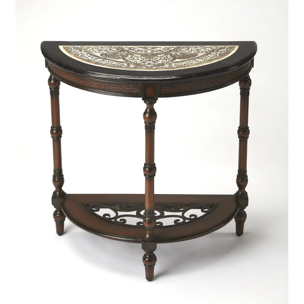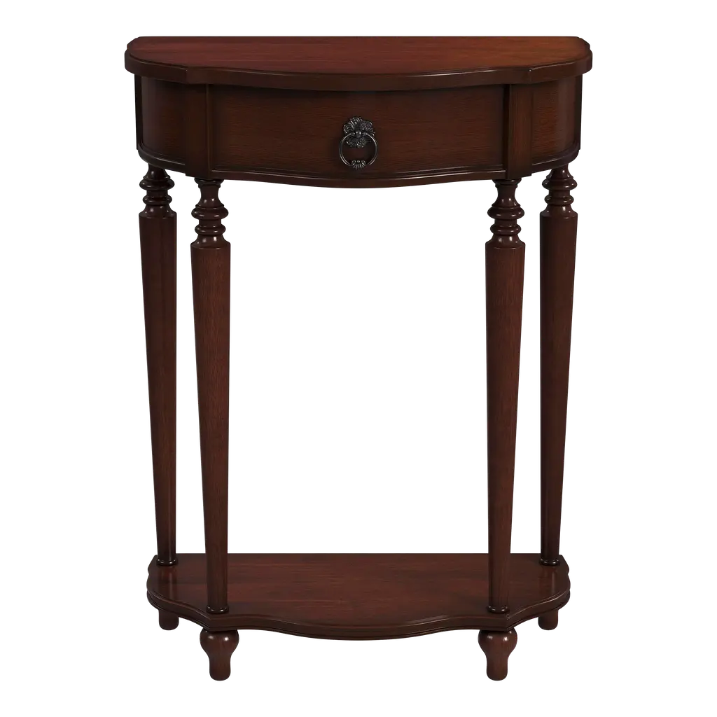 This striking console is a terrific addition to any traditional living space. It is crafted from select Hardwood solids, Wood products and choice veneers. Featuring fluted hand carved legs, it has a distinctive top linen-fold inlay design of walnut and maple veneers within matched cherry veneers. Cherry veneers on drawer front and lower shelf. Drawer with antique brass plated hardware. Durably Constructed With: Rubberwood Solids, MDF, Resin, Oak Veneer Product Construction Features: Solid wood legs and frame with a veneer top over an engineered wood substrate, resin components on legs and apron. Product Assembled Measurement & Weight: 31.0" H x 33.0" W x 15.0" D -- 35.0 lbs. lbs. Suggested weight capacity Item Arrives: Needs Assembly Photo may slightly differ from actual item in terms of color/finish due to the lighting during photo shoot or the monitor's display.
