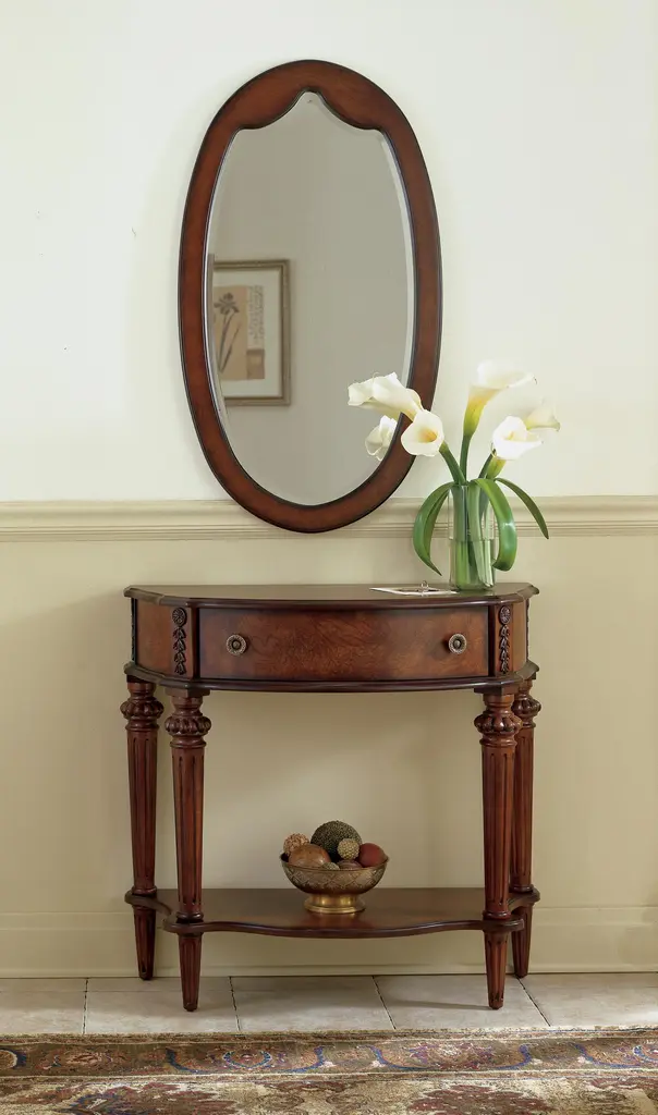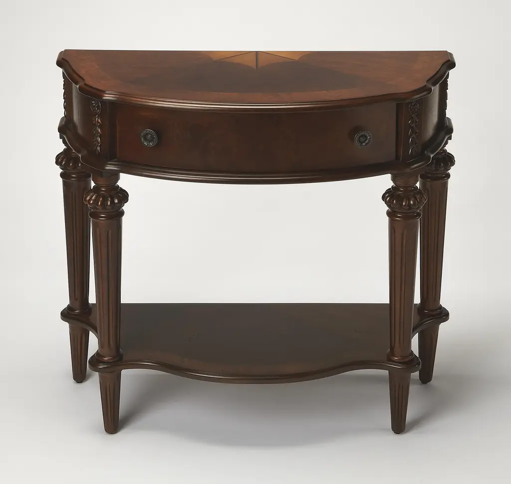 Selected solid Woods and choice veneers. Walnut, cherry and maple veneer inlay design on top and lower shelf with ash burl veneer border. Drawer with antique brass plated hardware. Durably Constructed With: Rubberwood Solids, MDF, Resin, Cherry, Maple, Walnut and Olive Ash Burl Veneers Product Construction Features: Solid wood legs and frame with a veneer top over an engineered wood substrate, resin components on legs and apron. Product Assembled Measurement & Weight: 32.75" H x 34.0" W x 15.0" D -- 35.0 lbs. lbs. Suggested weight capacity Item Arrives: Needs Assembly Wood, like all natural materials, has inherent disparities in color and grain pattern. Variations in shade and markings are normal and can be expected with the natural materials used in the construction of this product. Photo may slightly differ from actual item in terms of color/finish due to the lighting during photo shoot or the monitor's display.