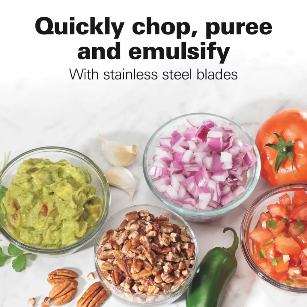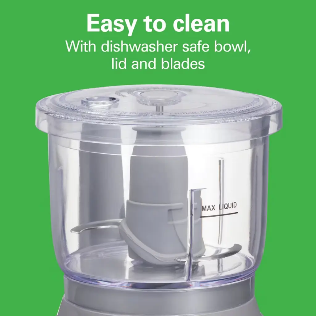 The Hamilton Beach® Stack & Press™ 3 Cup Food Chopper is the perfect kitchen tool to speed up food prep because it handles chopping, mincing, pureeing and emulsifying in minutes. You'll use it for everything from chopping garlic and nuts to mincing herbs, pureeing hummus and mixing dressings. It's perfectly sized for everyday use with a 3 cup capacity bowl and is compact enough to fit in any kitchen. Once you’ve added food to the bowl, press the lid down to pulse and release to stop – it’s that simple. With the Hamilton Beach Stack & Press 3 Cup Chopper, there's no need to fuss with a twist-lock motion to lock the parts into place. Whether you’re emulsifying Caesar dressing or pureeing baby food, it’s easy to add liquids to the oil dispenser on the lid during processing. For easy cleanup and peace of mind, the bowl, blades and lid are dishwasher safe and all food zones are BPA-free.