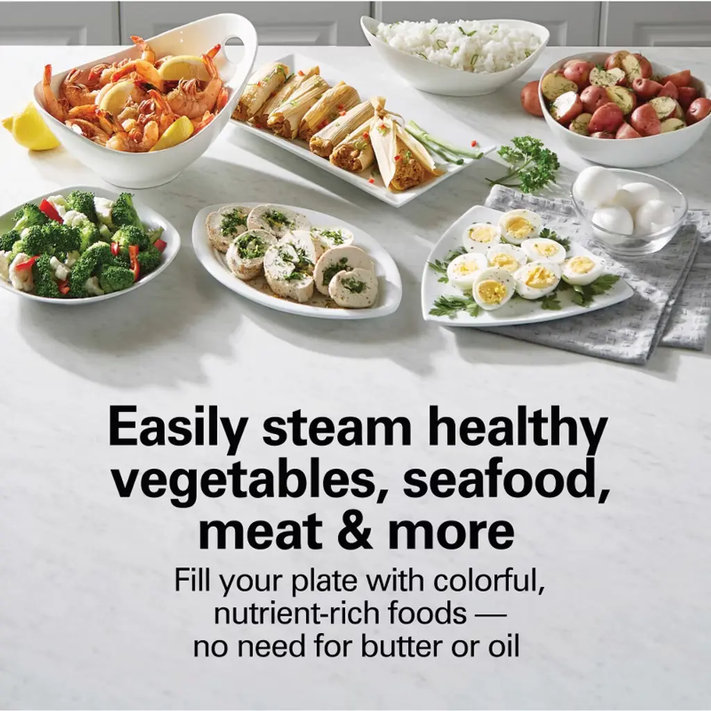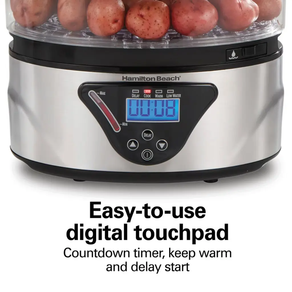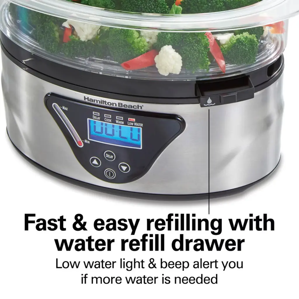 Steam delicious, nutritious meals with the Hamilton Beach® 2-Tier Digital Food Steamer. Steaming helps preserve the nutrients, vitamins and moisture of your food, and since there's no need to use butter or oil when you steam, it's a lower-calorie way to cook. With the 2-tier flexibility of the stacking steaming bowls, you can go from steaming a simple side dish of colorful vegetables to preparing a whole 5.5 qt. meal at once. The 2-Tier Digital Food Steamer is fast and easy to use. Simply fill the steamer's water reservoir to the MAX line, place 1 or 2 of the clear steaming bowls filled with food atop the base and set the cooking timer. You’re free to complete other tasks as food steams because when the cooking time is up, the steamer beeps and switches to keep warm. Add steaming to your cooking repertoire today — you'll reap the healthy rewards and satisfaction of serving a colorful, nutritious meal the whole family will enjoy.