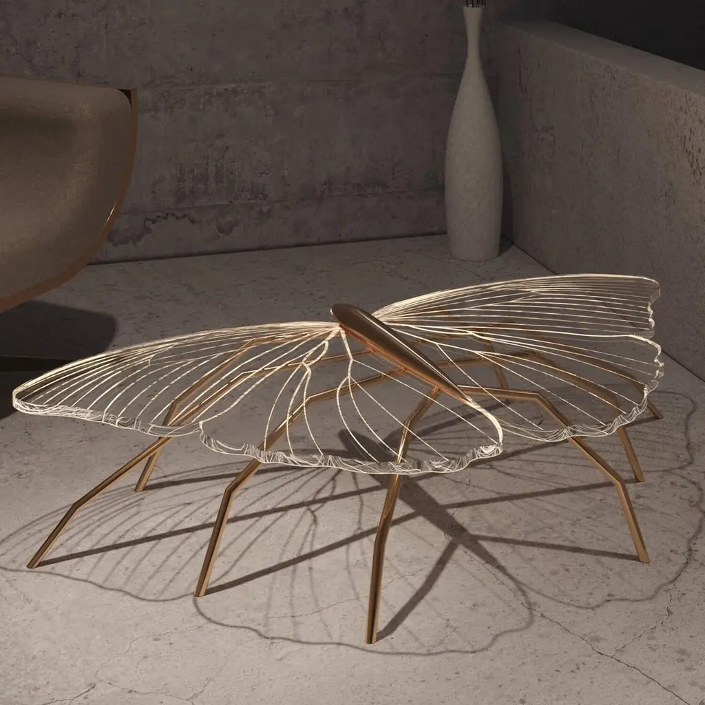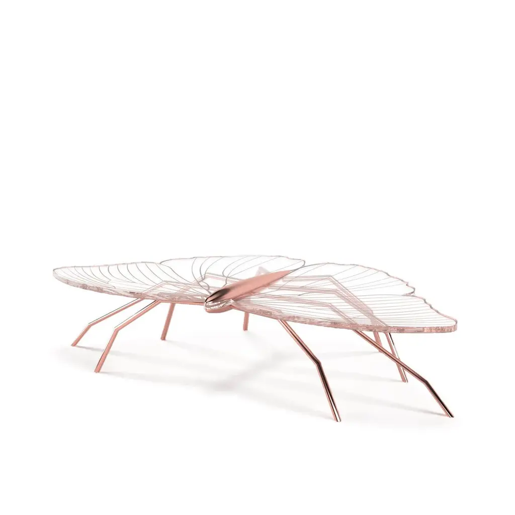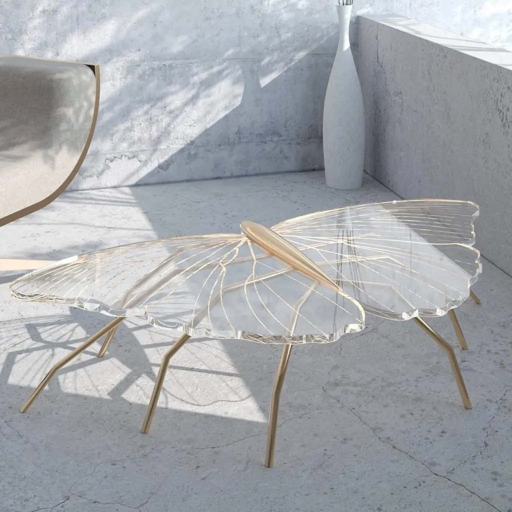 Our Nature Collection is eclectic and incomplete. We will always be waiting for Nature's next inspiration. The coffee table from this collection is butterfly-inspired, and the console from the same collection is dragonfly-inspired. Their unique and delicate designs are considered as beautiful as sculptures. The legs can be made of polished brass or polished copper. The tabletop is a thick acrylic plate laser-cut in the butterfly shape and then hand-painted with gold or copper paint and gold or copper flakes to match the legs' colour. With its polished finish, this coffee table takes some time to manufacture because the hand-painting and polishing operations are very time-consuming and require several work steps for surface preparation. The brass will be varnished to protect it from patina. The Nature Coffee Table´s manufacturing process is time-consuming. Due to the long hours of delicate construction, it is finished with meticulous attention to detail, resulting in exceptional craftsmanship.This listing is for a coffee table master-crafted in carefully selected brass. Brass is a beautiful metal used in delicate designs. It gives the furniture strength, durability and a vintage feel. Each piece is handmade by order, so we can manufacture it in endless combinations. Dimensions: Custom dimensions are available by request and only after analysis.We can also manufacture this piece with gold leaf. Gold leaf uses only pure gold and maintains its natural and intense brilliance for a long time because it does not oxidise.You can try it in your space using Augmented Reality with your mobile phone (Nature Collection, available on our website).Assembled piece. It will be delivered in a wooden box packed in bubble wrap.This piece is entirely made in Portugal and manufactured artisanally. The author carefully executed or supervised every process step in a small workshop context.Labour of love from Portugal.Designer/Author - Joao Faria/Emotional Objects.Manufacturer - Joao Faria/Emotional Objects.At Emotional Objects, we don't follow trends or fashion. Instead, we create distinct and timeless objects with solid ideas and concepts. Every Emotional Object has a meaningful story behind it. Made to last for generations, we proudly see our objects as future furniture classics that will stand the test of time.Working in Portugal with the best artisans, Joao Faria's work is difficult to distinguish between functional and fine art. He uses the finest materials and techniques, but most importantly, he only makes pieces he would want for himself.Art Furniture, Unique, Tailored, Emotional, Truly Yours.