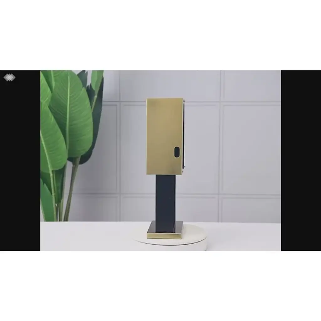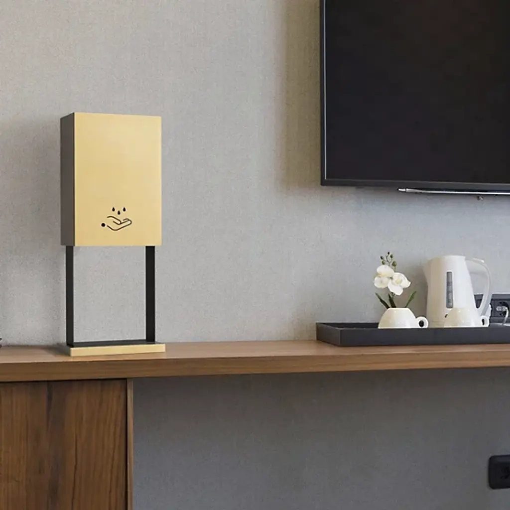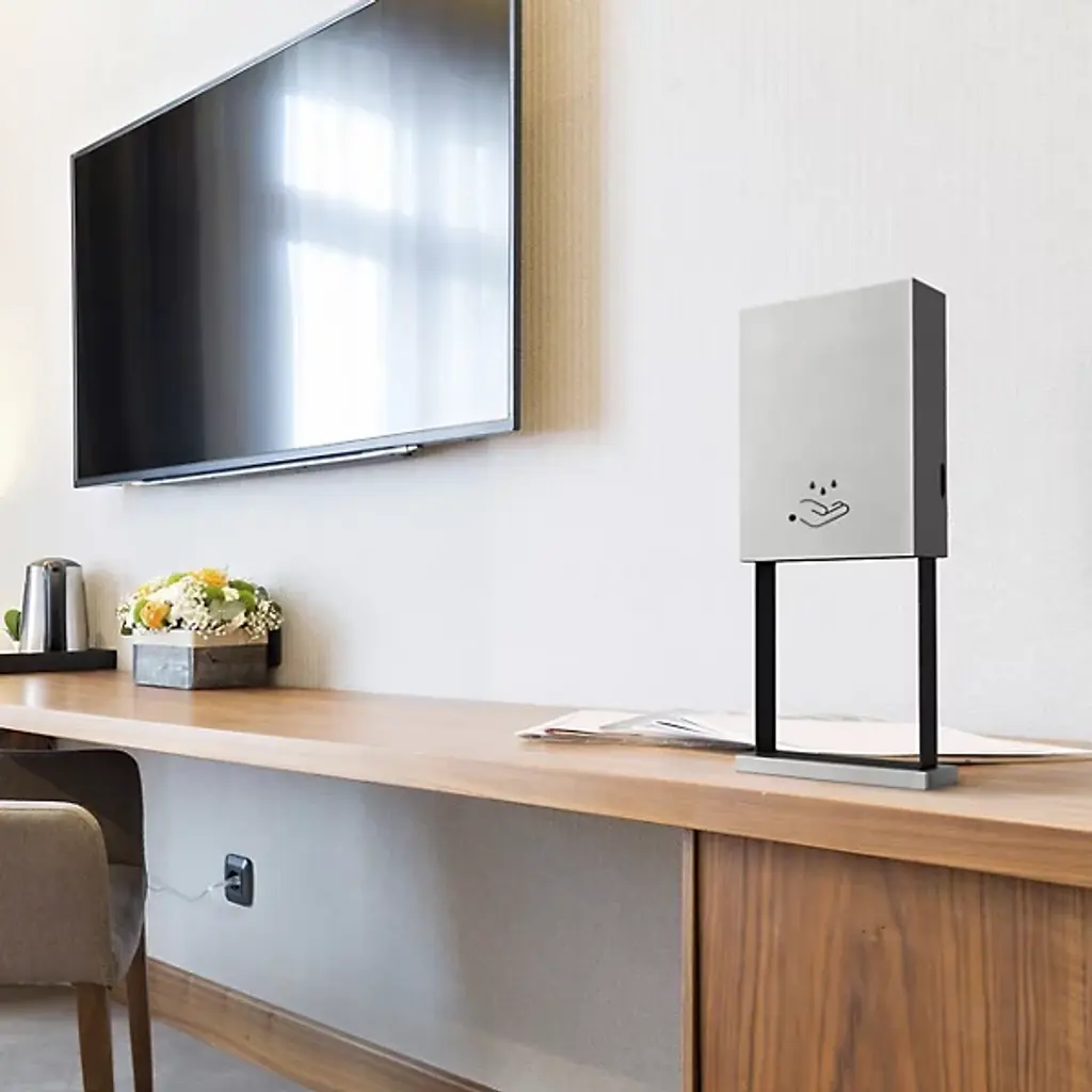 Keep clean with the Hand Sanitizer Tabletop Dispenser by Nova of California. This touchless hand sanitizer dispenser tabletop stand is as attractive as it is effective in killing harmful germs and bacteria. Customizable to include company logos, it is an elevated solution for health and wellness in public spaces, hotel lobbies, offices, and a range of facilities where the health of your employee, customer, or guest is of the utmost importance.