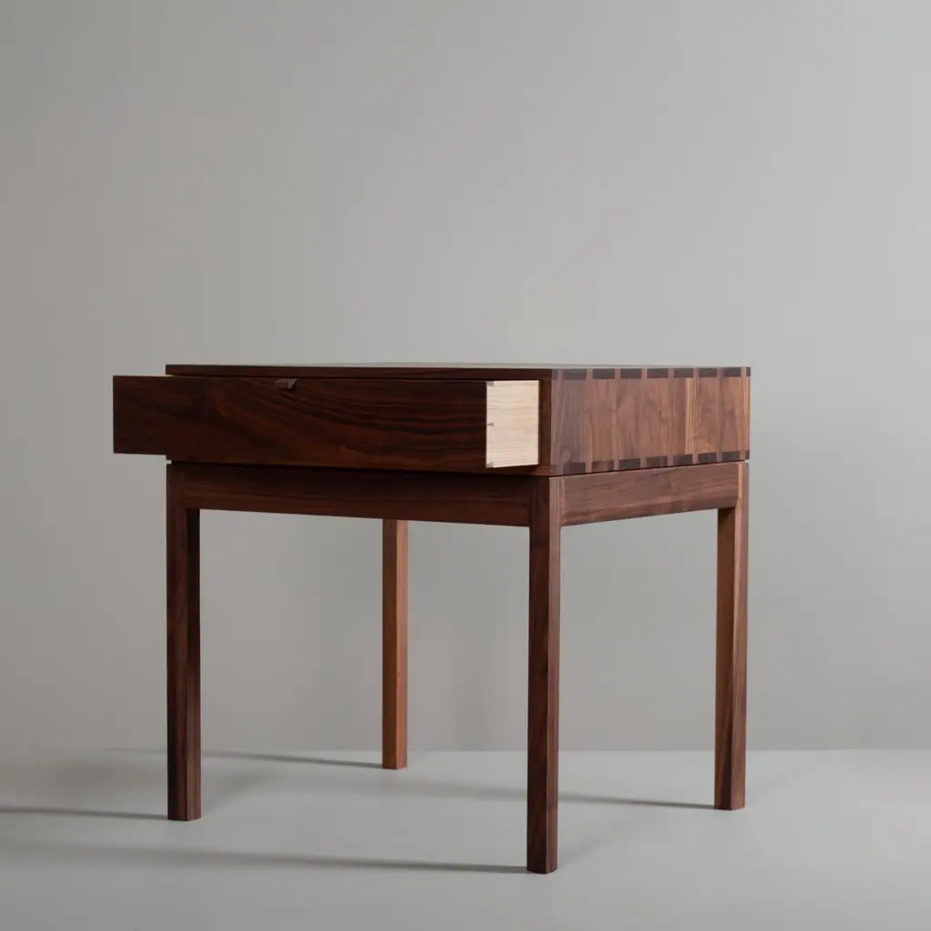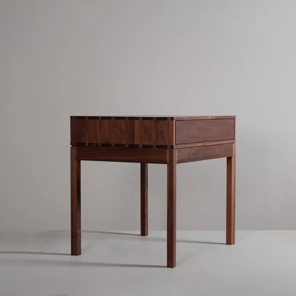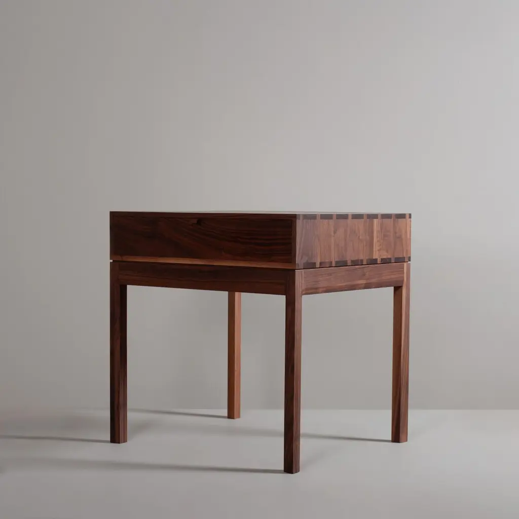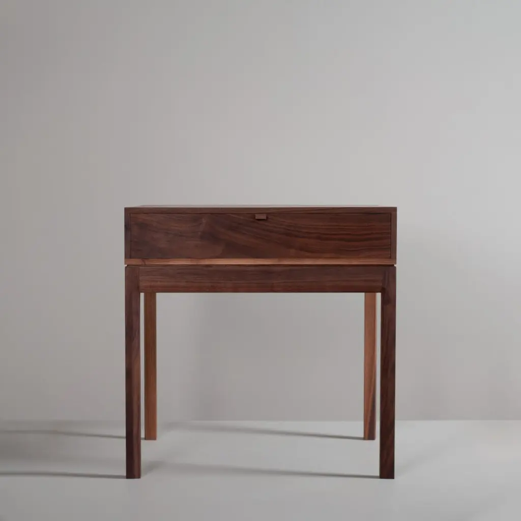 Totally hand-crafted American black walnut drawer tables. These are constructed from the finest American black walnut with the inner traditionally dovetailed jointed drawer in prime English Oak. The main upper box is detailed with fully exposed hand-cut dovetail jointing. A light curve design is cut into and around the legs and follows along the facia. Designed and handmade by our highly experienced craftspeople in England. Hand finished in stain-resistant durable non hazardous oils. A contemporary modernist design with European design influences utilising traditional English furniture craftsmanship and fine timbers.These can be made to your bespoke custom dimensions or with multiple drawers.We design bold and distinctive pieces of artisan handmade furniture. Our main objective is to combine the design alongside the natural beauty and properties of the raw materials used.These timbers and materials are very carefully chosen for each design, maintaining our focus on the benefits, visual impact and strengths of what we use. By utilising these wonderful and naturally occurring properties with our unique designs we continue to create distinct, tactile and idiosyncratic pieces.These pieces are bench-made by hand in England, in very small numbers, bearing the telltale signs of a true craftsperson. Built to last a lifetime and beyond.Enquire for international shipping quotes.