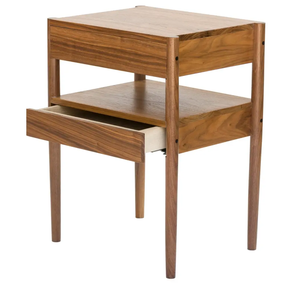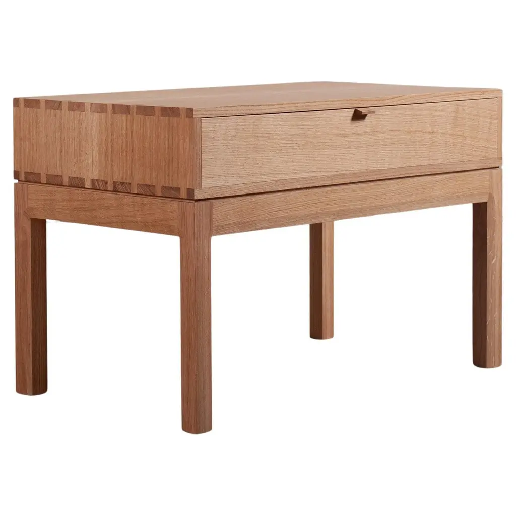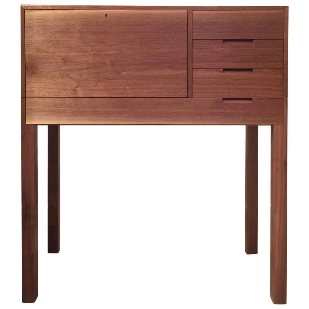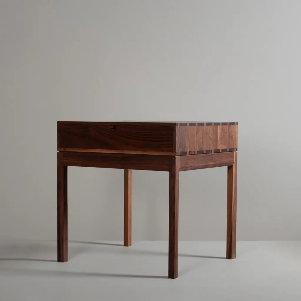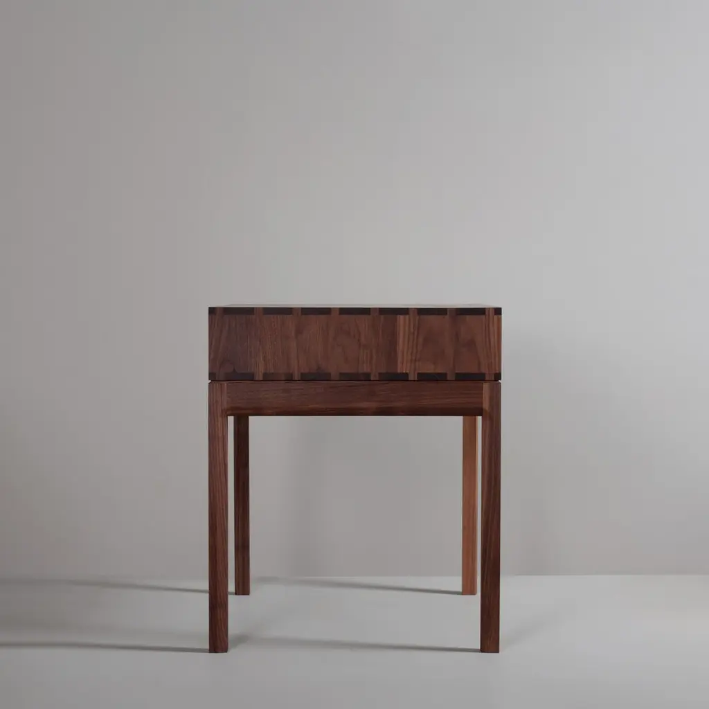 Totally hand-crafted American black walnut drawer tables. These are constructed from the finest American black walnut with the inner traditionally dovetailed jointed drawer in prime English Oak. The main upper box is detailed with fully exposed hand-cut dovetail jointing. A light curve design is cut into and around the legs and follows along the facia. Designed and handmade by our highly experienced craftspeople in England. Hand finished in stain-resistant durable non hazardous oils. A contemporary modernist design with European design influences utilising traditional English furniture craftsmanship and fine timbers.These can be made to your bespoke custom dimensions or with multiple drawers.We design bold and distinctive pieces of artisan handmade furniture. Our main objective is to combine the design alongside the natural beauty and properties of the raw materials used.These timbers and materials are very carefully chosen for each design, maintaining our focus on the benefits, visual impact and strengths of what we use. By utilising these wonderful and naturally occurring properties with our unique designs we continue to create distinct, tactile and idiosyncratic pieces.These pieces are bench-made by hand in England, in very small numbers, bearing the telltale signs of a true craftsperson. Built to last a lifetime and beyond.Enquire for international shipping quotes.