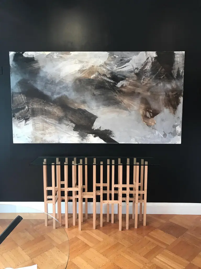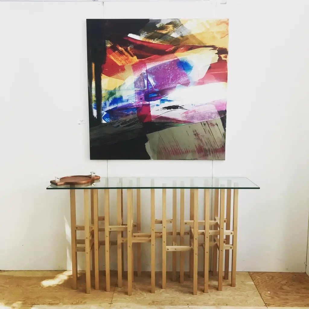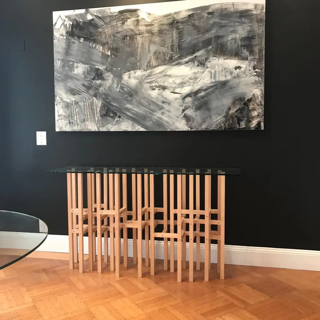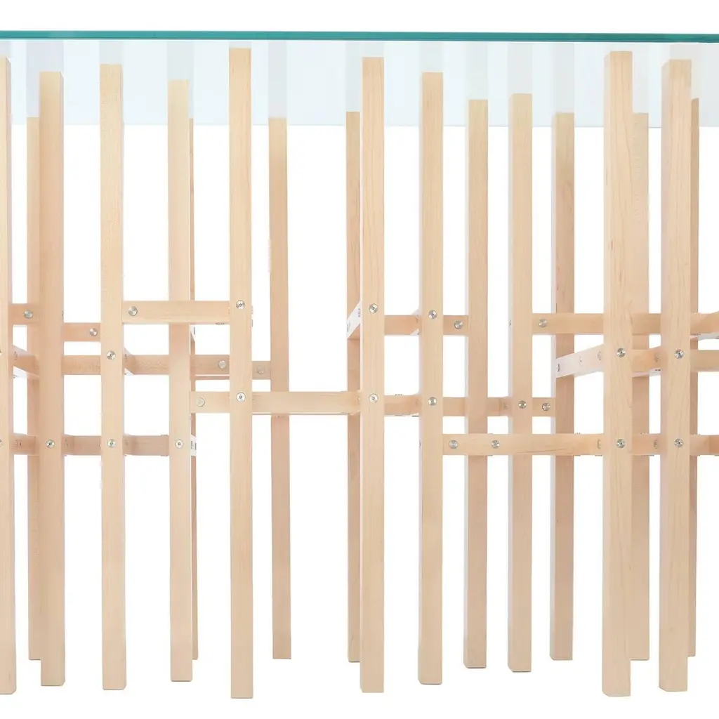 The Europa table by Peter Harrison is an intoxicating frenzy of elements which cross and overlap and resonate in the is modern console. 25 legs touch the floor and the glass. 45 horizontal elements create the structure. Levelers in each leg assure that the table can be adjusted to any floor. The pictured wood is Maple. The hardware is all stainless steel. The top is 1/2" thick tempered glass that measures 16" x 66". Europa can be ordered in a number of woods and finishes. The Europa table is designed and meticulously crafted by Peter Harrison in his Upstate New York studio and sold studio direct. Questions? I respond quickly to the message system!