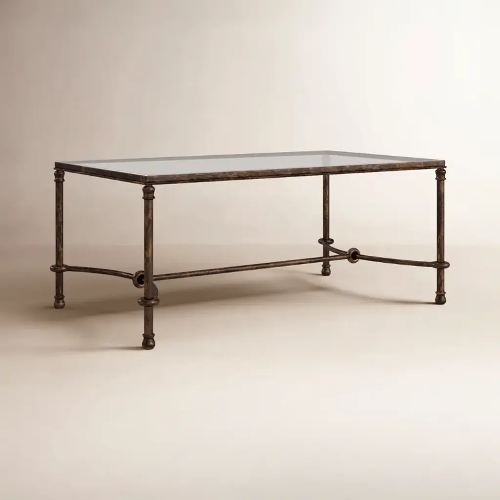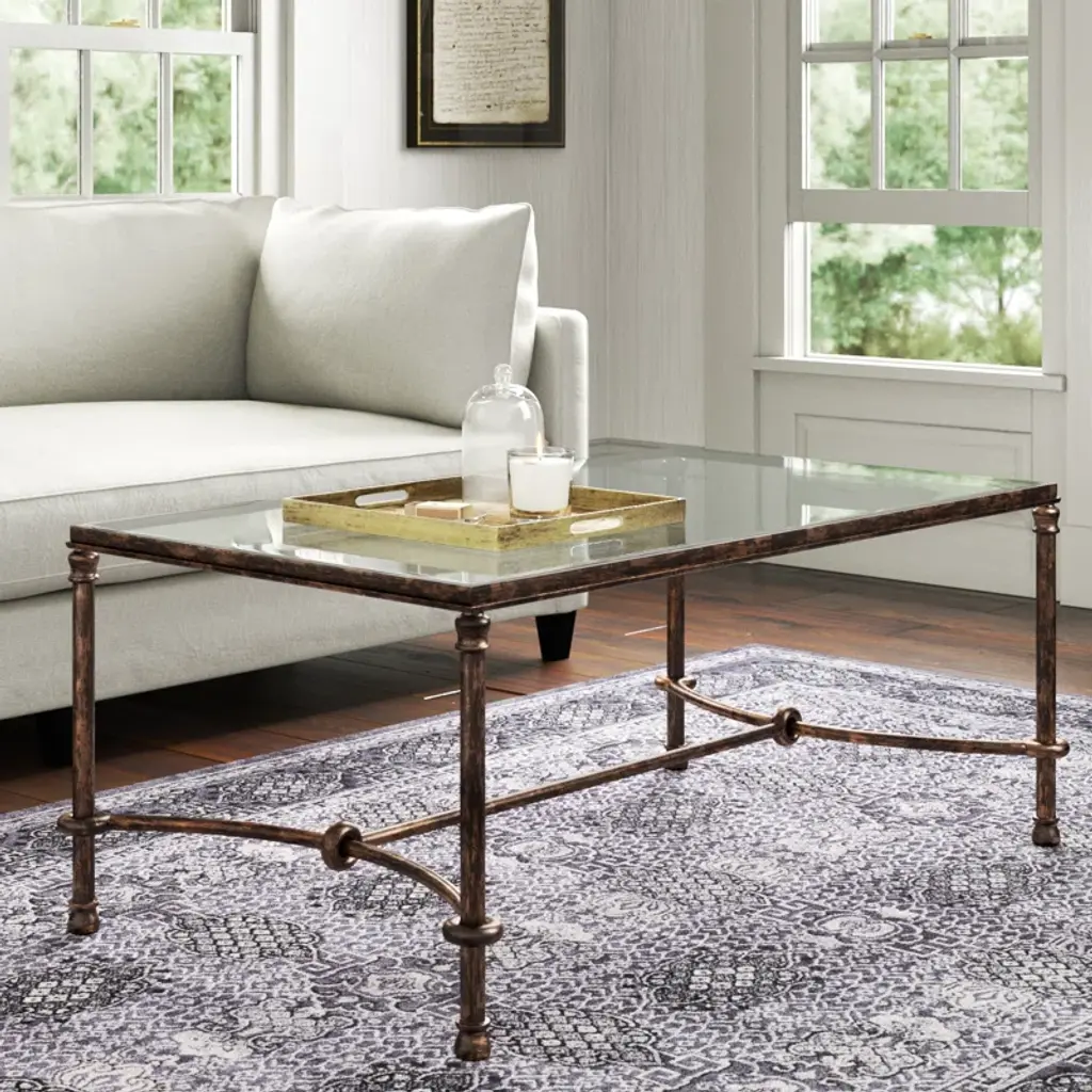 This wrought iron coffee table is a delightful addition to any living room, offering a sleek and modern touch. With a tempered glass top, it's not only elegant but also easy to clean and maintain. The four-legged base adds a hint of sophistication without compromising on style. Though it doesn't have wheels or shelves, its 30 lb. weight capacity ensures it can hold your favorite books, magazines, and decorative pieces. Enjoy the refined look of this coffee table, designed for residential use and ready to elevate your space.