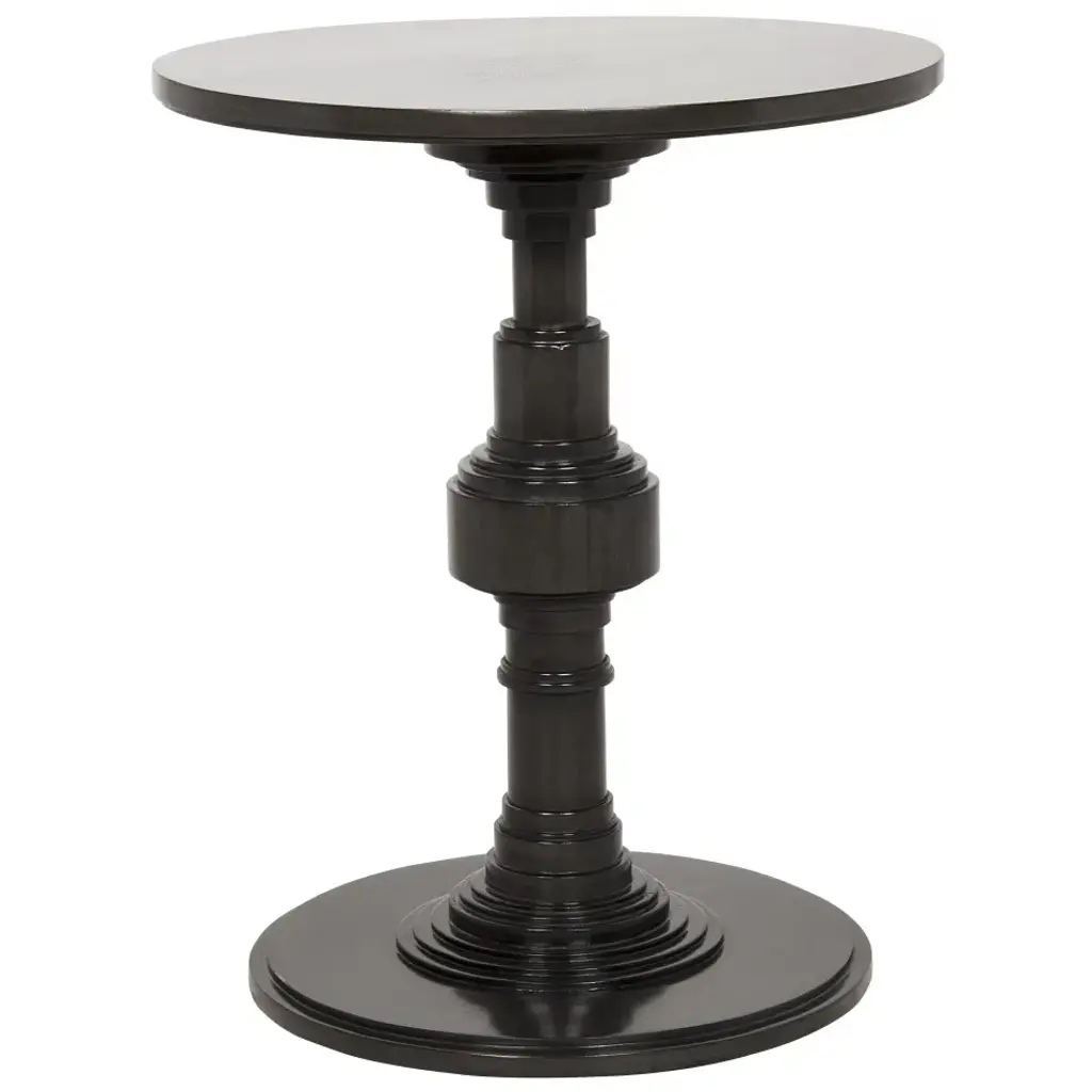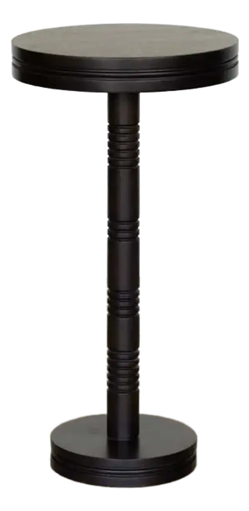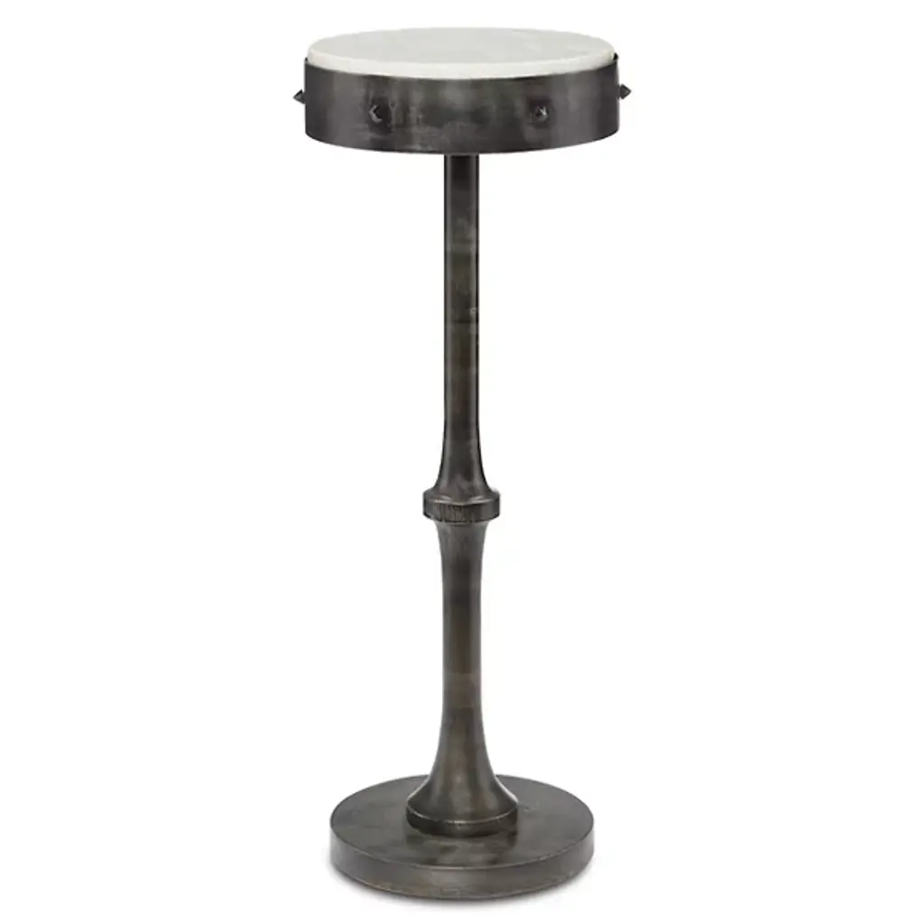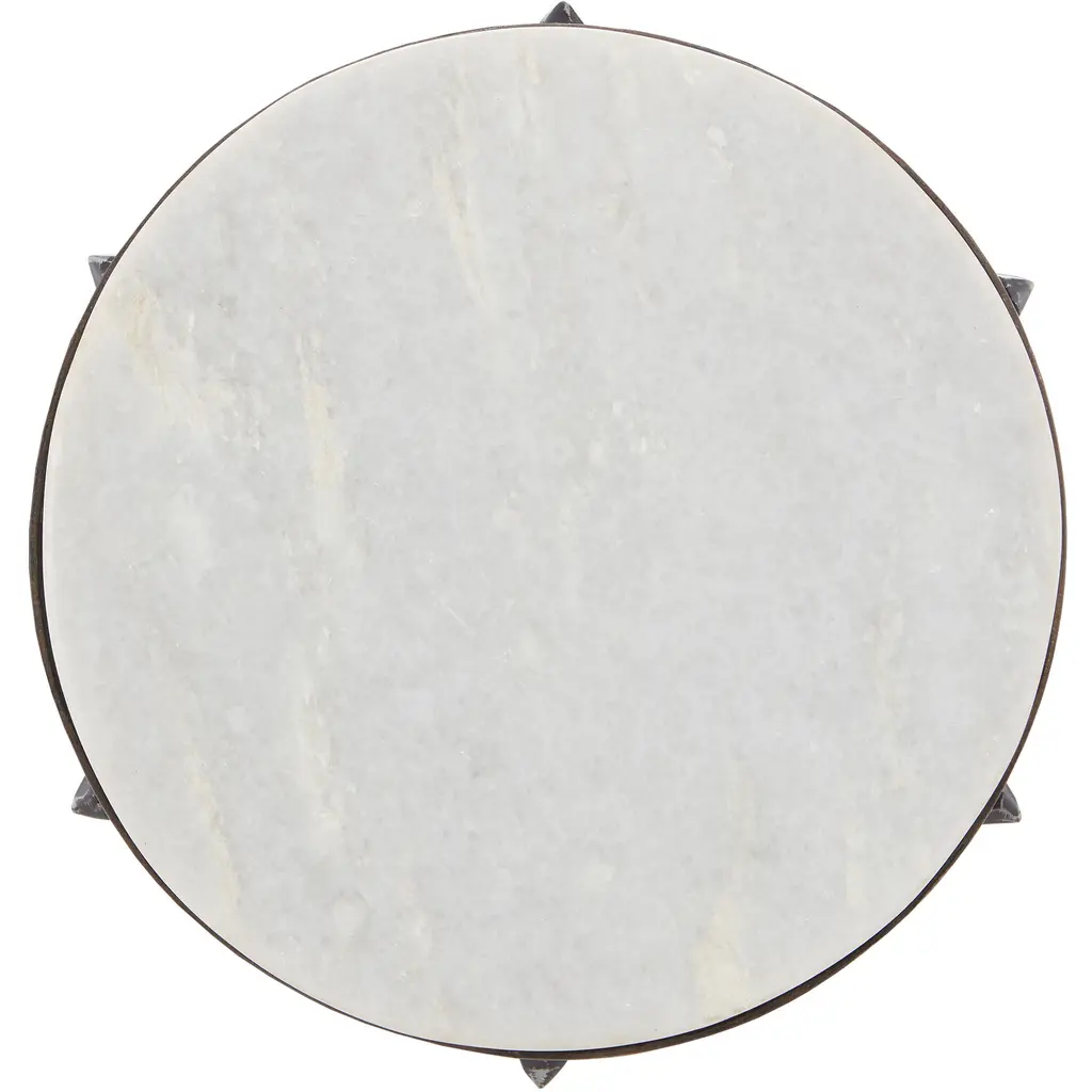 With a hint of industrial style, the Helios Drinks Table is made of iron in an antique black finish that brings the base, stem, and rim on the tabletop added patina. The design details are geometric—the fluted bulge on the stem and trumpet shape where it meets the base. The spikes on the top surround are reminiscent of medieval armory. We’ve topped the metal drinks table with a disc of white marble for a nice contrast, the black/white interplay a staple in modern farmhouse style.