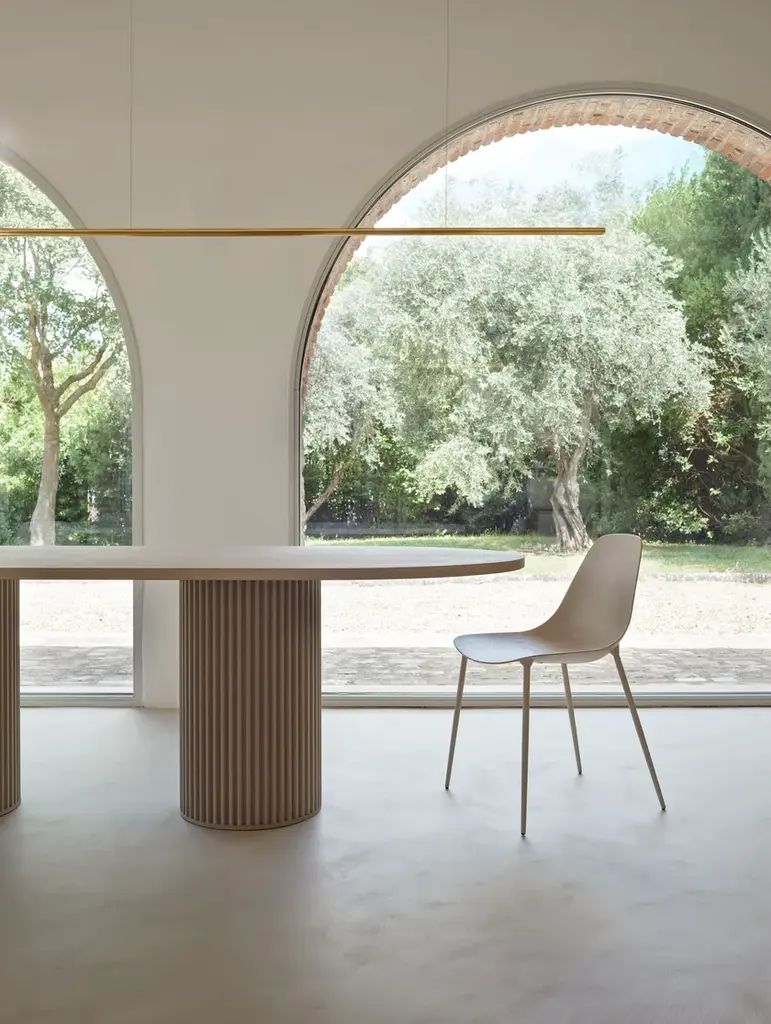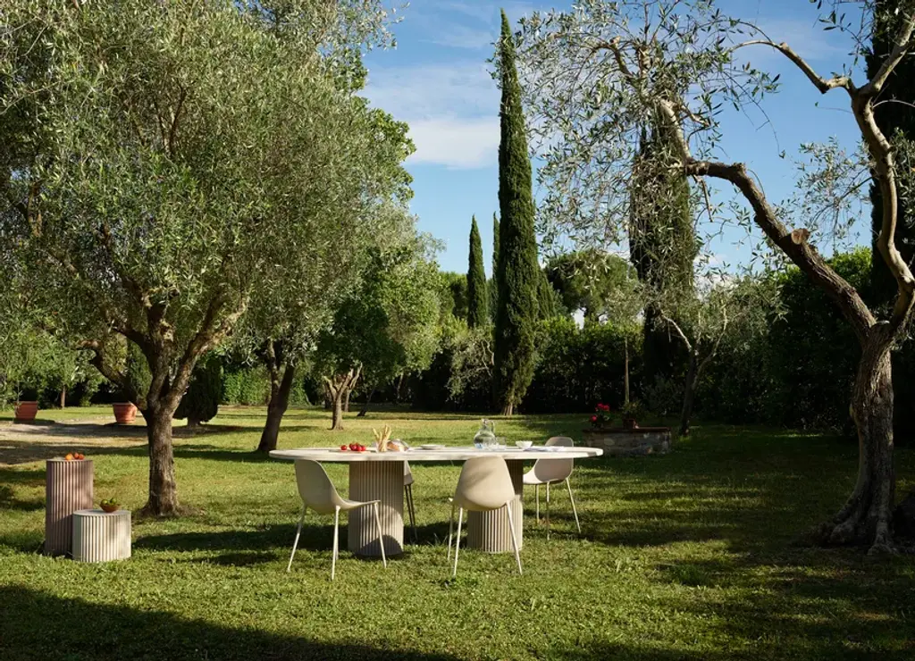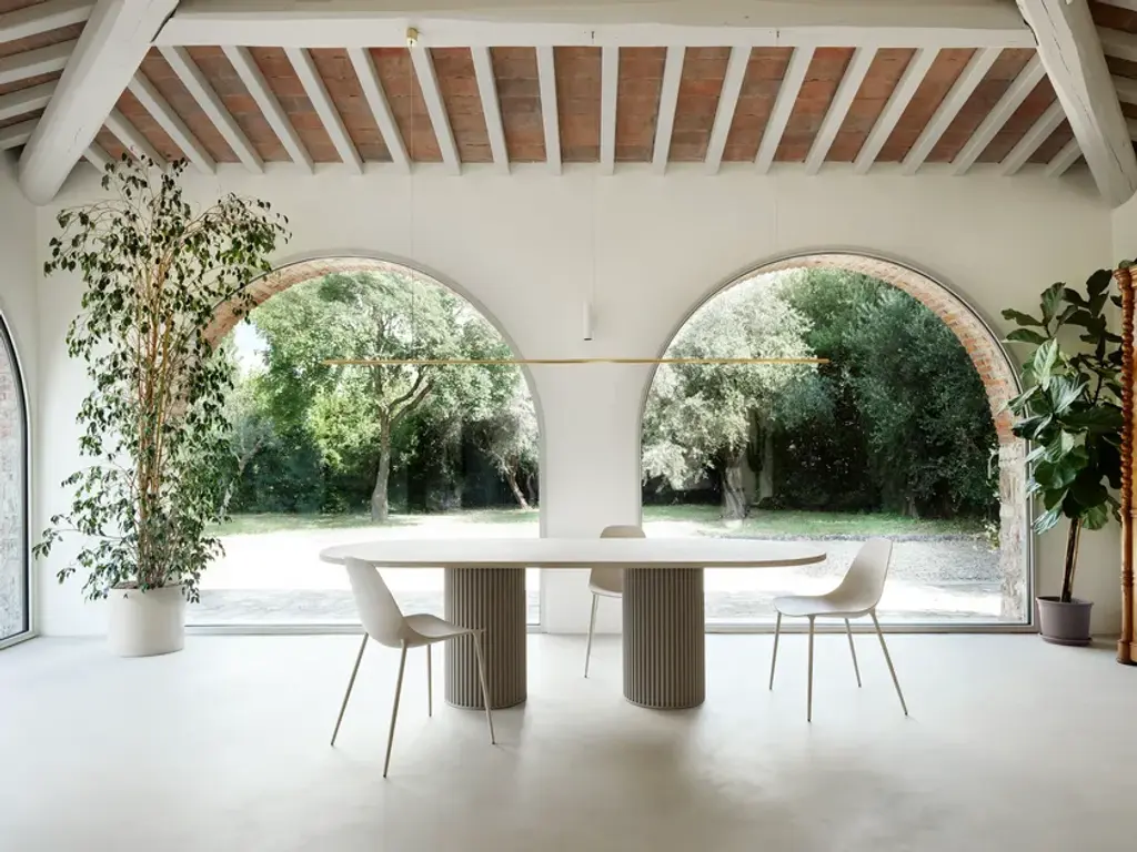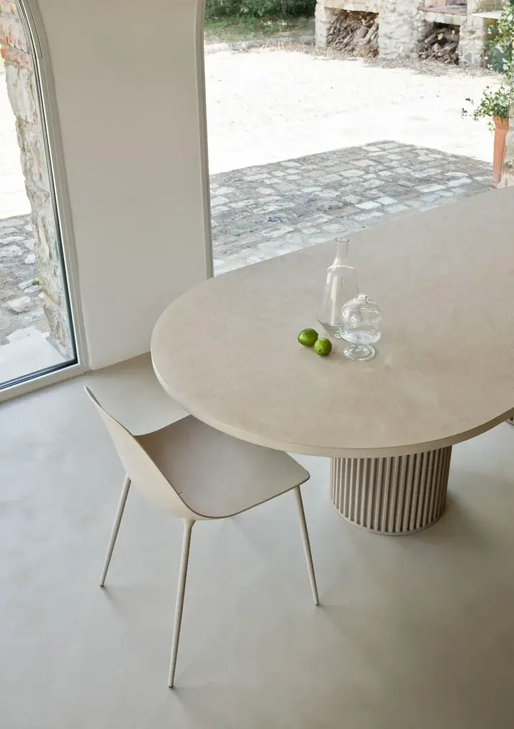 Hercle is an aluminium table with double base, for indoor and outdoor use.Material finishes: Corkcrete in beige, grey or taupe.Matt finishes: White RAL classic 9016.Glossy finishes: gold leaf (indoor use)Corkcrete is a special ecological mortar resulting from a combination of cork and water-based natural resins.The application of the Corkcrete and gold leaf finish is handcrafted, each piece is therefore unique with variations in finish.Hercle, the collection of tables designed by Lapo Ciatti for the Salone del Mobile 2024, was created with the intention of combining, in an object of everyday use, the timeless charm of ancient Greece with avant-garde materials, the result of our attention to sustainability issues.While the typical fluted column is a distinguishing feature becoming a solid base, the special cork finish that covers the surfaces is evidence of the commitment to environmental protection.A symbol in classical architecture of stability, power, order and harmony, the column is also closely linked to the myth of Heracles, the demigod son of Zeus celebrated for his strength, courage and determination. In one of his '12 labours', when he reached the slopes of the mountains that marked the boundary of the then known Earth, he erected two columns to indicate to mortals the limit beyond which they should not go. In another, he replaces Atlas, shouldering the incredible weight of the world, just as a column supports the lintel above.With the Hercle collection – the Etruscan variant of Heracles chosen to honour Opinion Ciatti's Tuscan roots – the myths and symbols of Greek columns are revived in a functional key. The aluminium structure reflects the strength and durability of ancient columns; its design evokes the elegance and harmony of classical architecture; finally, like the Greek hero, the table of the same name defies gravity by supporting large cantilevered tops with a central column (single or double depending on the size of the top).