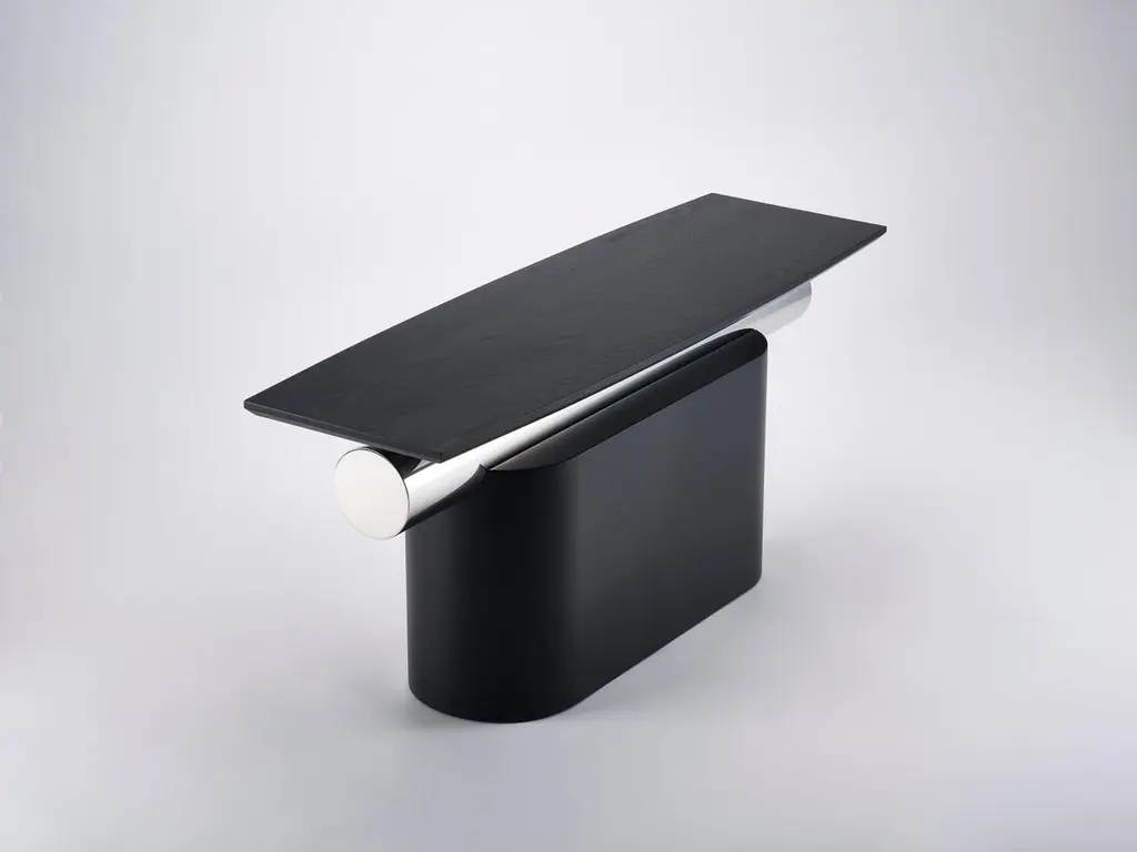 Heritage Layer Curve Table by Lee Jung HoonDimensions: D 34 x W 104.5 x H 45.1 cmMaterials: Steel, Ash, Stainless Steel.The Heritage series, created by designer Lee Jung-hoon is a collection of sculptural modern furniture. The designs are inspired by the characteristic forms, colours and appearance of traditional Korean architecture. Borrowing references from the archaic Hanok, which is the traditional Korean housing, the designer has attempted to reinterpret its beauty and vibe from a contemporary perspective.Lee Jung-hoon is a Korean craft and furniture designer who essentially draws inspiration from Korean heritage to create contemporary sculptural pieces that embody latent symbolism and double as practically usable objects.Tradition is a gene-like thing, which goes through evolution and degradation with the times. Although it is now a turbulent time in tradition,The unique gemstones inside of it remain unchanged. he wants to discover and explore these stones to find the formation thatEncompasses tradition and modern times.He is working on finding new types of furniture and decorations under the theme of Korean tradition, and at the same time wants to designThe furniture that society needs today.