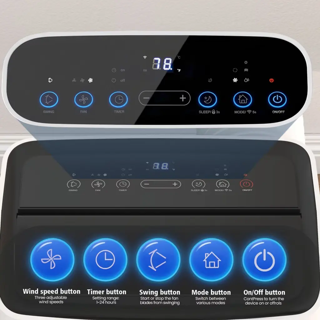 Heynemo portable air conditioner delivers powerful 14,000 BTU cooling and 11,000 BTU heating, offering four modes¡ªcooling, heating, dehumidifying, and fan¡ªwith three fan speeds to meet year-round climate needs. Operating as quietly as 54 dB, it features a sleep mode that automatically adjusts fan speed and temperature for a peaceful night¡¯s rest. Equipped with an LED display, touch panel, remote control, and Wi-Fi connectivity, it supports remote control via mobile app and includes auto mode, power-off memory, and a child lock for smart, user-friendly operation. Compact in size (28 ¡Á 17.3 ¡Á 13.2 inches) and easy to move, it's ideal for bedrooms, offices, RVs, and more. The unit comes with a full set of accessories for various window types¡ªready to use out of the box, quick to install, and beginner-friendly with no extra purchases required. Specification: Product Name: portable air conditioner/white Color: White Material: ABS,copper,aluminum,iron Dimensions: 28''(L) x 17.3''(W) x 13.2''(H) Noise Level:54 dB Power: 1490w Pattern: 14,000 BTU