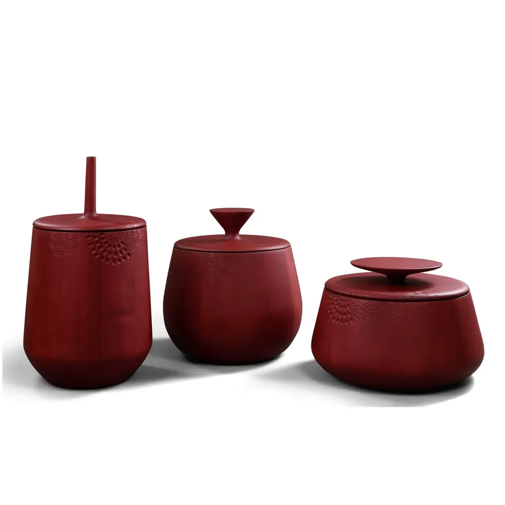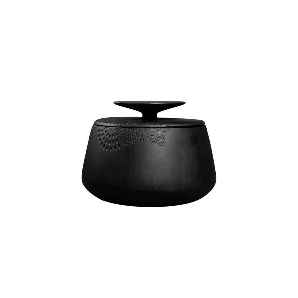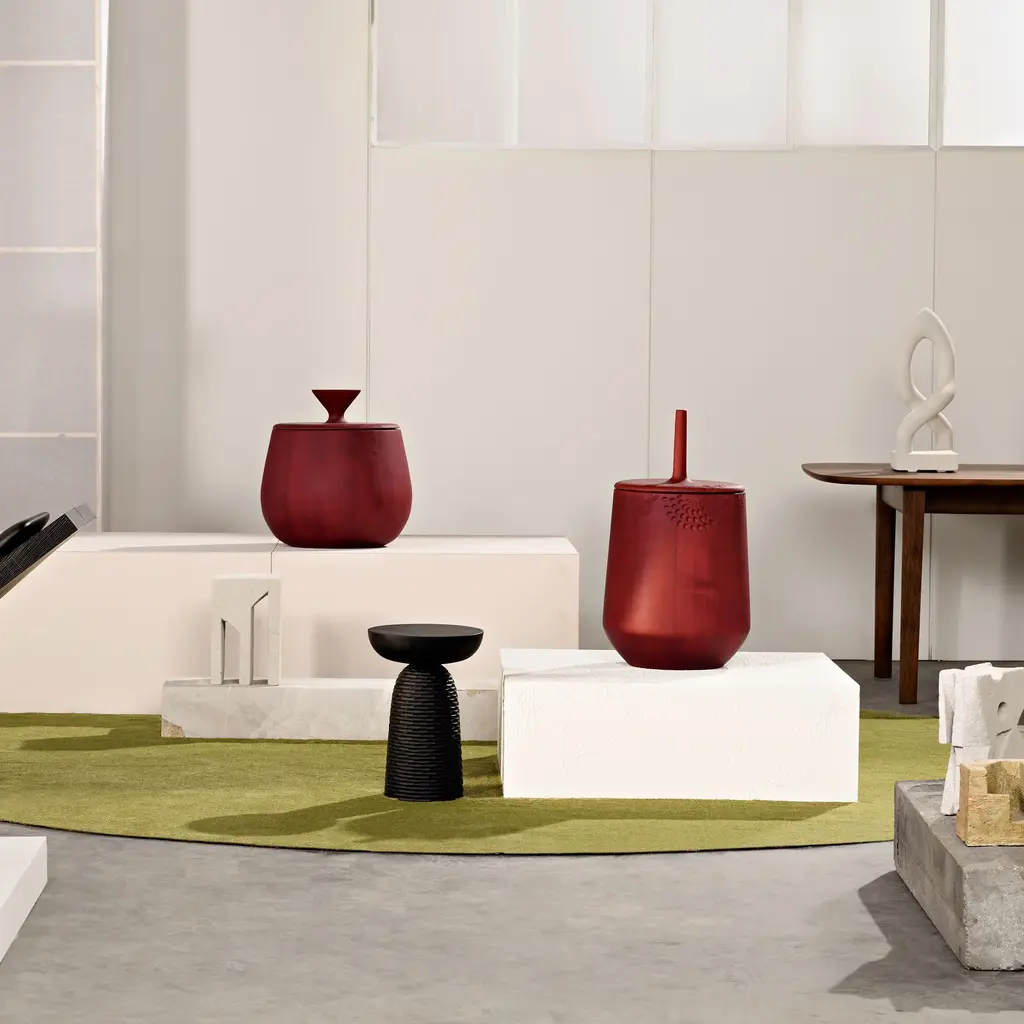 Zanat's extraordinary hand-carved round threesome, entirely made in solid maple, finds use as individual decorative storage containers that can also double as occasional tables. Hide & Seek offers an array of sculpted patterns as envisioned by the series' Swedish designer Monica Förster. With a choice of matte lacquer finishes in black, burgundy or wenge stain, the wood for production comes from sustainably managed forests and the Bosnian brand plants 3 new trees for each one used.