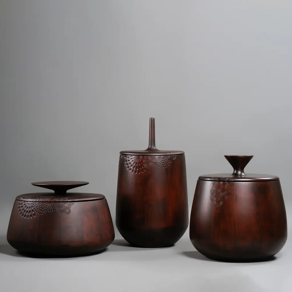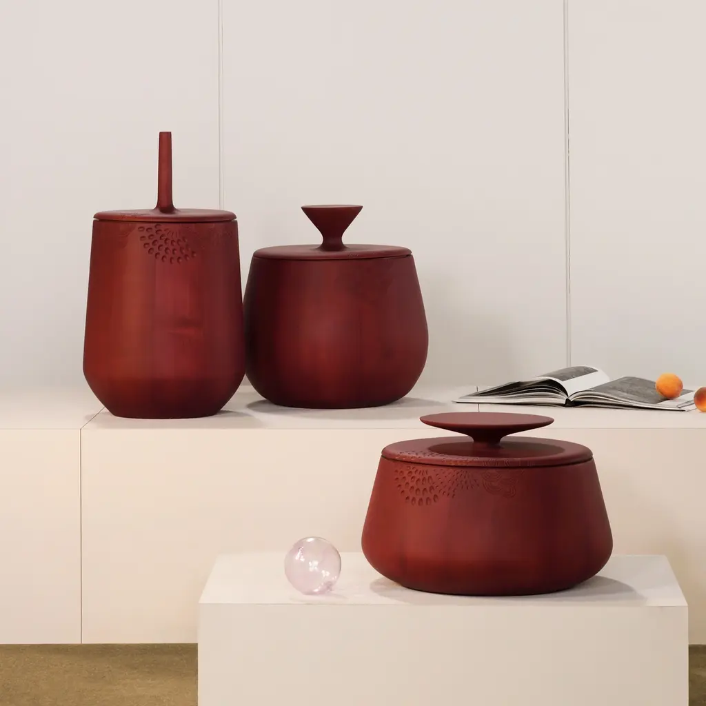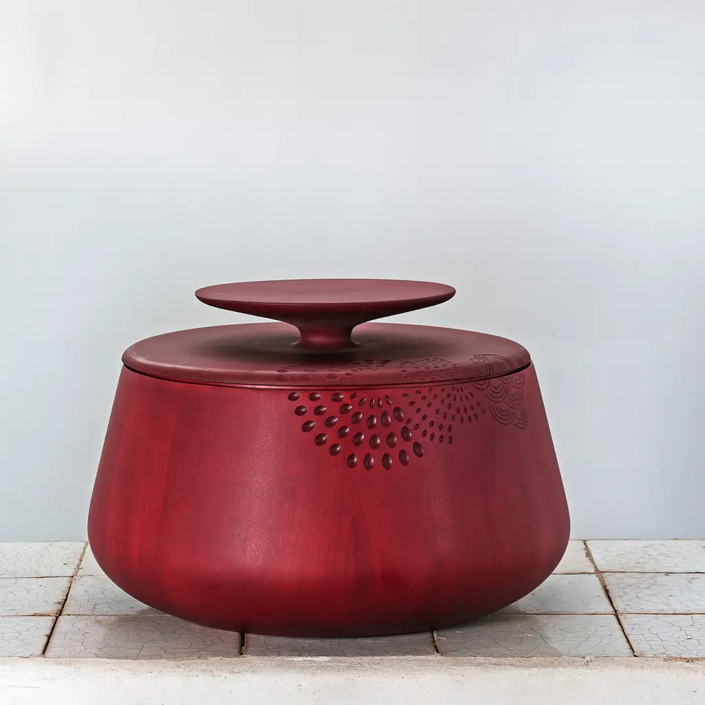 Zanat's extraordinary hand-carved round threesome, entirely made in solid maple, finds use as individual decorative storage containers that can also double as occasional tables. Hide & Seek offers an array of sculpted patterns as envisioned by the series' Swedish designer Monica Förster. With a choice of matte lacquer finishes in black, burgundy or wenge stain, the wood for production comes from sustainably managed forests and the Bosnian brand plants 3 new trees for each one used.