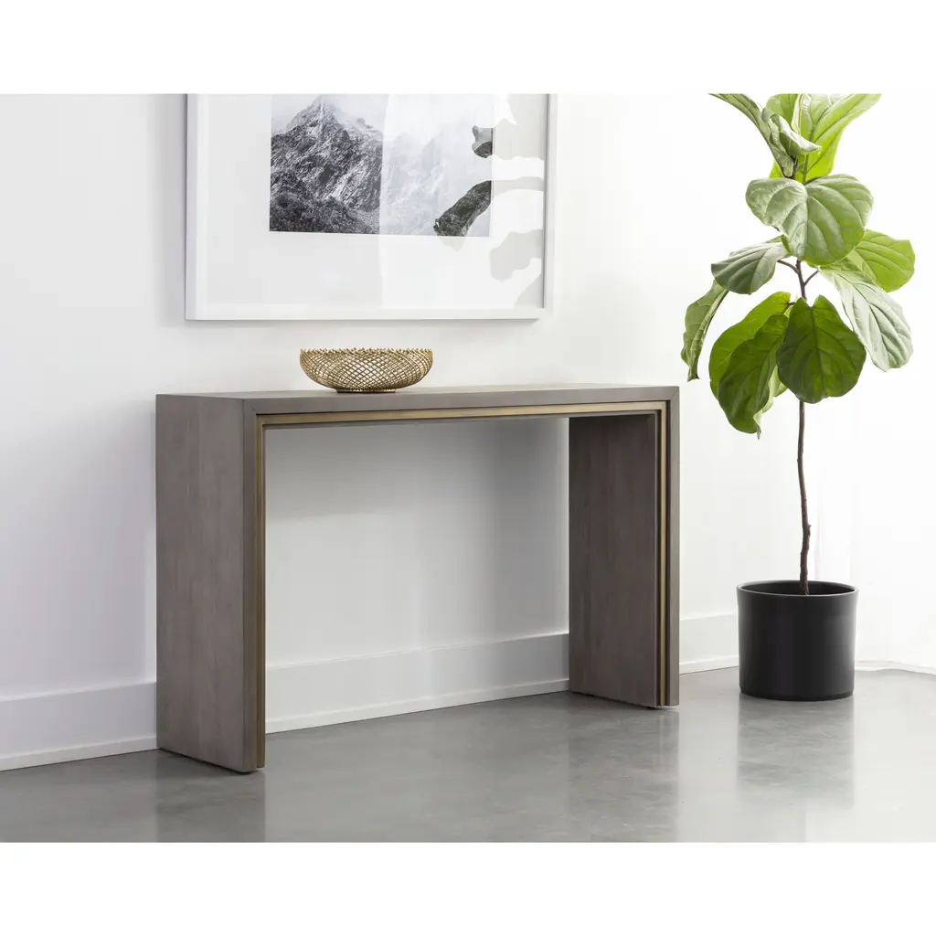 The Hilbert Console Table is grounded in a functional modern design. Crafted from grey acacia wood, this console table features a sharp linear silhouette. A brass iron trim on the front and the back of the piece provides added dimension and intrigue to the overall look. AsÂwoodÂis an organic, porous material, these pieces will contain natural variations of texture and may also exhibit fine indentations and cracks. Wood pieces will also display a disparity of colour and grain, and visible knots and burls that add to the character of each piece. Made in India. With refined craftsmanship, this design was brought to life by skilled local artisans. Due to the nature of handcraftsmanship, unique imperfections such as fissures, markings and variations in colour and shape are welcomed and appreciated characteristics for a truly one-of-a-kind piece.
