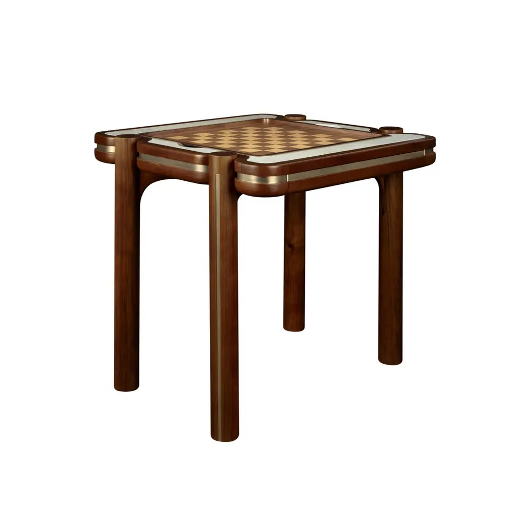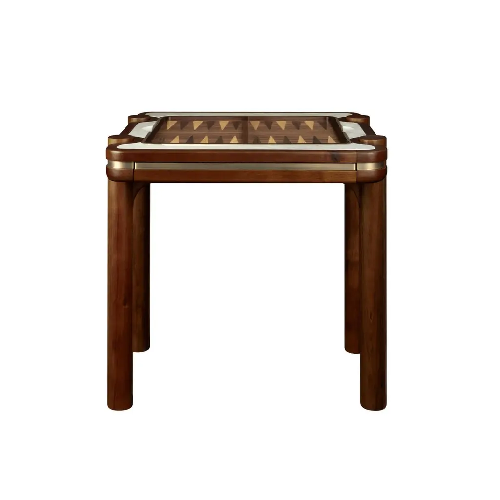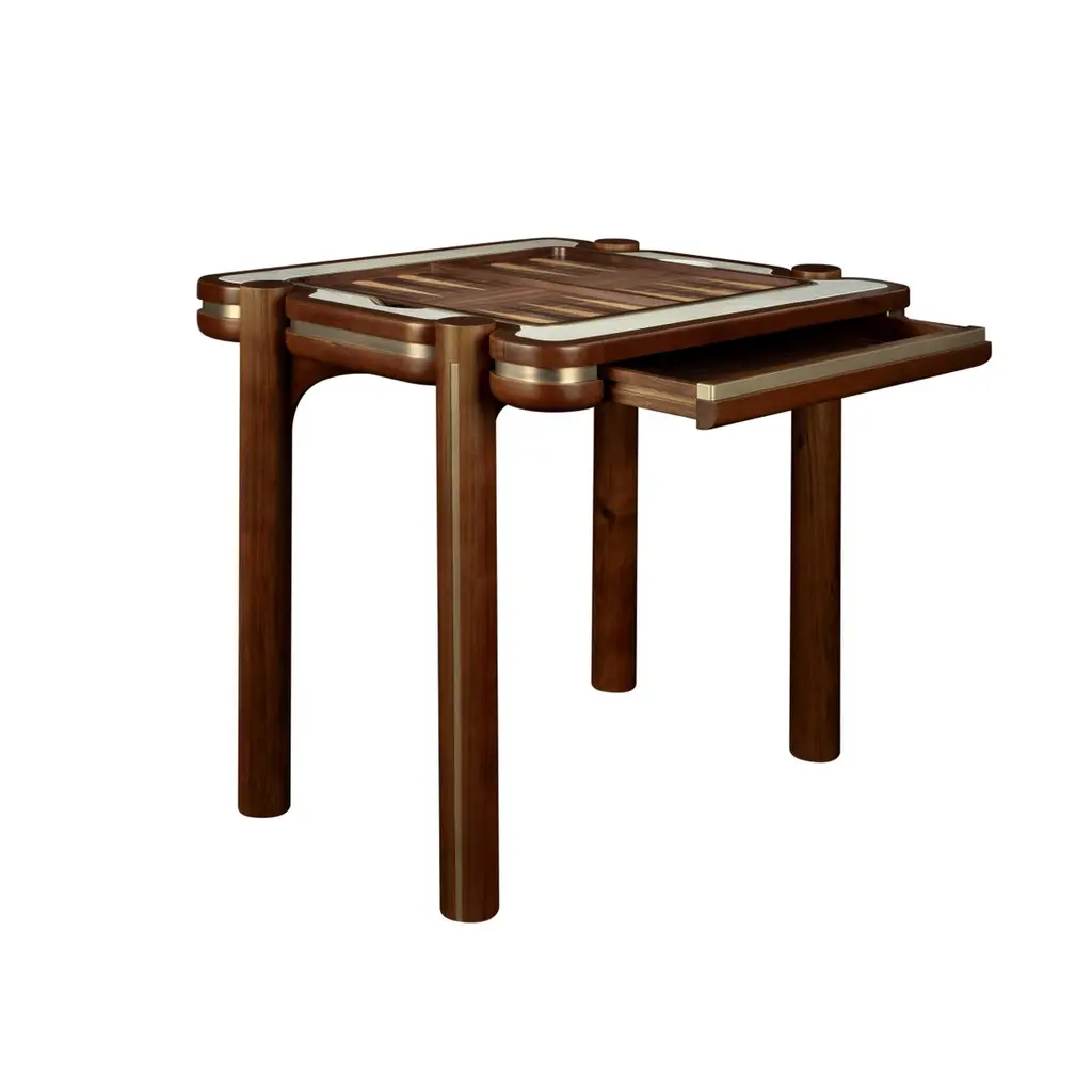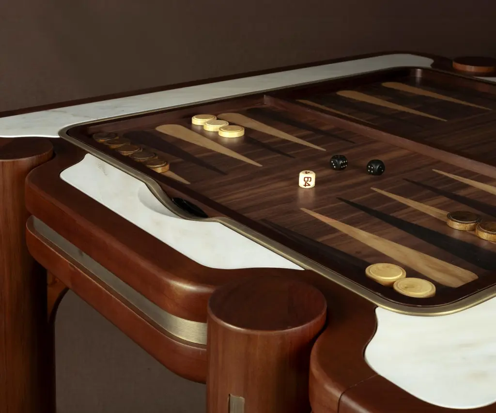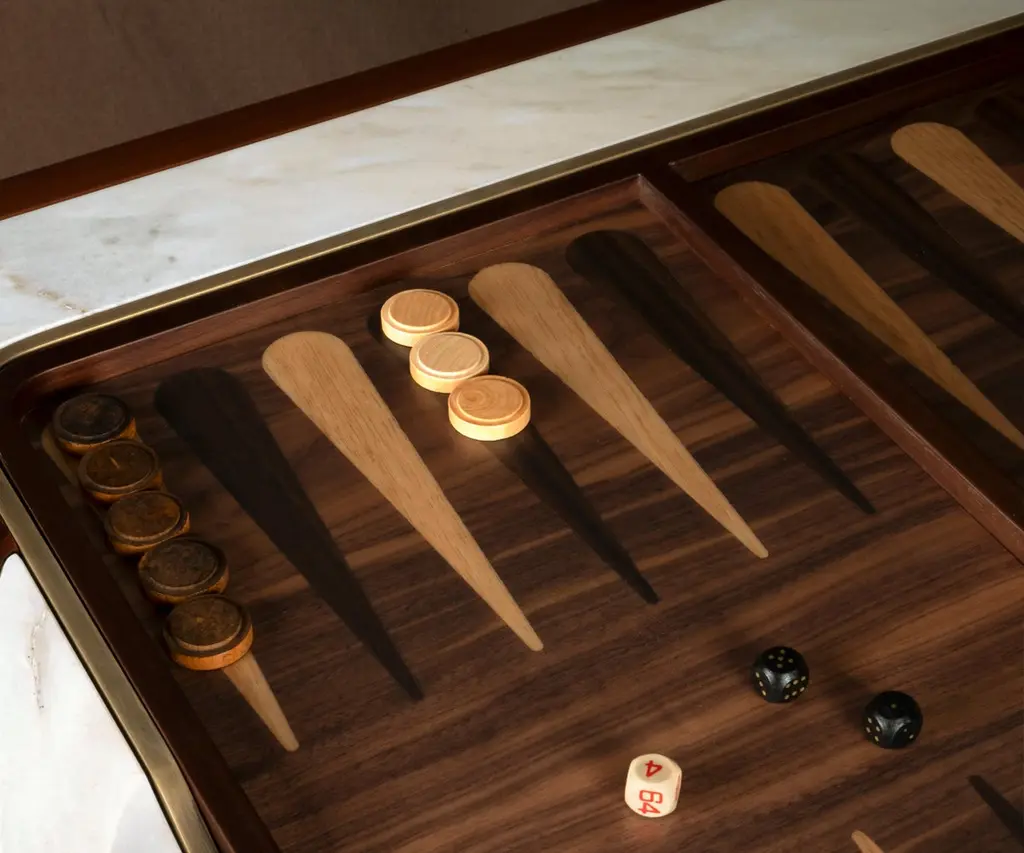 Although the earliest known mention of Backgammon was in a letter dated 1635 when it was emerging as a variant of the popular medieval Anglo-Scottish game, it is one of the most popular board games. Tributing the first world backgammon champion, Tim Holland, Wood Tailors Club designers conceived this exquisite game table. Marble-wrapped edges top and wood surface flips to reveal a marquetry wood table top perfect for playing Backgammon, featuring two drawers to store the pieces.The Holland playful furnishing can bring added deluxe to a space while entertaining your guests. Its function can vary: while it can be an elegant surface for cocktails or snacks, it can also be an informal meeting place after dinner.Note: Backgammon checkers are not included.