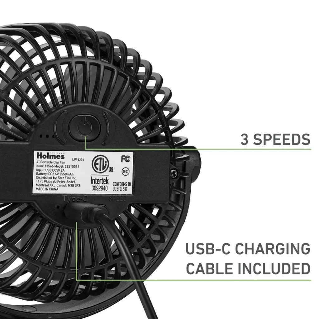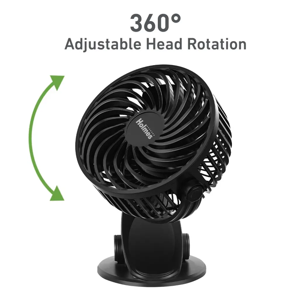 Holmes 4" On-the-go Portable Clip Rechargeable Battery 360° Rotation Fan Black