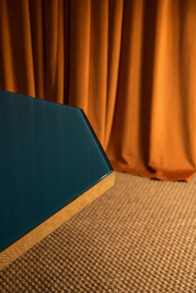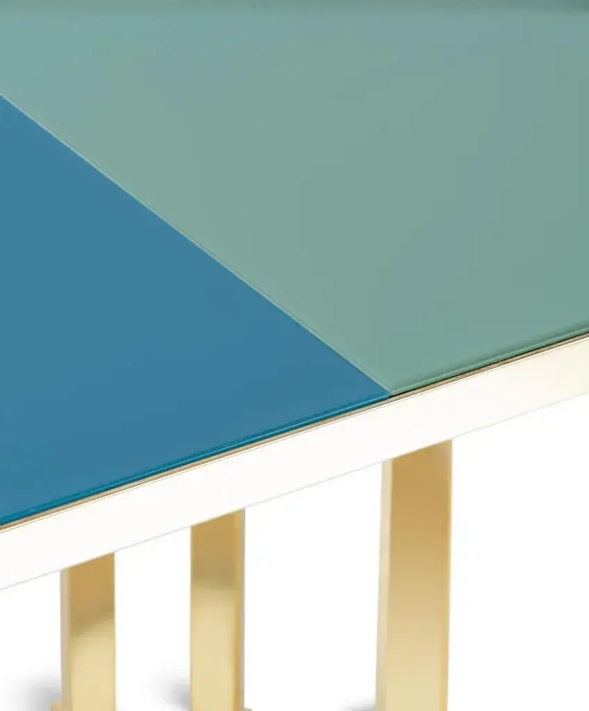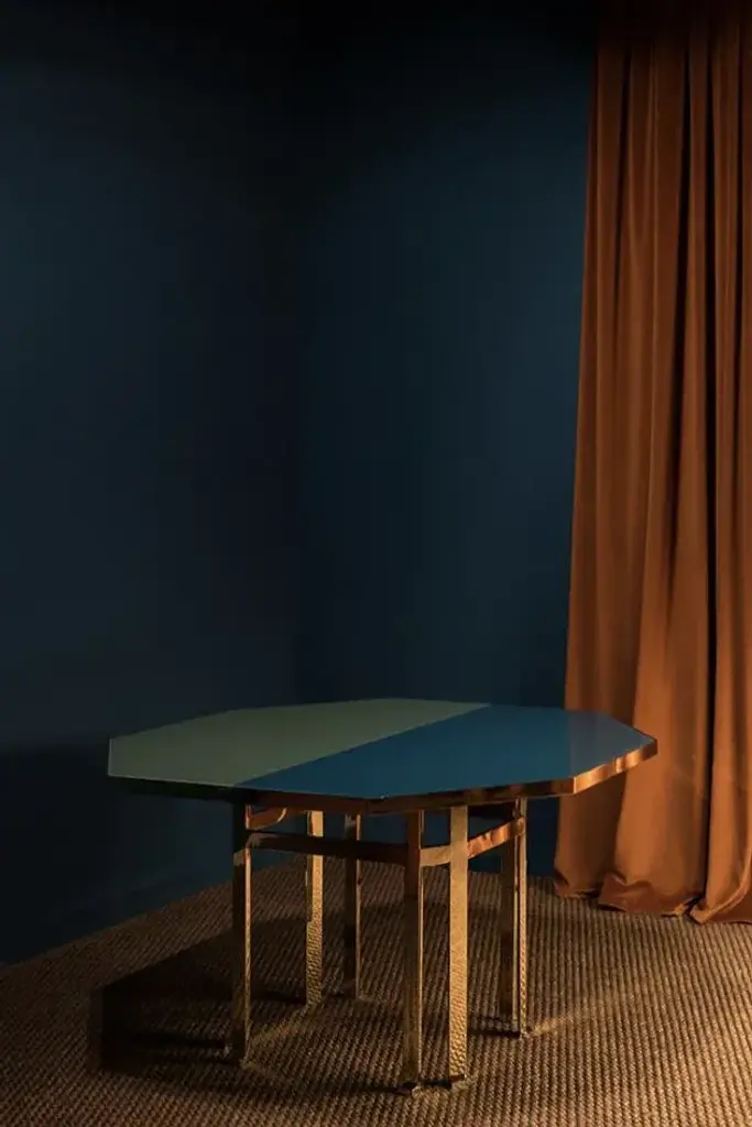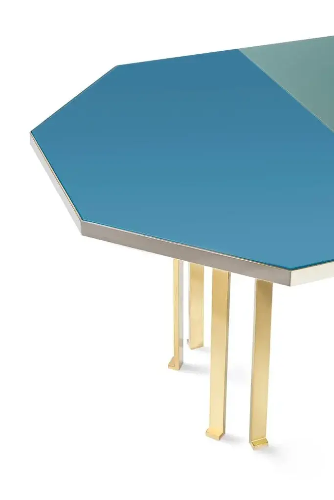 COLOURS Mint + Nude Ocean + Moss Lichen + Sulfur Designed by Filippo Feroldi for Purho and Colleoni, Holo 130 is characterized by small dimensions and by an octagonal brass structure surmounted by a sheet of glass back-coloured in two different shades which in turn rests on a base in black lacquered wood. The volumes, the technical details, the study of colour and the craftsmanship with which it is made make Holo 130 a precious, unique complement, masterfully balanced between the history of design and contemporaneity, capable of giving personality to the environments in which it is inserted. The top proposed in selected colour combinations can be customized on request. Labeled by Maker
